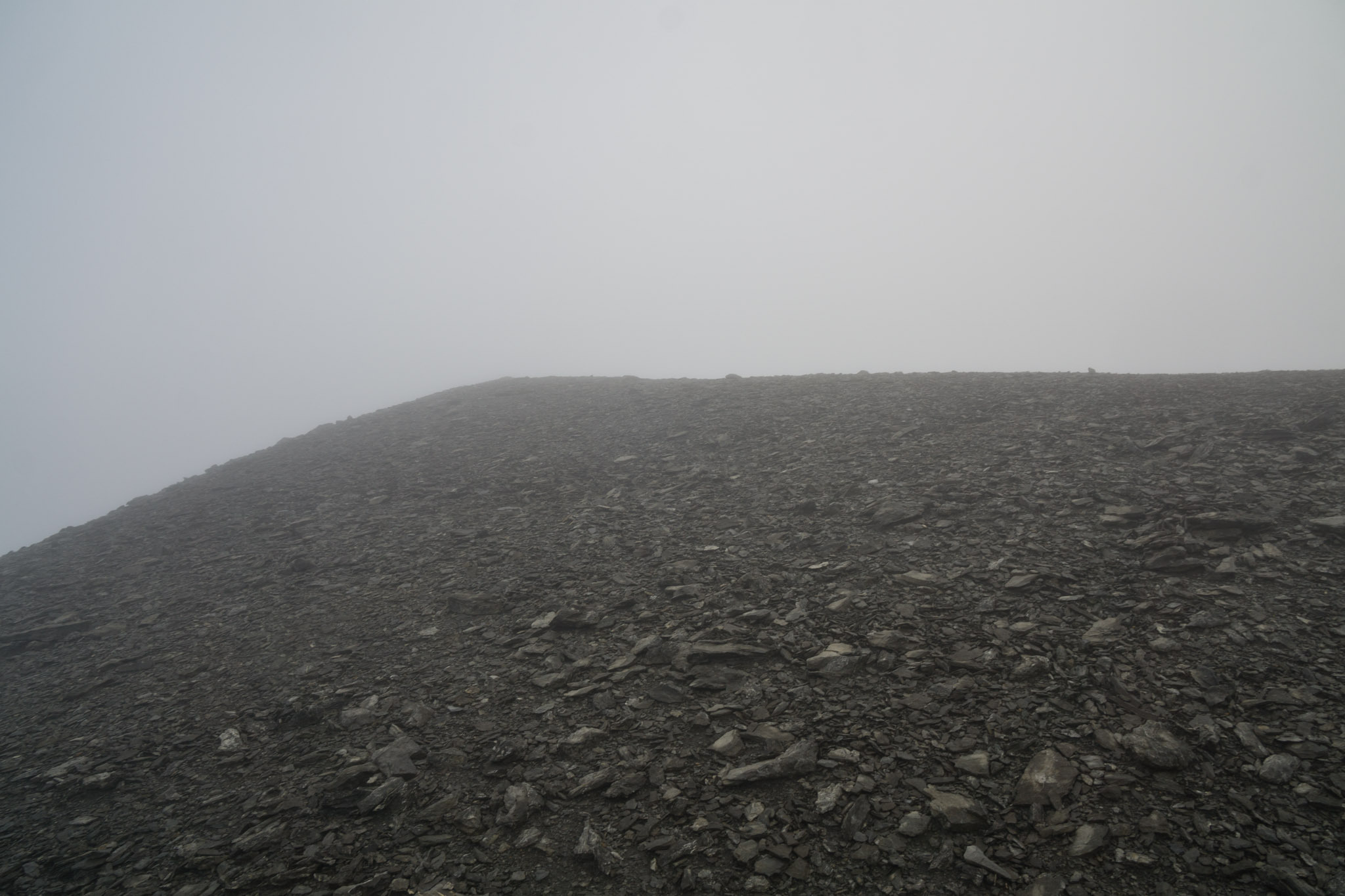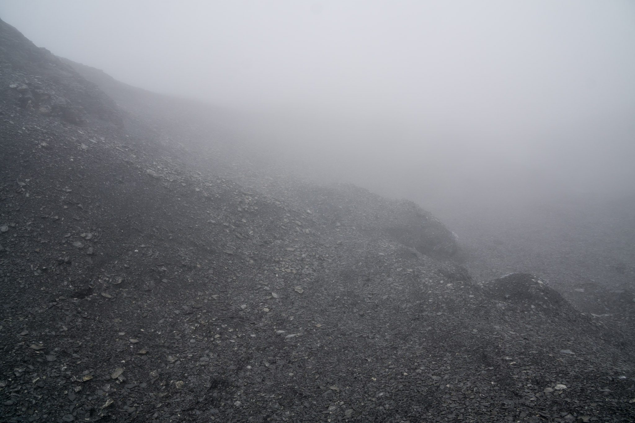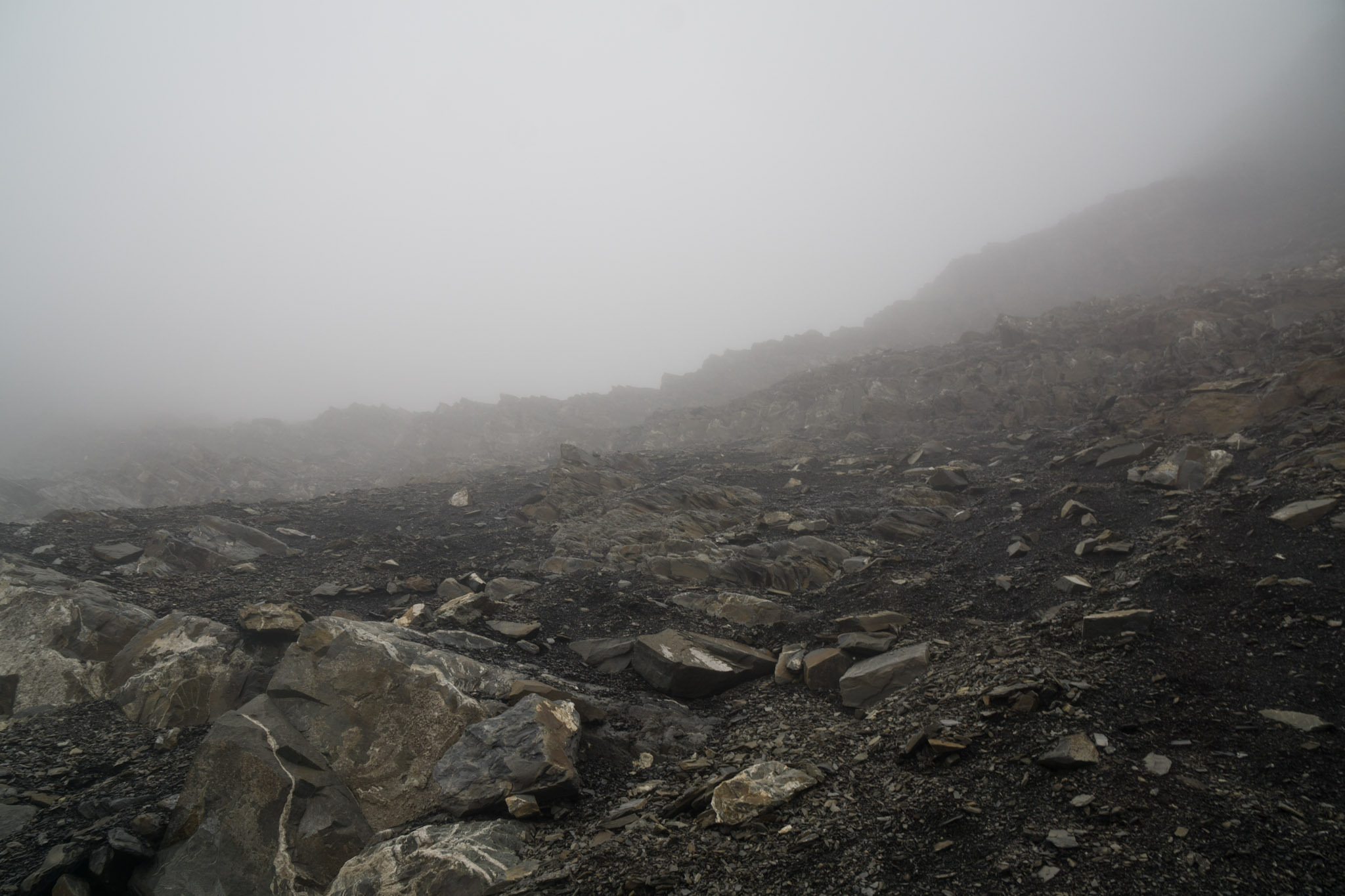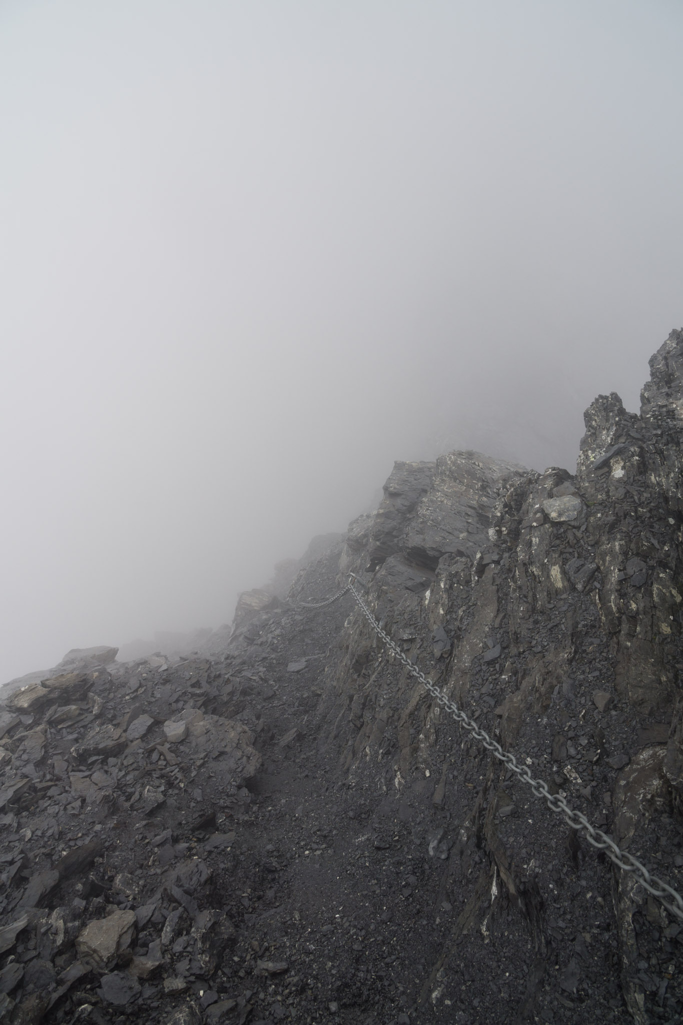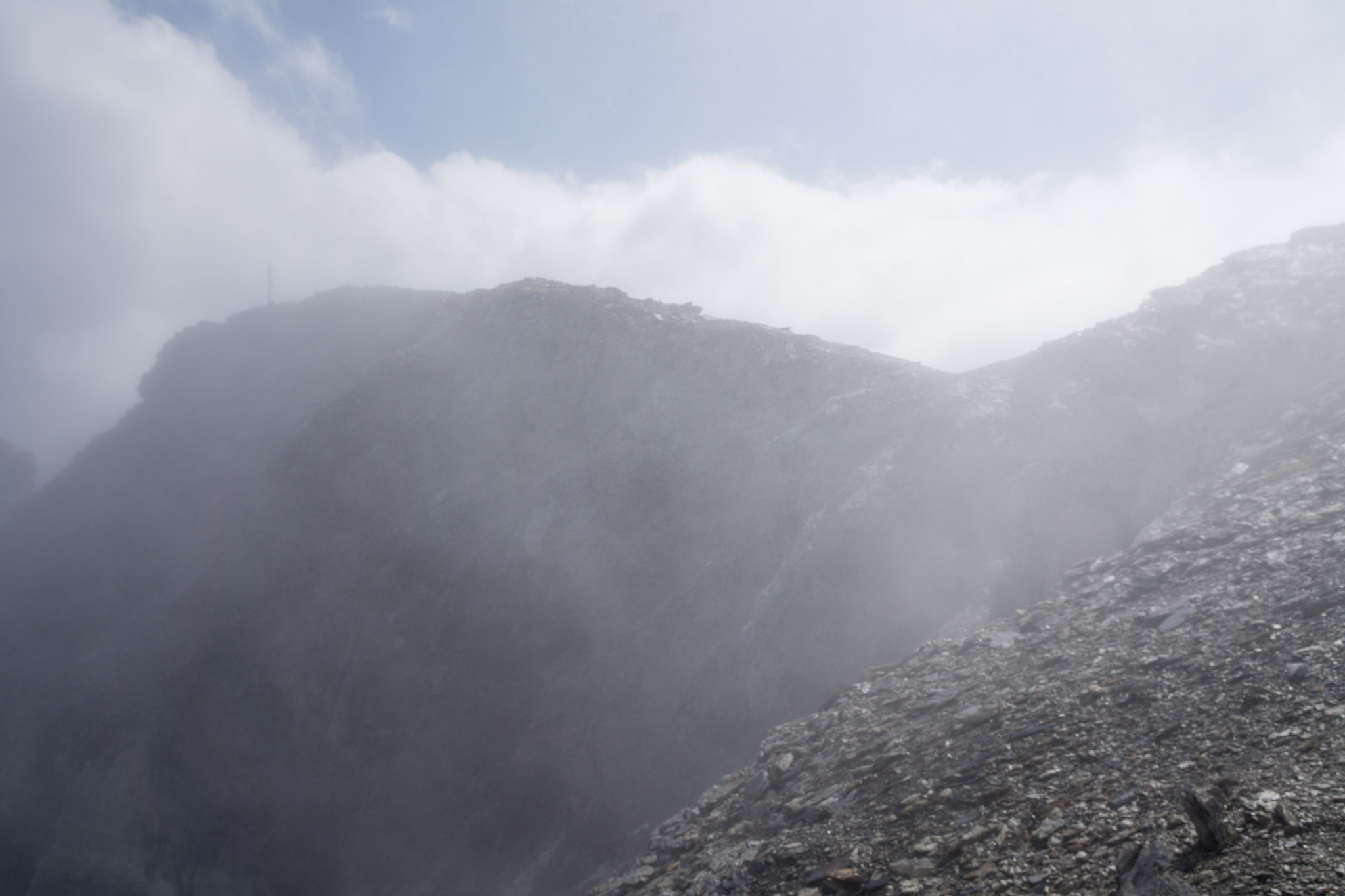 Es folgen in Abwechlsung danach mehrere Schutt- und Kletterabschnitte. An einem Aufschwung biege ich im Nebel falsch ab und gehe nach rechts in die Flanke, Nach etwa 10m Aufstieg (T5, eher T6) sitze ich etwa 3m unterhalb des Grats fest. Von hier könnte ich zwar die letzten Meter den kompakten Felsen hoch (geschätzt III), aber alles ist mit Flechten besetzt. Zu riskant, ein Ausrutscher würde einen Flug die Nordwand runter zur Folge haben. Also alles zurück, dabei sicherheitshalber noch einiges an Geröll im Pfad entsorgt, links um den Fels herum und Tataaaa - nächstes Hindernis. Dieses mal in Form einer etwa 3m hohen Platte mit einer einzigen Trittmulde im oberen Drittel und etwas an Miniriss am linken Rand. Hier müssen die Stöcke dann doch an den Rucksack, und etwas Ganzkörperkletterei (Mit Zunge auf Reibung, trocken II) bin ich oben und mir sicher: es geht nur nach oben weiter. Nasse Platte im Abstieg ist nicht so meins.