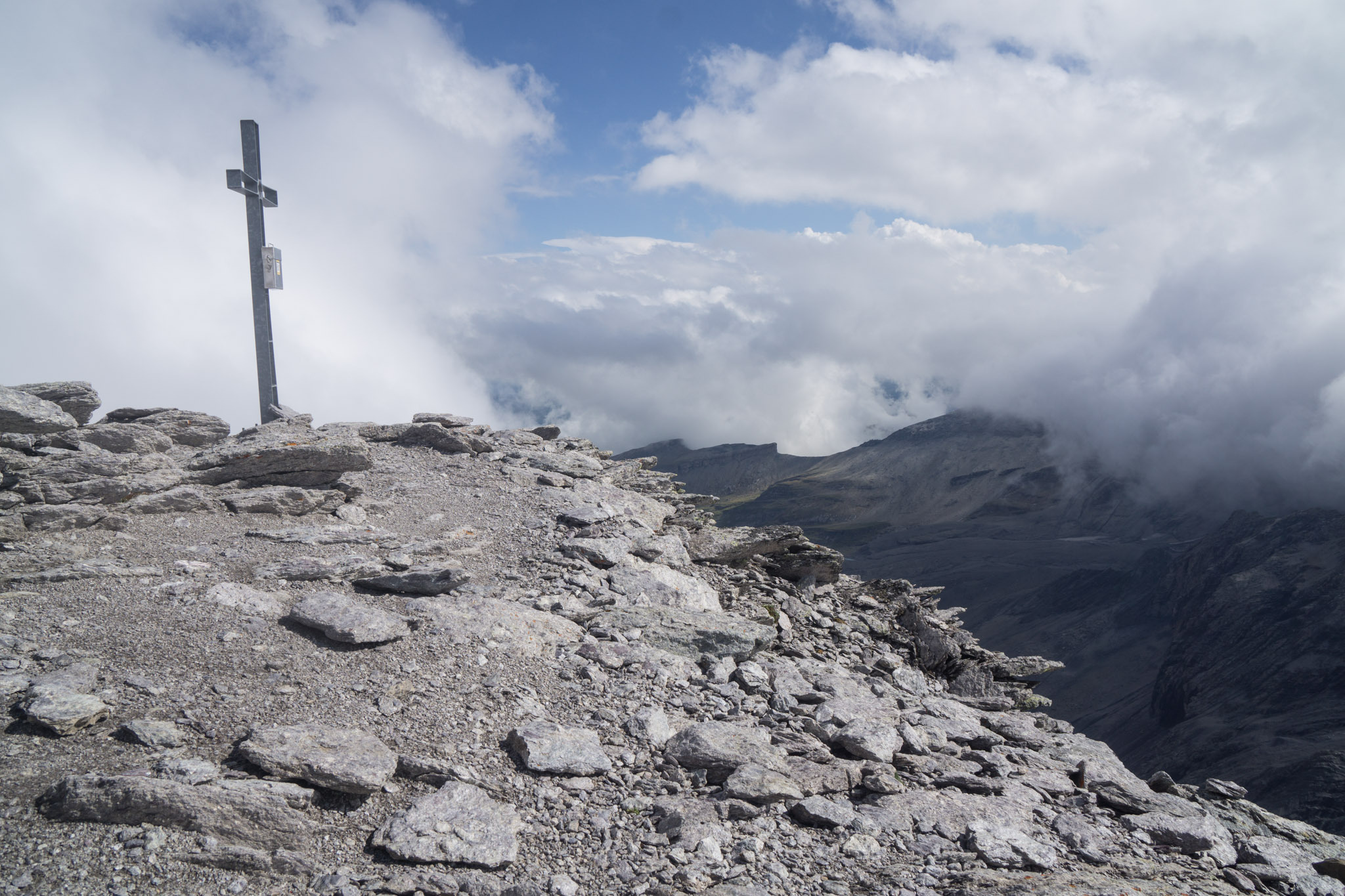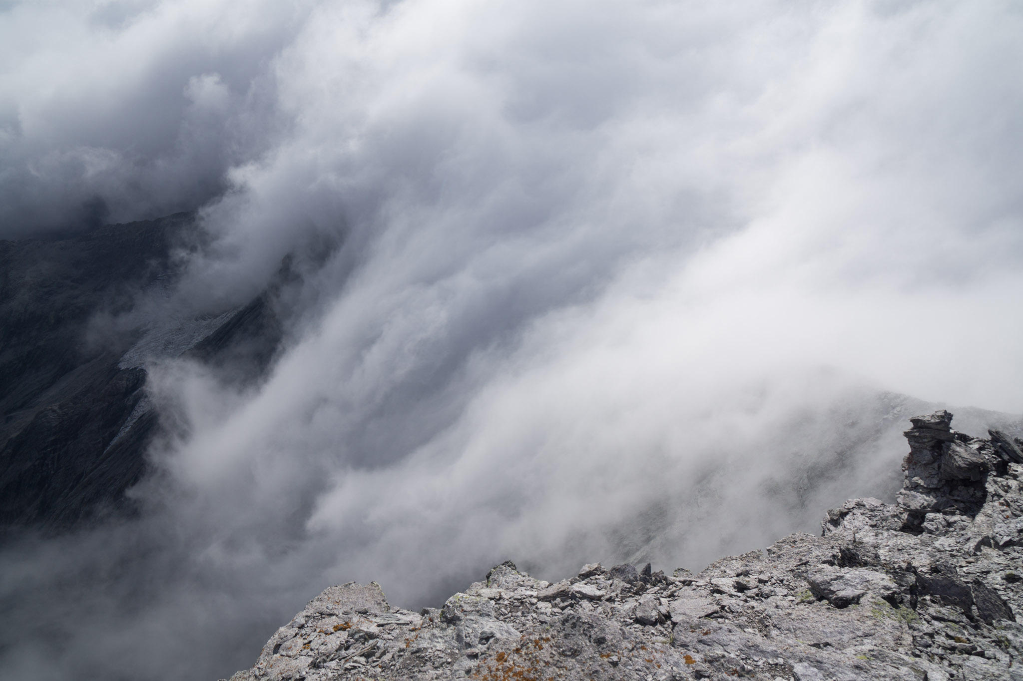 Alles bis auf ein kleines Fenster im Süden liegt in Wolken begraben, aber die Wolkenwalze, die sich da zwischen Hausstock und Ruchi über den Grat wälzt, ist beeindruckend und sehr hübsch.