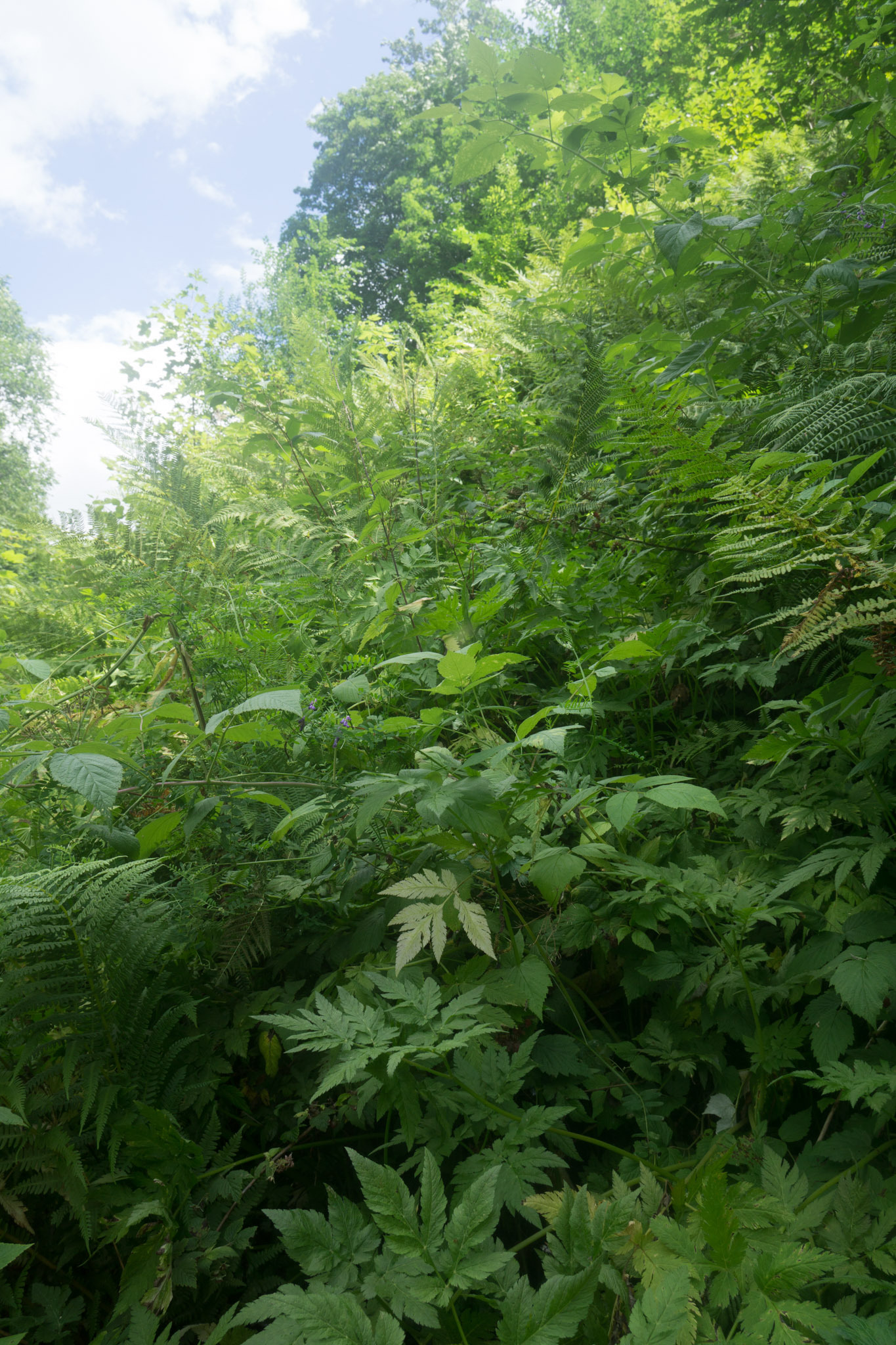 Nach einer ausgiebigen Schlägerei mit Farnen und Brennnesseln meckert mich ein Bauer an, weil ich über seine Weide (mit Wegspuren und alter Markierung) schlappe, aber als ich ihm die Landkarte zeige und meine: "war markiert, so what", gibt er sich zufrieden und ich tucker weiter und wechsel zur Sicherheit auf den offiziellen Weg.
