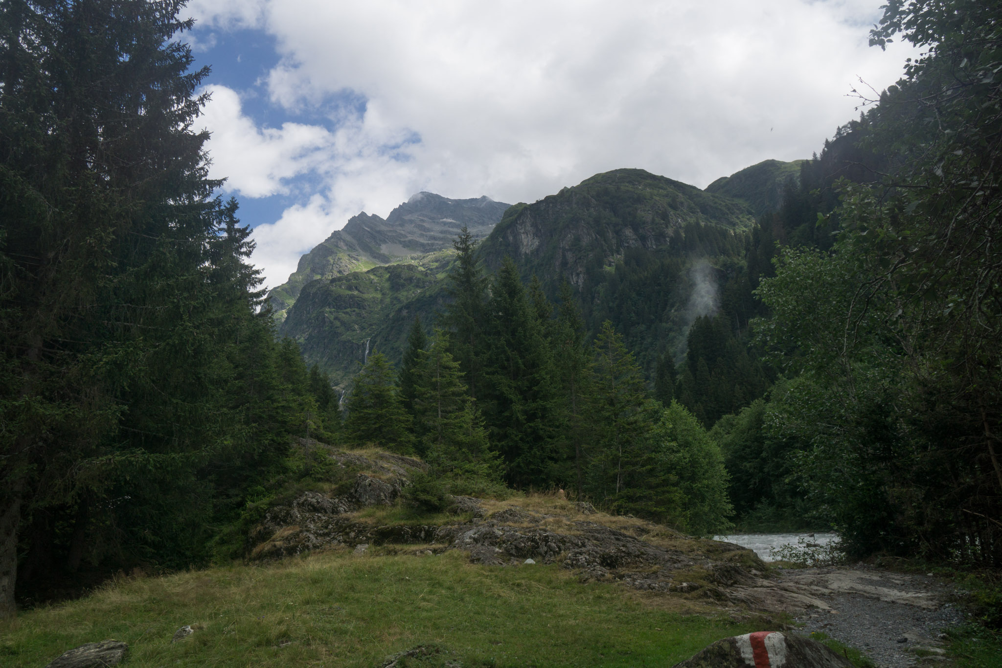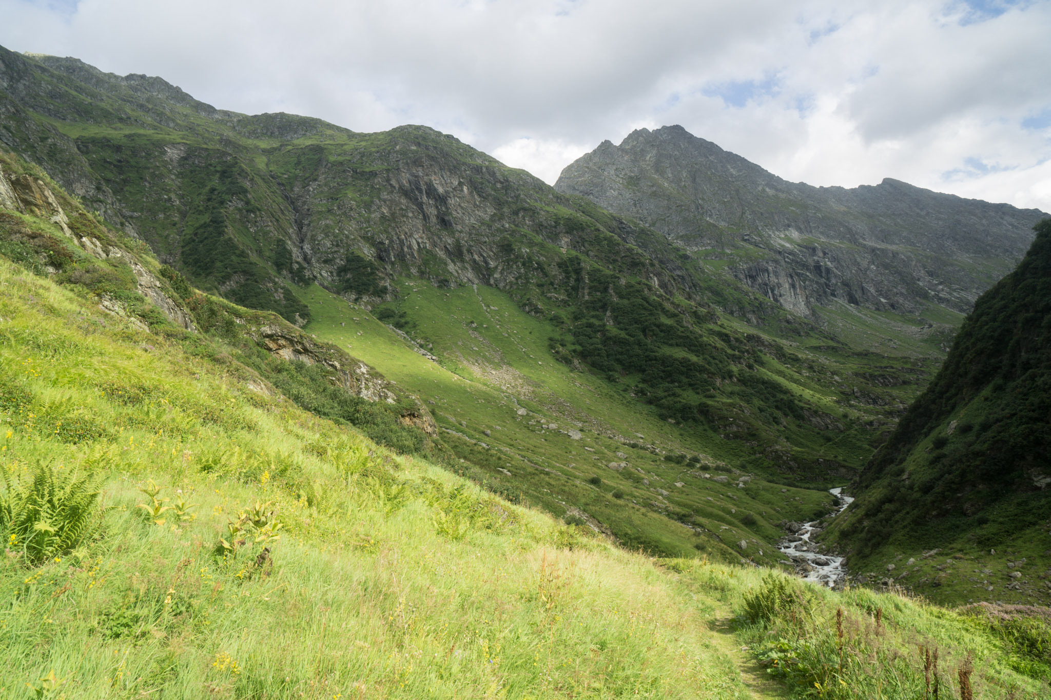 Dann geht es das Maderanertal in Richtung Osten aufwärts, wobei ich einmal mehr nicht so genau auf die möglichen Wege achte, und prompt auf einem Pfad zwischen Nellberg und Hellberg lande, der zwar noch am Anfang eine weiss-rot-weisse Markierung besitzt, aber wohl seit längerem nicht genutzt wird.