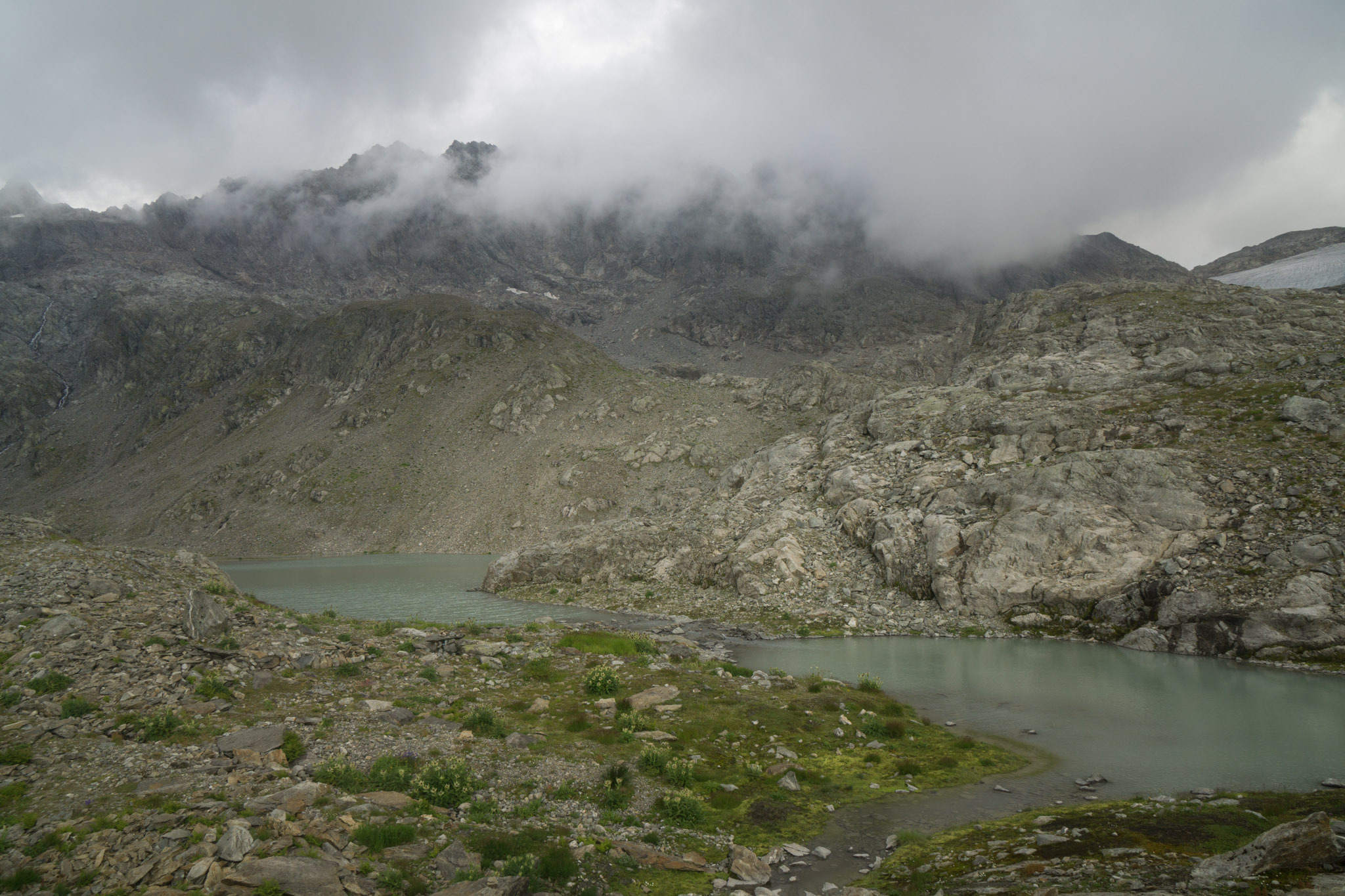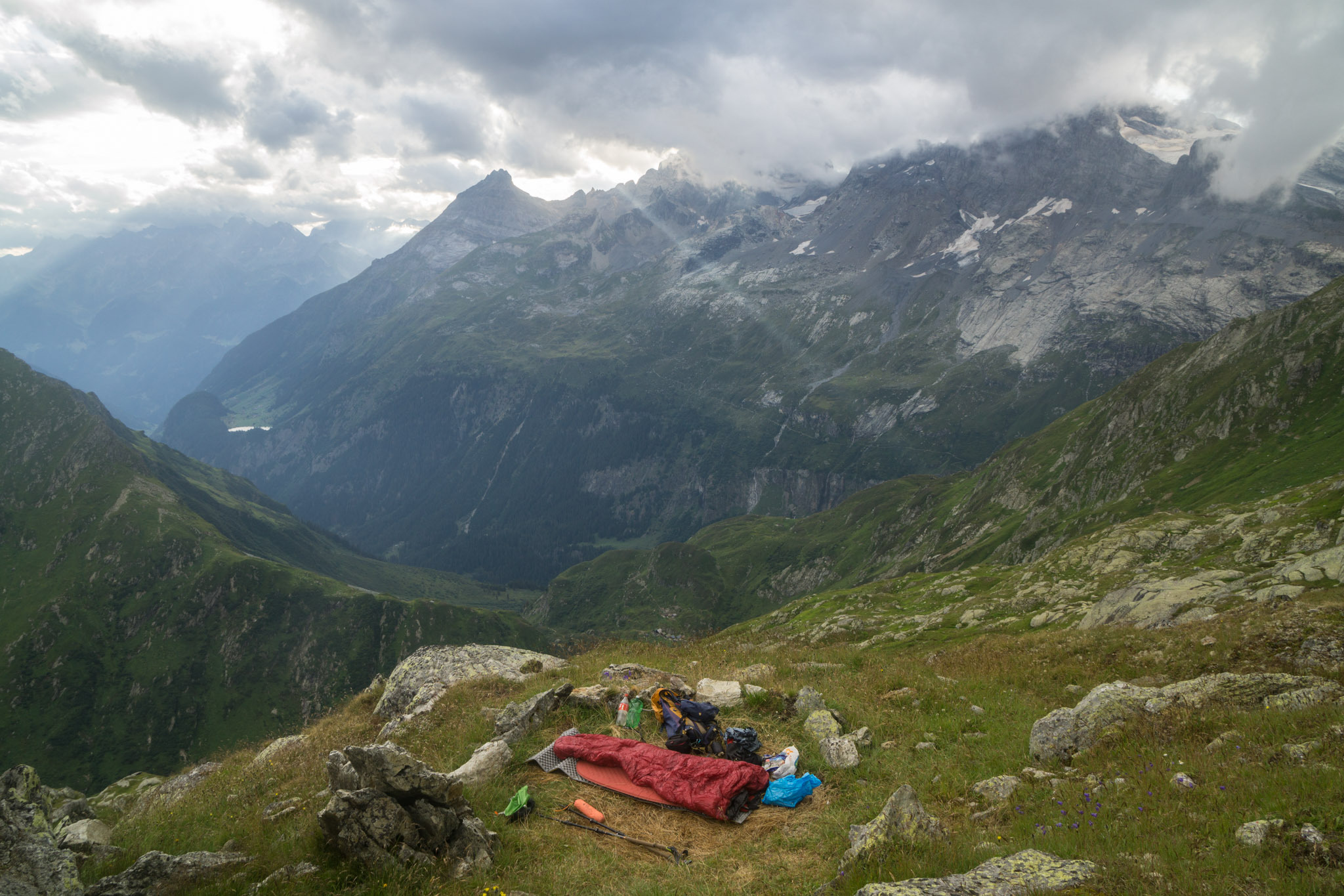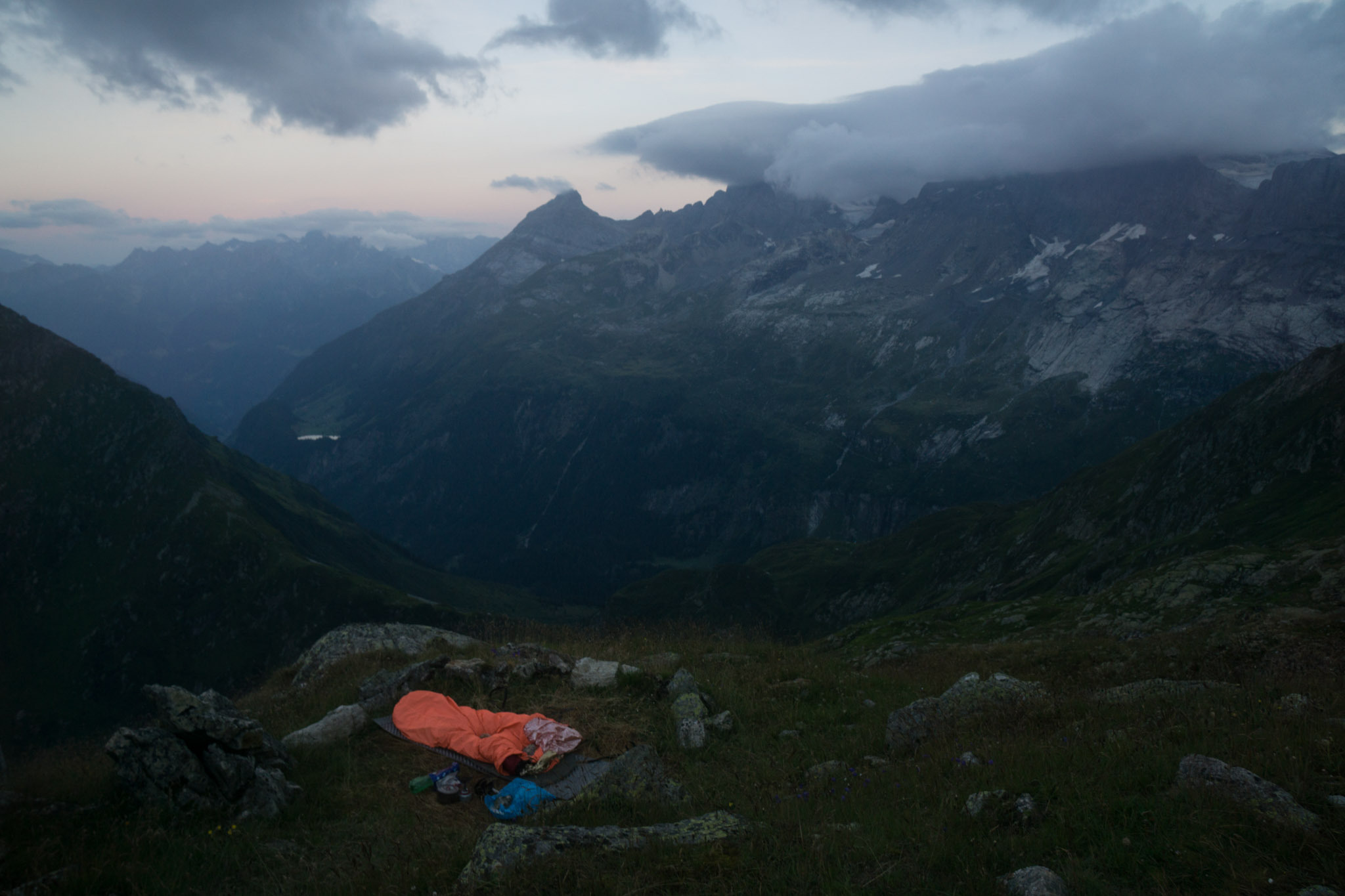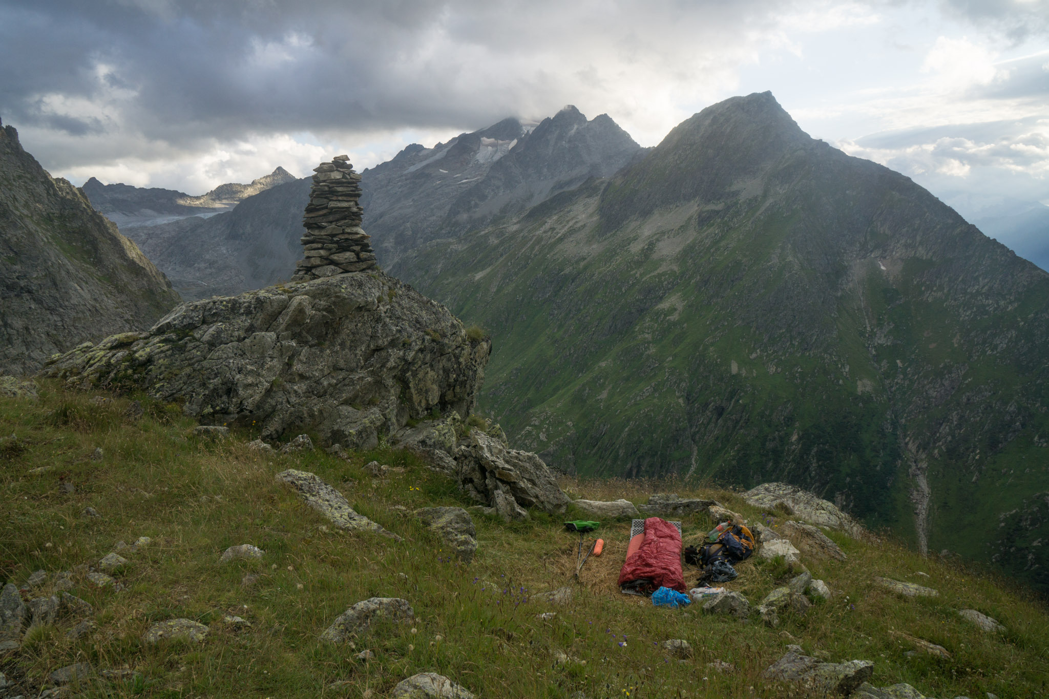 Oben am See angekommen sehe ich: keiner da ausser mir, freie Auswahl bei den Biwakplätzen. Es pfeift ein recht kräftiger Wind und leider machen alle Gipfel über 3000m einmal mehr dicht. Zuerst quartiere ich mich direkt am See ein, bei einem Rundgang jedoch entdecke ich beim grossen Steinmann (Markierung des Abstiegspfades) einen Logenplatz, dem ich nicht widerstehen kann. Windig ist es es an allen Plätzen, also kann ich mir auch die Aussicht gönnen.