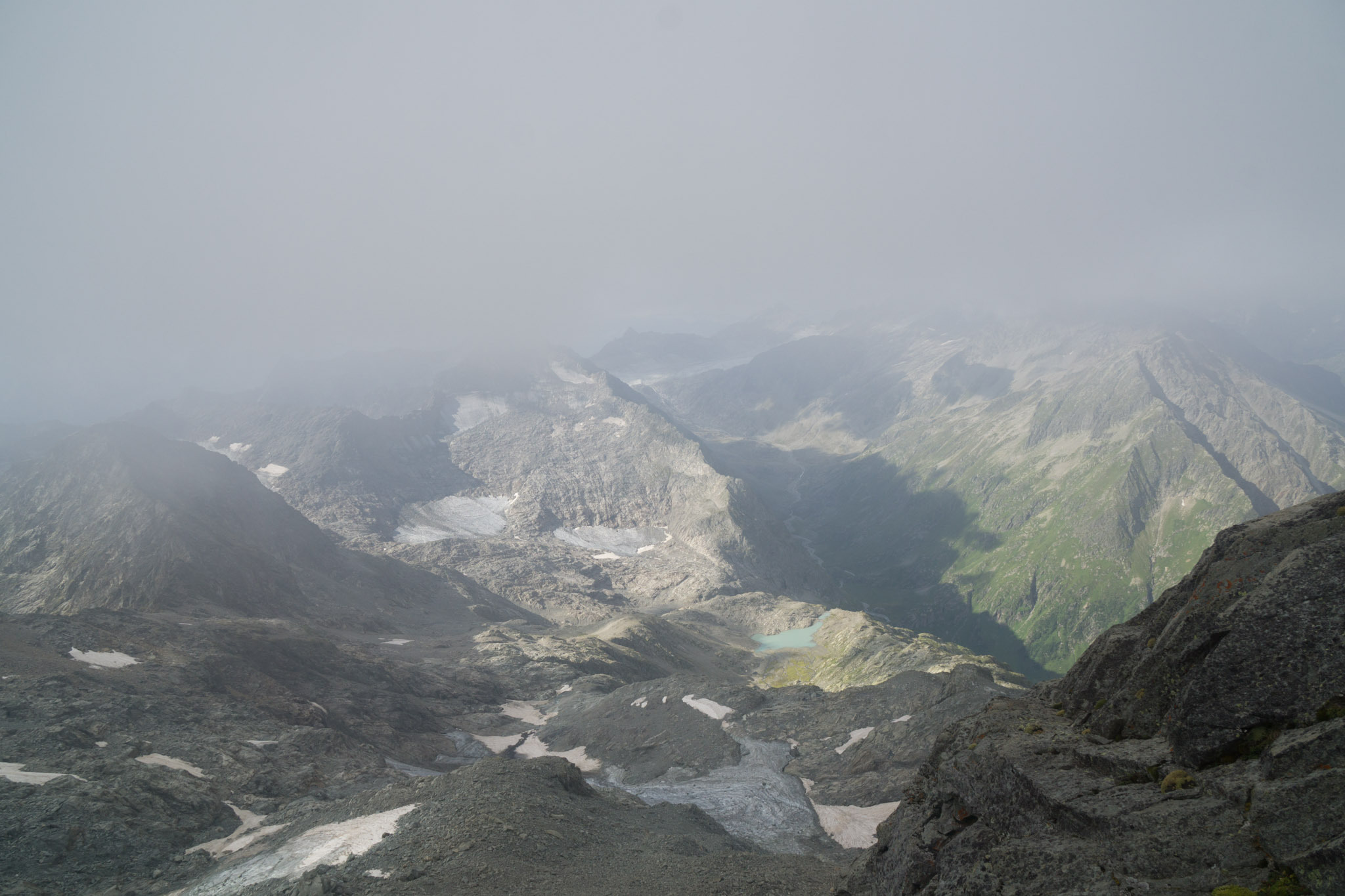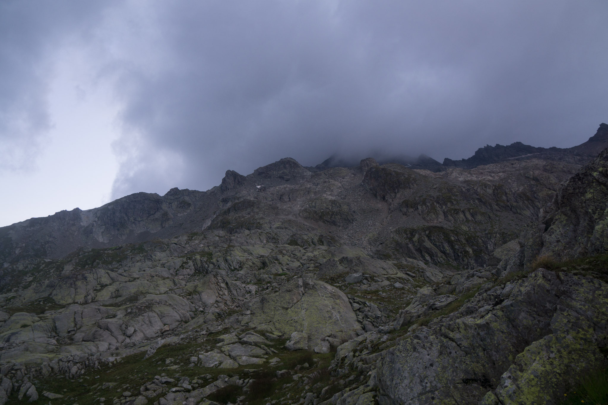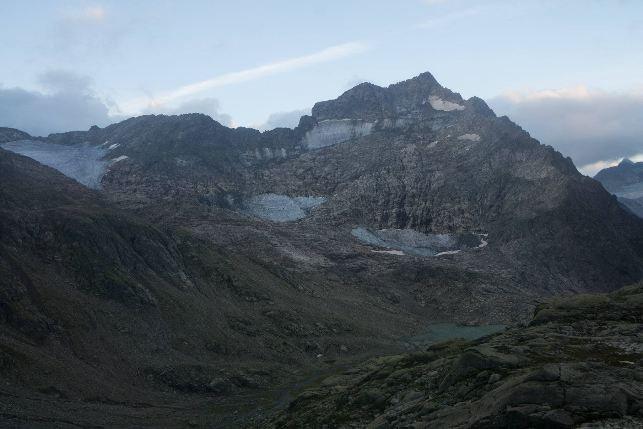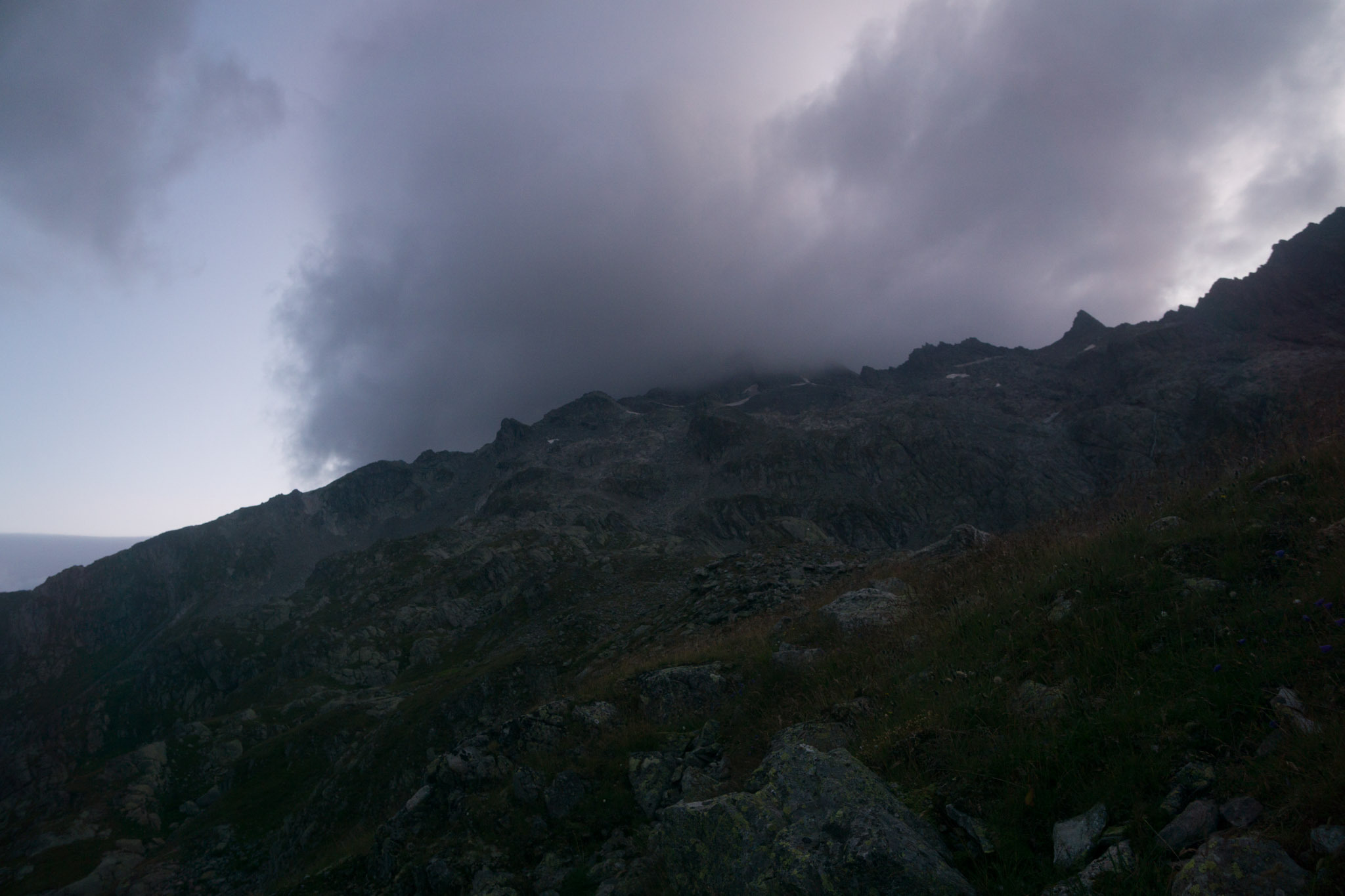 Oben am See angekommen sehe ich: keiner da ausser mir, freie Auswahl bei den Biwakplätzen. Es pfeift ein recht kräftiger Wind und leider machen alle Gipfel über 3000m einmal mehr dicht. Zuerst quartiere ich mich direkt am See ein, bei einem Rundgang jedoch entdecke ich beim grossen Steinmann (Markierung des Abstiegspfades) einen Logenplatz, dem ich nicht widerstehen kann. Windig ist es es an allen Plätzen, also kann ich mir auch die Aussicht gönnen.