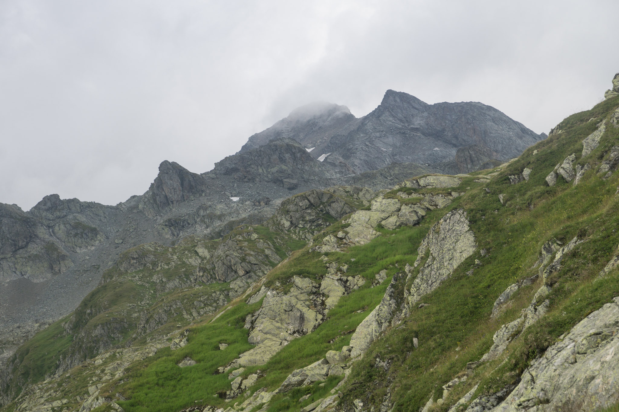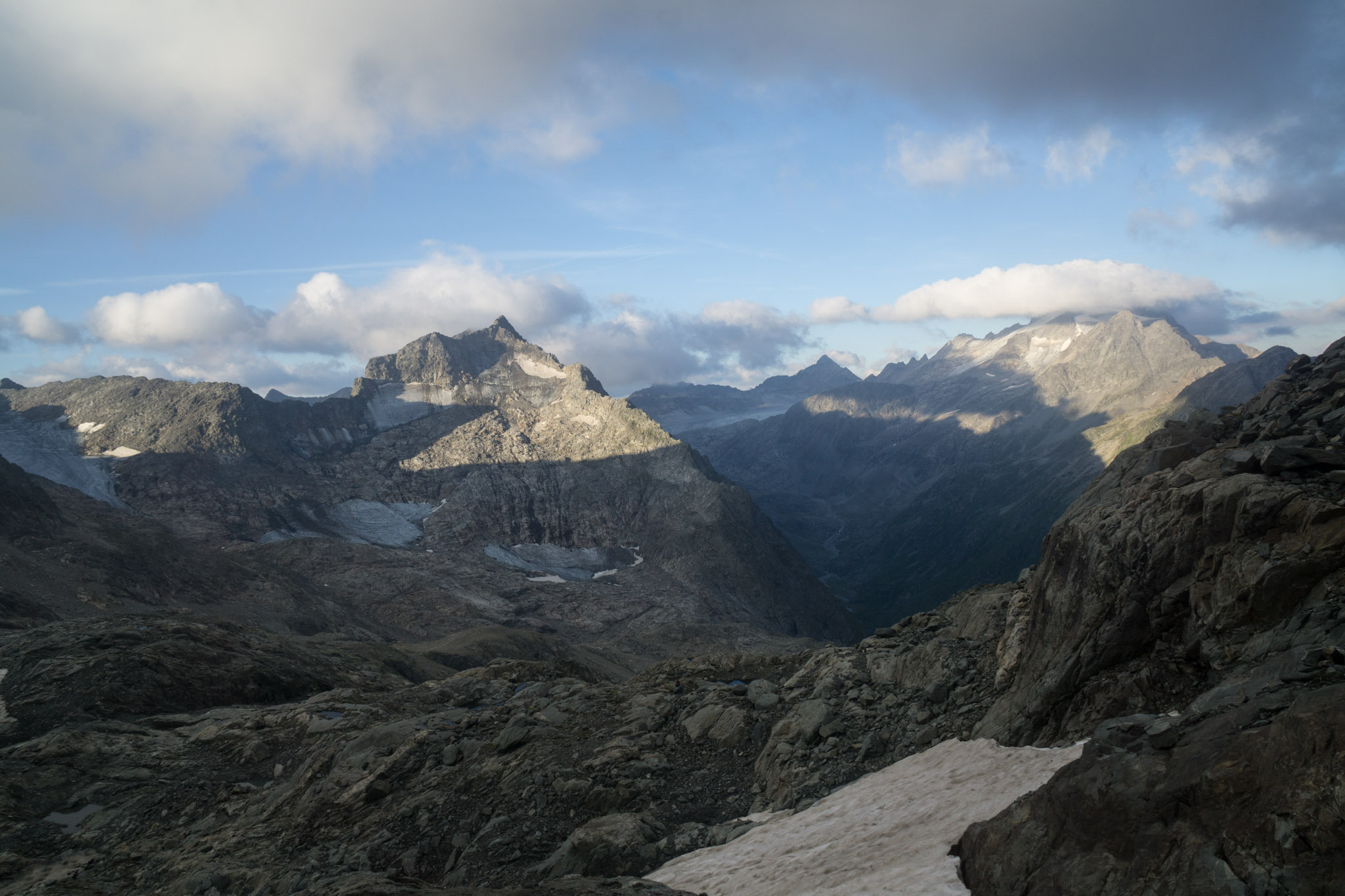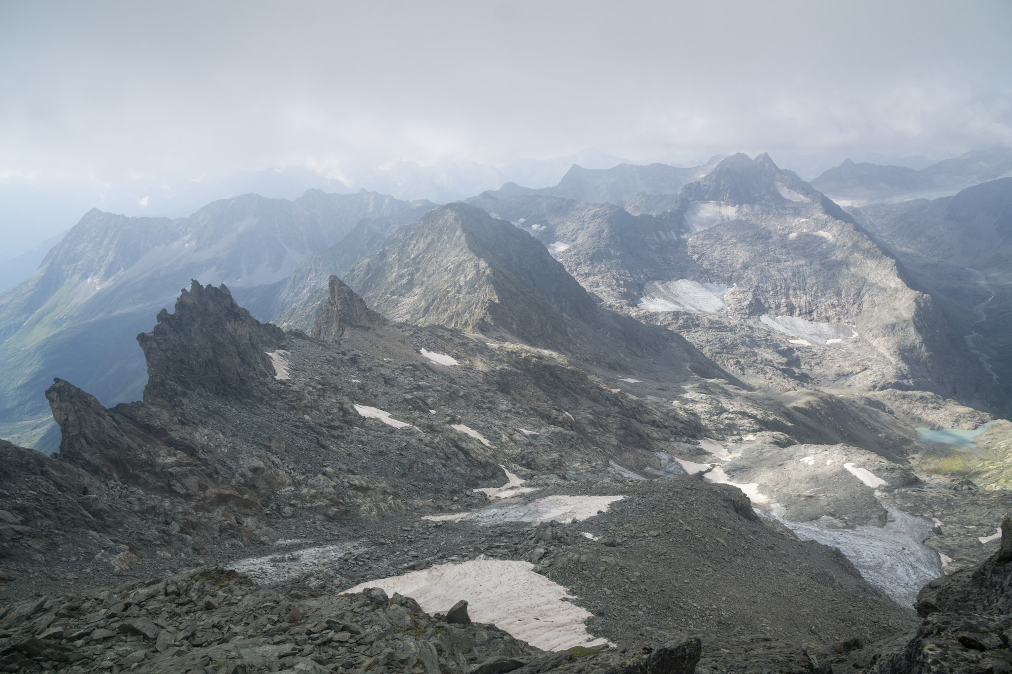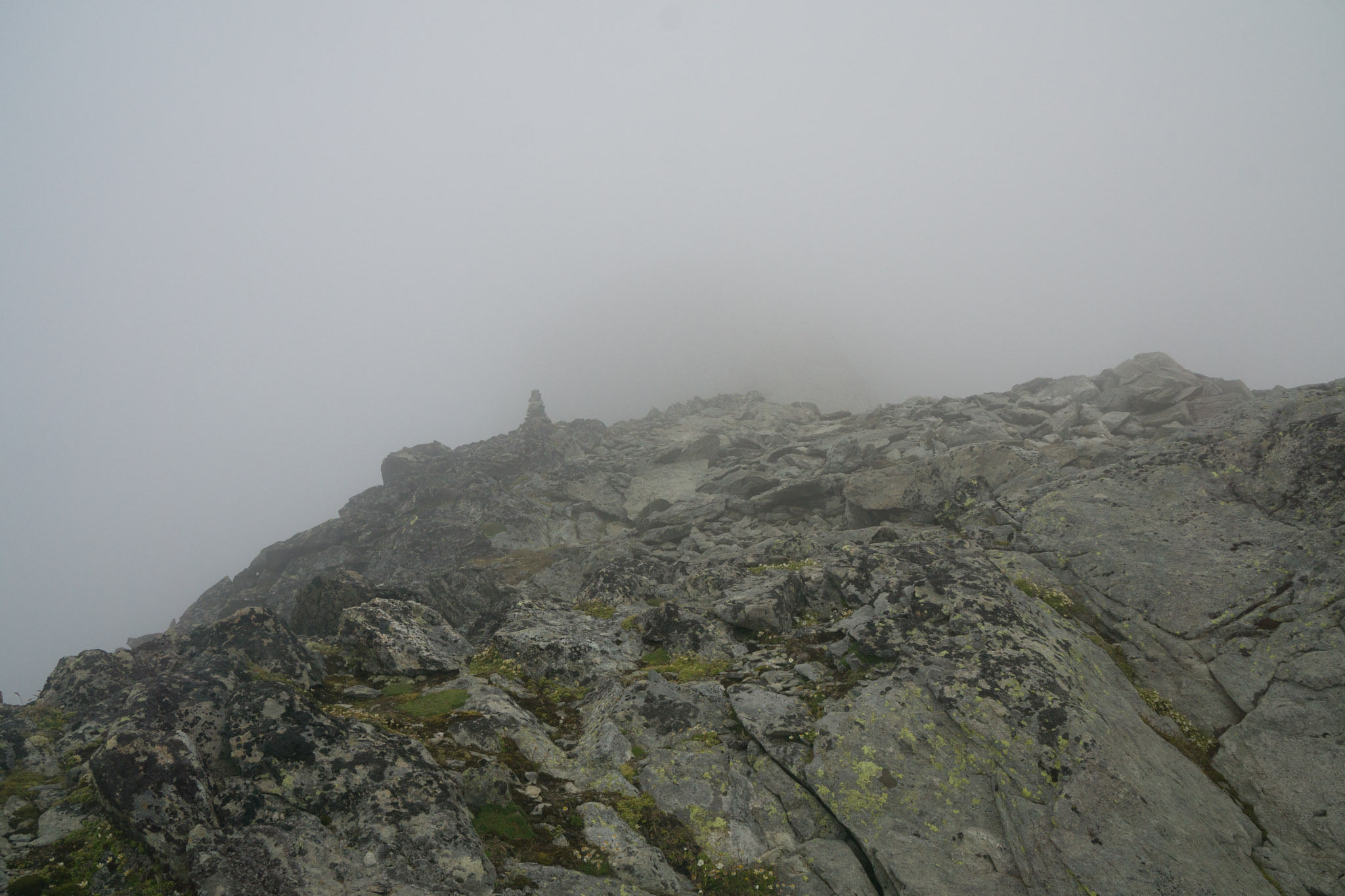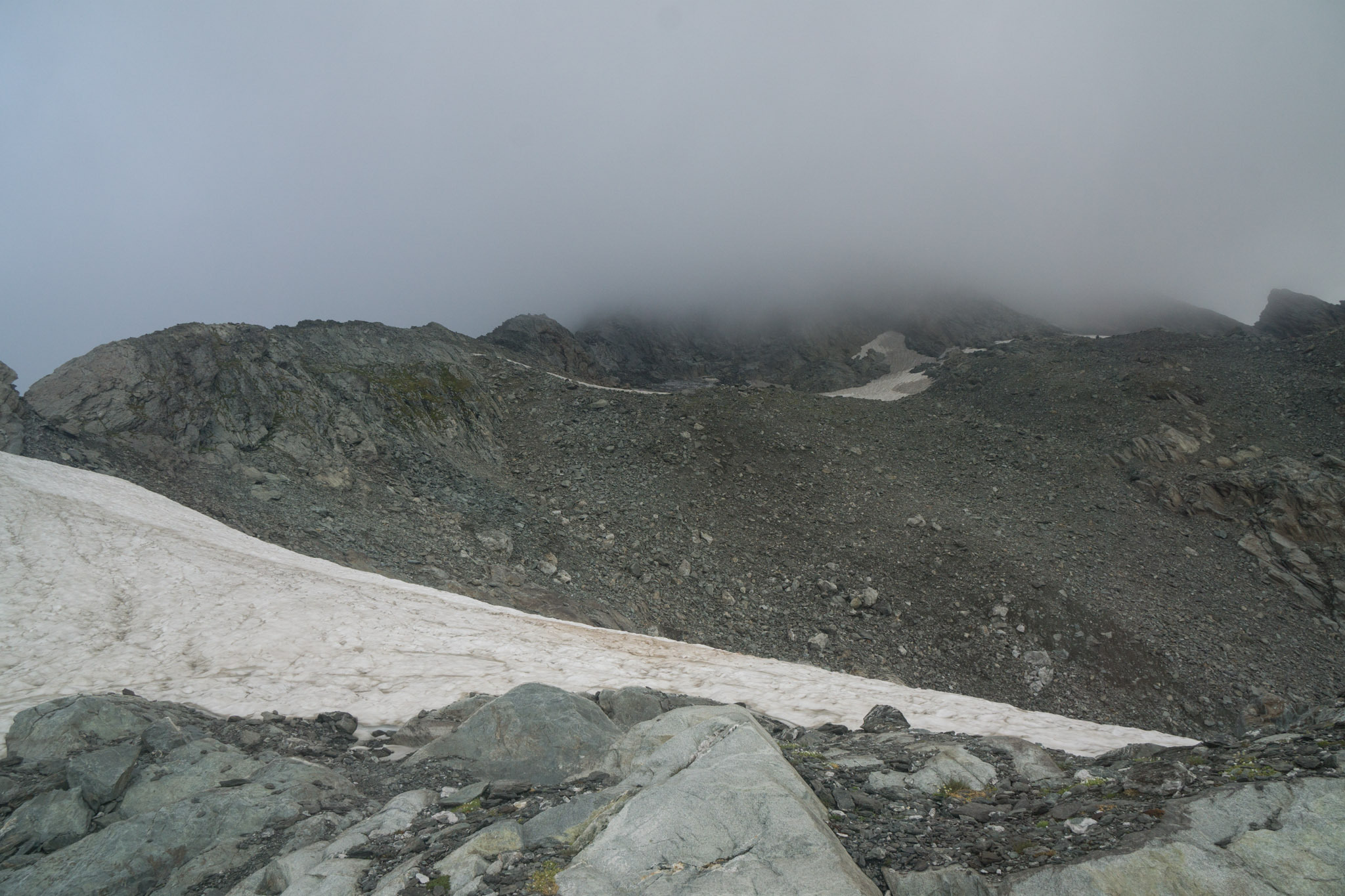 Oben am See angekommen sehe ich: keiner da ausser mir, freie Auswahl bei den Biwakplätzen. Es pfeift ein recht kräftiger Wind und leider machen alle Gipfel über 3000m einmal mehr dicht. Zuerst quartiere ich mich direkt am See ein, bei einem Rundgang jedoch entdecke ich beim grossen Steinmann (Markierung des Abstiegspfades) einen Logenplatz, dem ich nicht widerstehen kann. Windig ist es es an allen Plätzen, also kann ich mir auch die Aussicht gönnen.