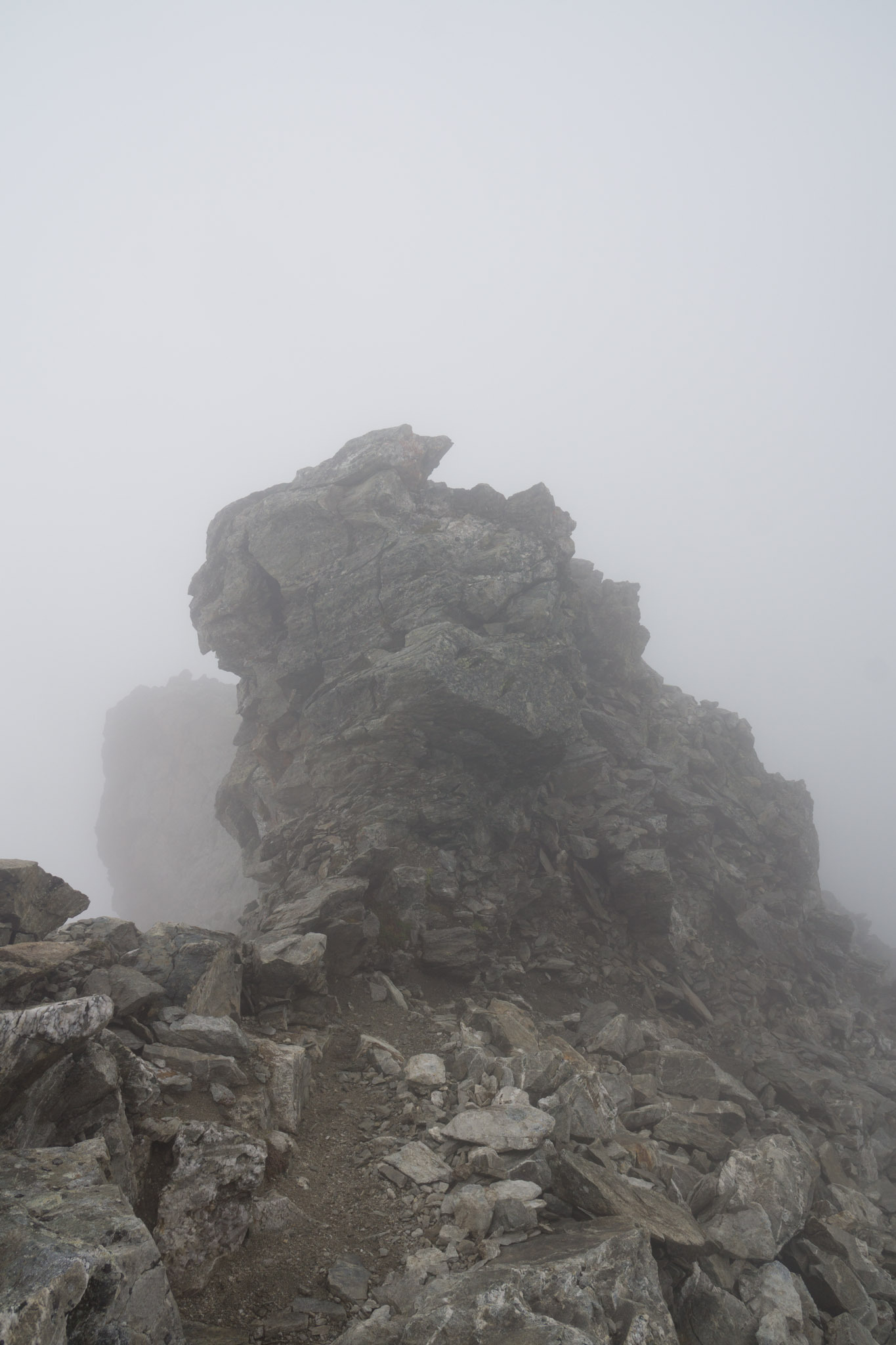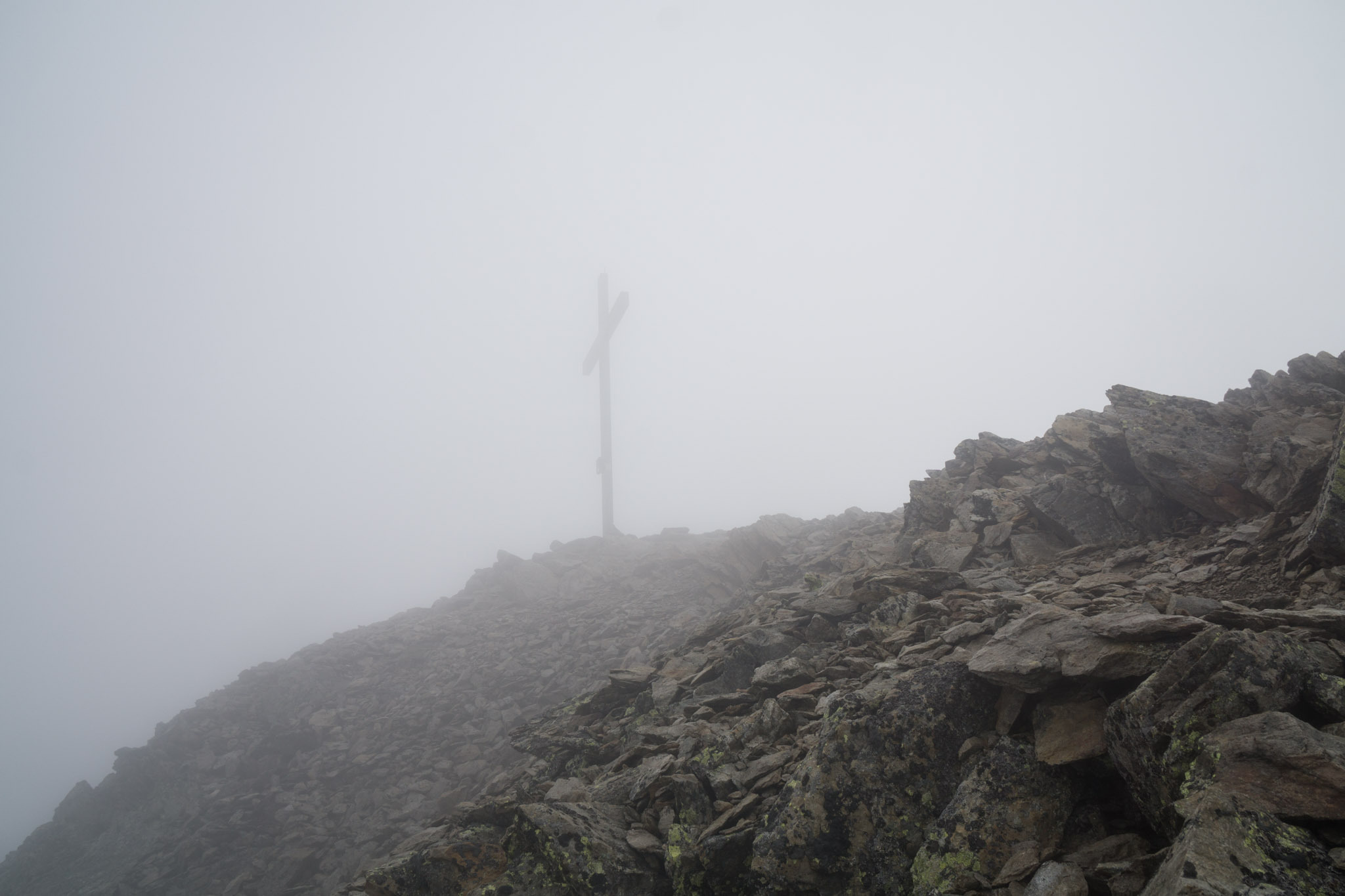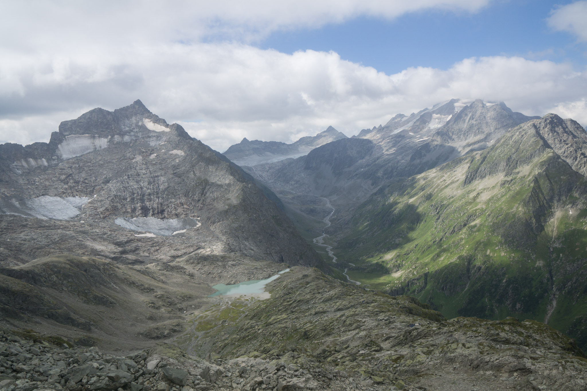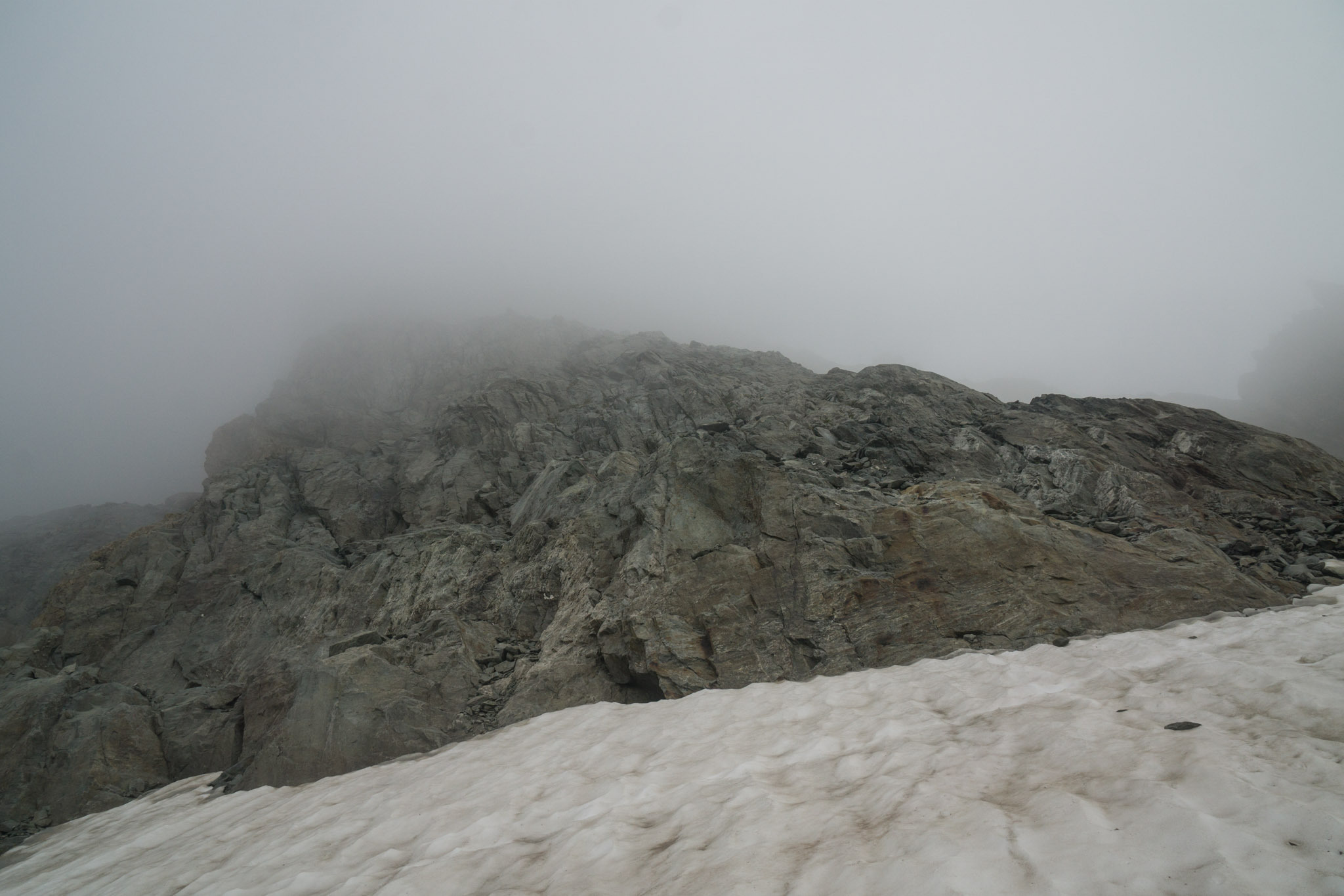 Oben am See angekommen sehe ich: keiner da ausser mir, freie Auswahl bei den Biwakplätzen. Es pfeift ein recht kräftiger Wind und leider machen alle Gipfel über 3000m einmal mehr dicht. Zuerst quartiere ich mich direkt am See ein, bei einem Rundgang jedoch entdecke ich beim grossen Steinmann (Markierung des Abstiegspfades) einen Logenplatz, dem ich nicht widerstehen kann. Windig ist es es an allen Plätzen, also kann ich mir auch die Aussicht gönnen.