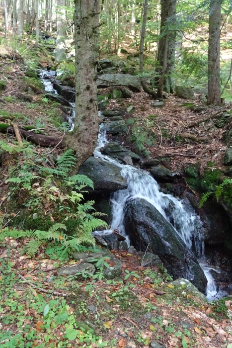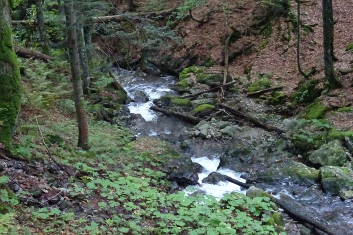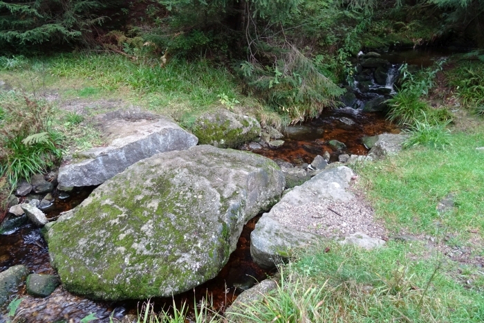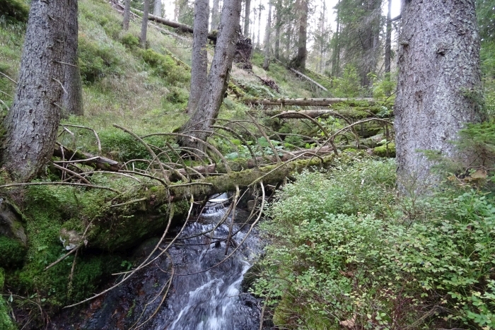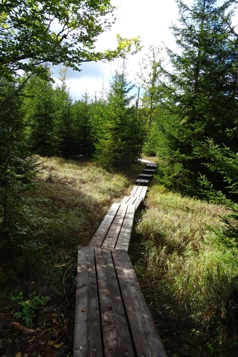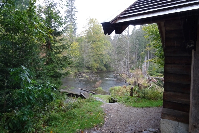 An der nächsten Weggabelung trennen sich unsere Wege. Ich wandere weiter auf dem Goldsteig zum Lusen, während die Indianer einen anderen Weg einschlagen. Mein Pfad schlängelt sich durch den Wald, teilweise sind über sumpfige Strecken Holzstege gebaut. Der Wald ist hier dicht und immer wieder fließen kleine Bäche quer oder der Steig verläuft daran entlang. Als ich zur Steinbachklause komme beginnt ein kurzer Regenguss und ich sitze ihn in der dortigen Schutzhütte aus.