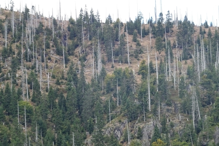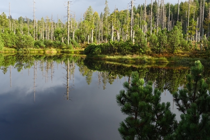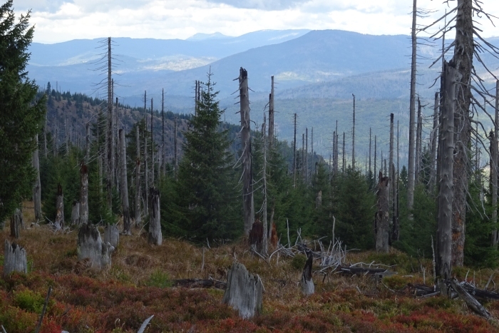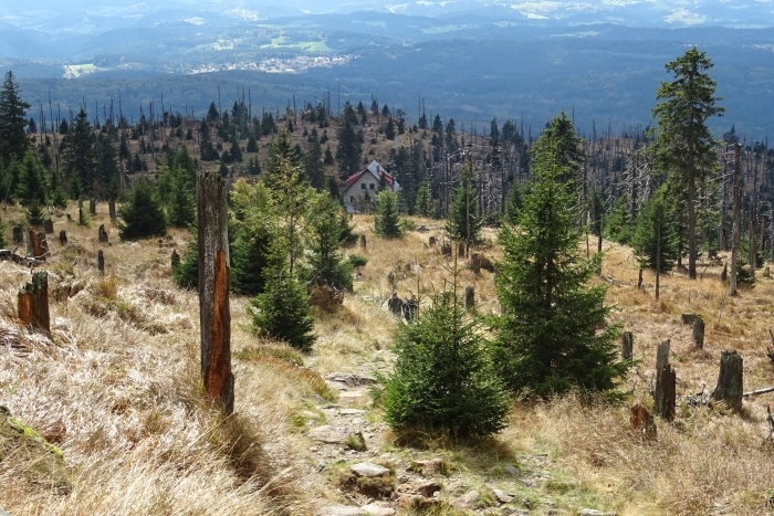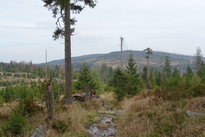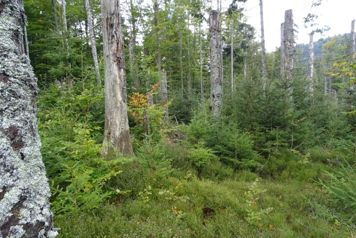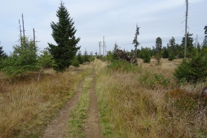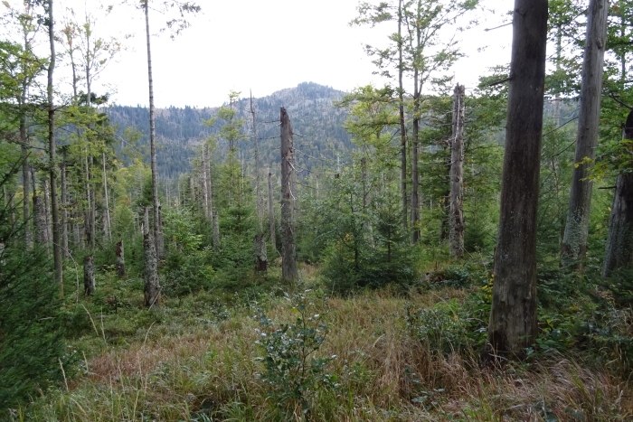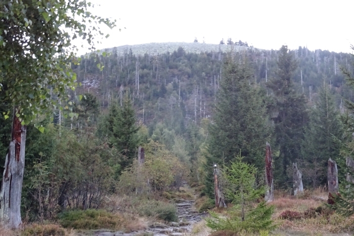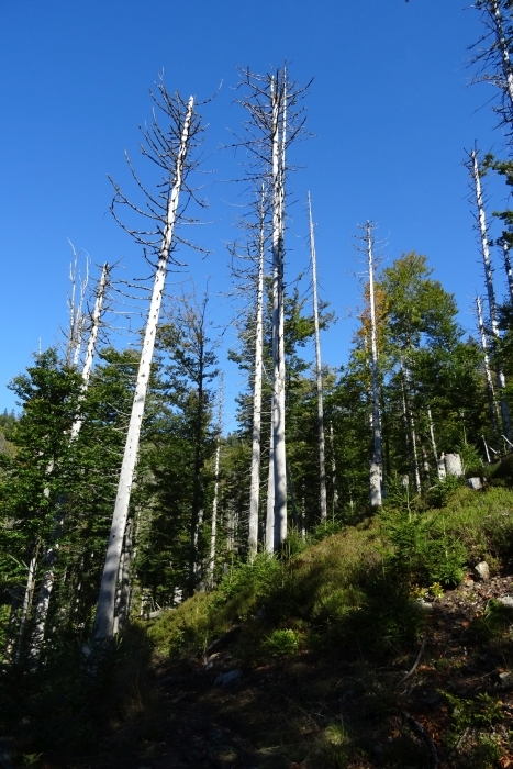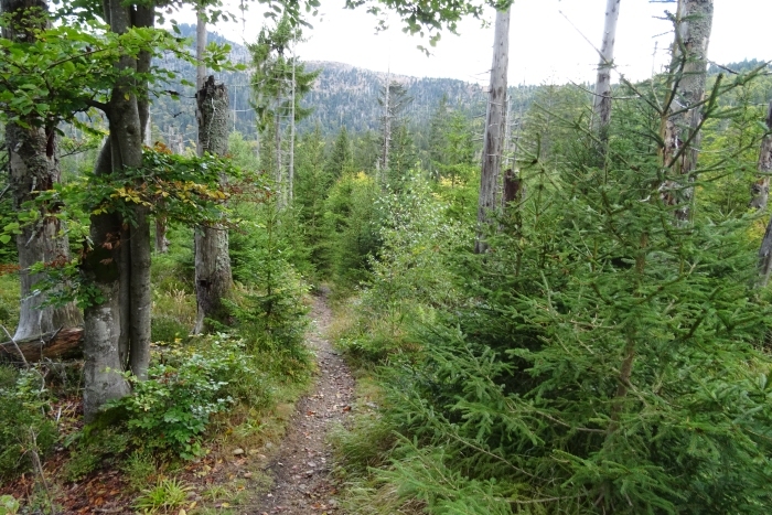 Im weiteren Verlauf fällt mir der Zustand des Waldes auf. Es gibt Bäume in verschiedenen Altersstufen. Viele abgestorbene Stämme stehen noch, dazwischen wächst Nachwuchs in verschiedenen Größen. Eine Folge des Borkenkäfers der vor Jahren große Flächen kahl gefressen hat. Die Verwaltung des Nationalparks hat damals beschlossen nichts zu unternehmen und die Natur sich selbst zu überlassen. Eine umstrittene Entscheidung, die sich inzwischen als richtig erwiesen hat. Der Wald wächst von alleine nach und es sind auch andere Bäume als nur Fichten hoch gekommen, wie Birken und Vogelbeeren.