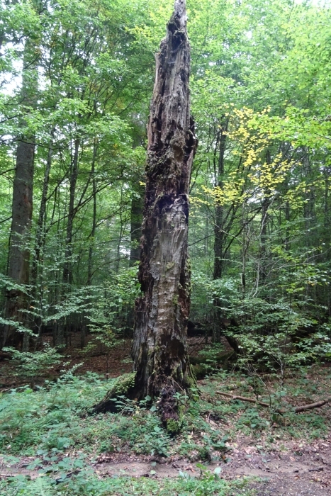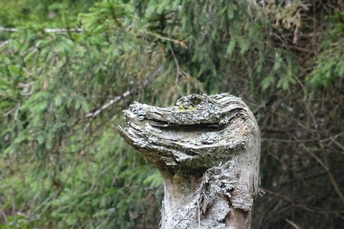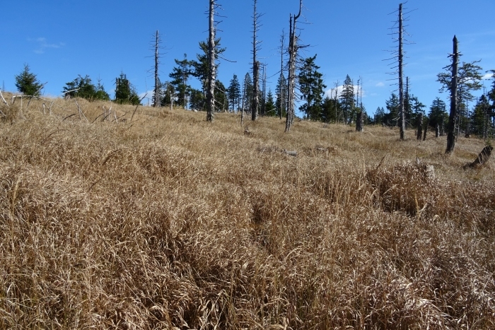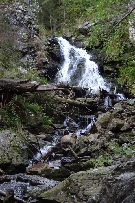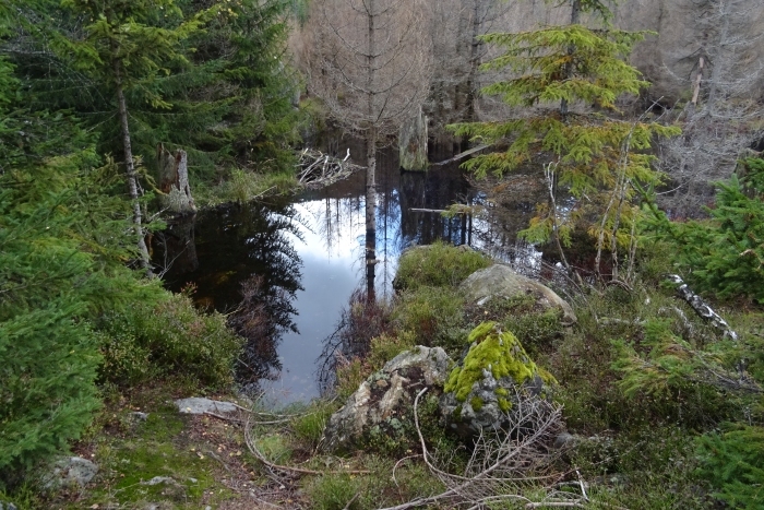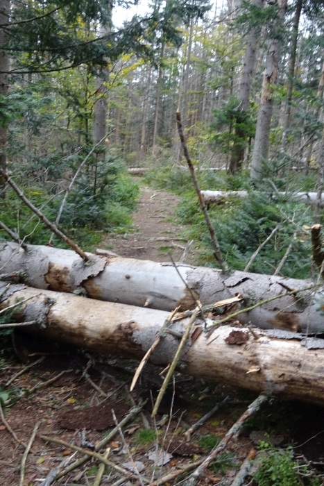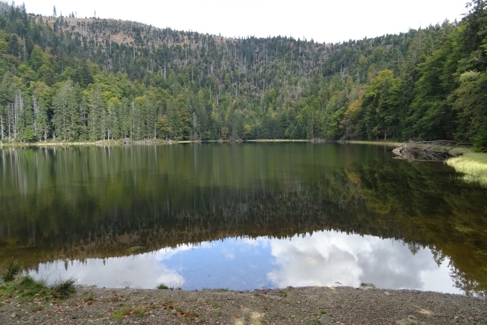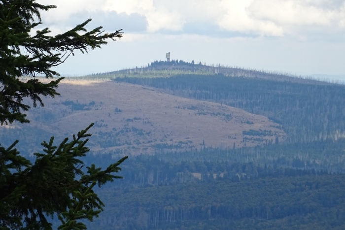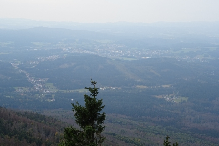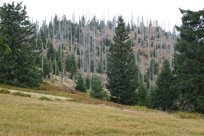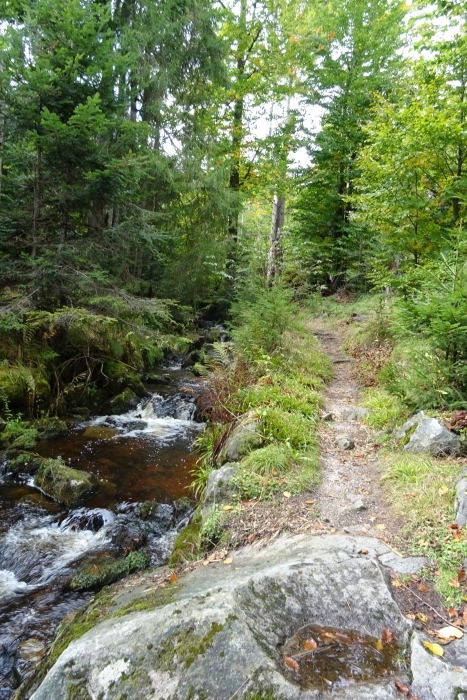 Im weiteren Verlauf fällt mir der Zustand des Waldes auf. Es gibt Bäume in verschiedenen Altersstufen. Viele abgestorbene Stämme stehen noch, dazwischen wächst Nachwuchs in verschiedenen Größen. Eine Folge des Borkenkäfers der vor Jahren große Flächen kahl gefressen hat. Die Verwaltung des Nationalparks hat damals beschlossen nichts zu unternehmen und die Natur sich selbst zu überlassen. Eine umstrittene Entscheidung, die sich inzwischen als richtig erwiesen hat. Der Wald wächst von alleine nach und es sind auch andere Bäume als nur Fichten hoch gekommen, wie Birken und Vogelbeeren.