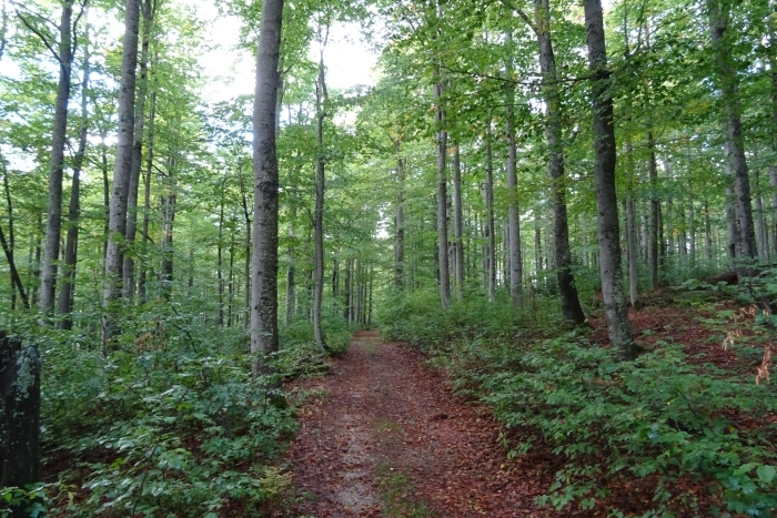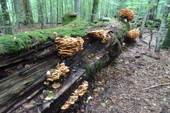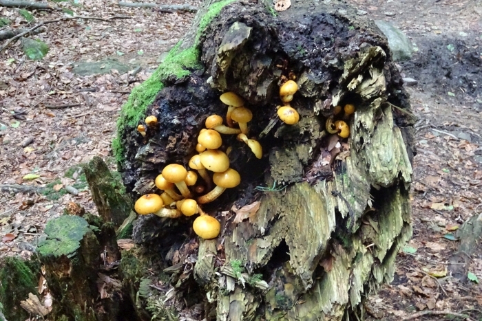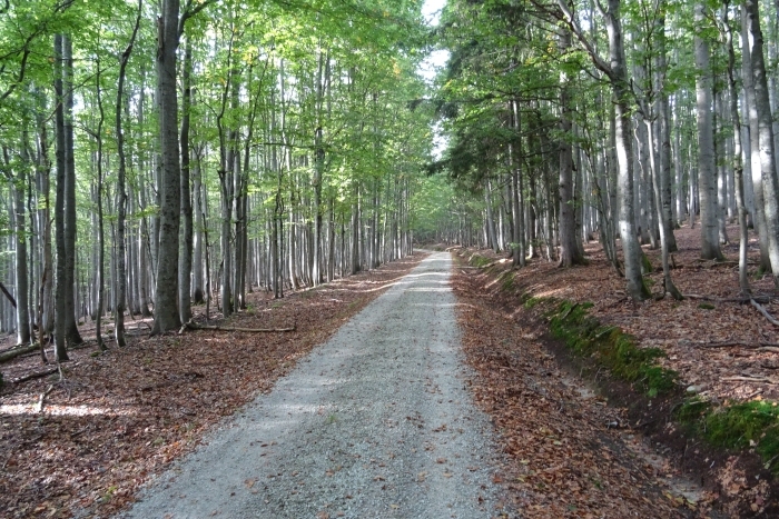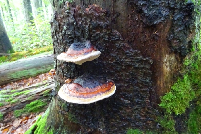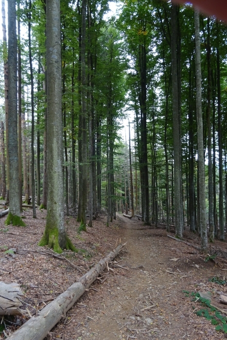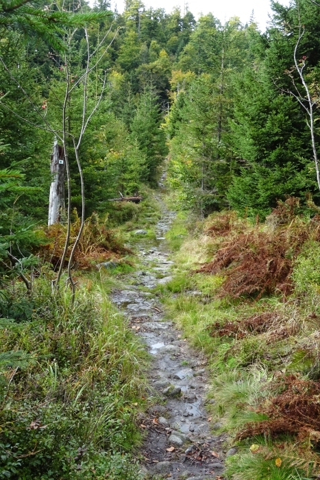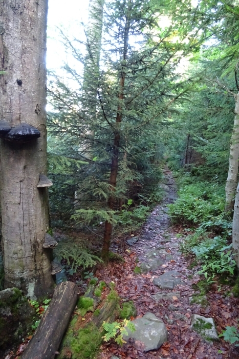 Nach der Rast geht es weiter in den Wald, diesmal auf einem Fahrweg. Unterwegs sind bunte Baumpilze zu bewundern und ich komme durch einen Buchenwald. Damit hatte ich nicht gerechnet, ich war eigentlich auf Fichten eingestellt. Der Weg wird wieder zum jetzt felsigen Steig, schmal führt er stetig bergauf, eine schöne Strecke.