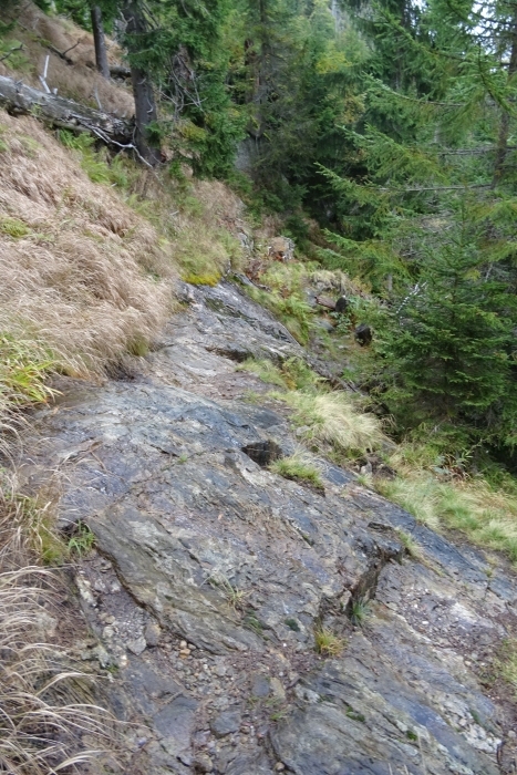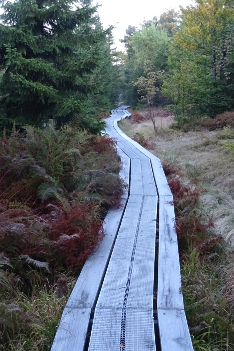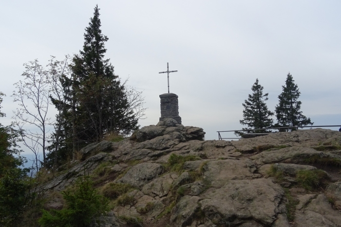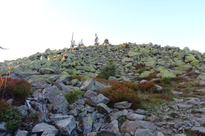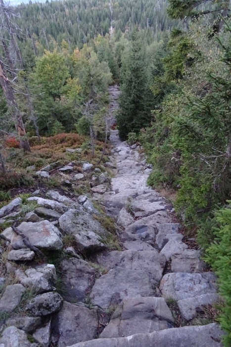 Nochmals steige ich auf den Felsengipfel des Lusen. Vereinzelt liegen Nebelfelder in den Tälern. Ich mache mich über die Himmelsleiter an den Abstieg. Langsam und vorsichtig, jeden Schritt mit den Stöcken absichernd bewege ich mich abwärts. Durch die kalte Nacht hat sich auf den Felsblöcken Reif gebildet und ich habe keine Lust aus zu rutschen. Als ich vom kahlen Gipfel in den Waldbereich komme wird es besser. Es gibt keinen Reif mehr und die Himmelsleiter wird auch flacher.