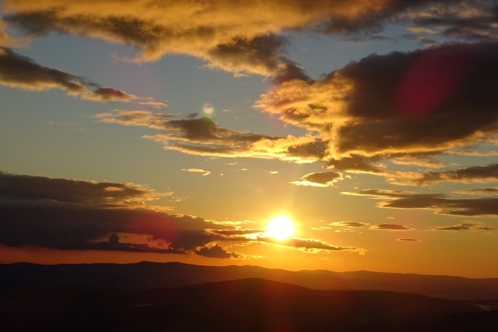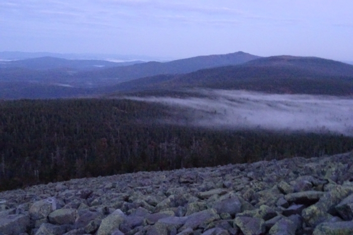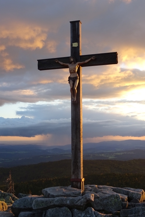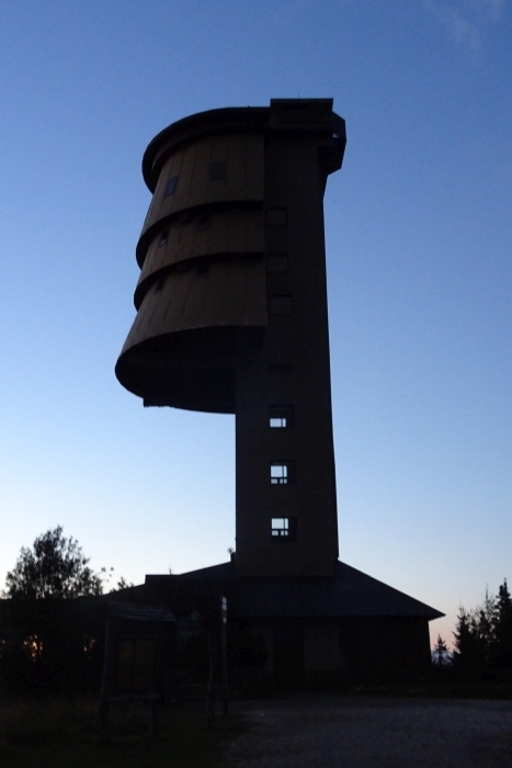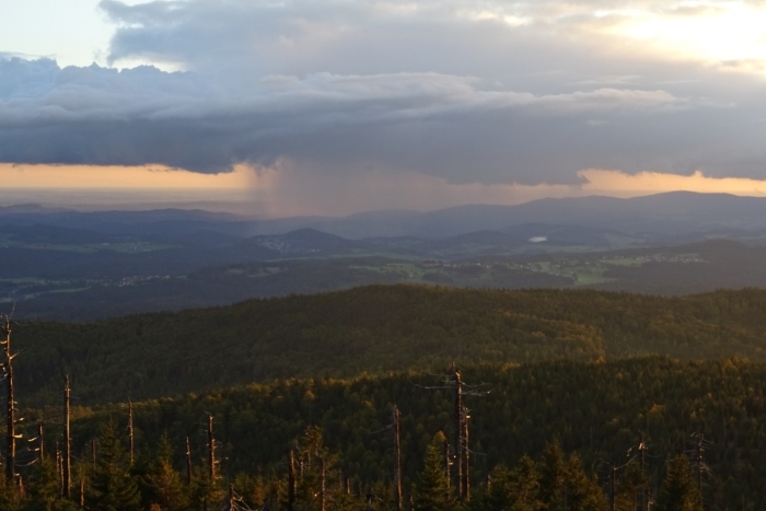 Es ist noch hell, der Anstieg zum Lusengipfel beginnt gleich hinter dem Schutzhaus und die nur 30Höhenmeter sind schnell erklommen. Der Lusen ist der einzige Gipfel im Bayerischen Wald der von einer Blockhalde bedeckt ist. Oben bietet er eine weite Rundumsicht über den Wald und im Süden ist die Alpenkette zu erahnen. Wolken ziehen über den Himmel und regnen sich stellenweise ab. Ein kalter Wind weht über den kahlen Gipfel und als die Sonne untergeht steige ich wieder ab um in meine kleine Kammer zu gehen.