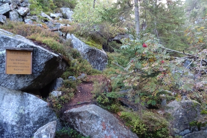 Weiter geht es zunächst über ebenfalls bereifte Holzstege und einen anschließenden, schmalen Felsensteig hinunter in das Teufelsloch. Ein tief eingeschnittenes Tal in dem Granitfelsen ein Blockmeer bilden, unter denen der Bach rauscht.
