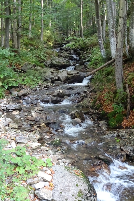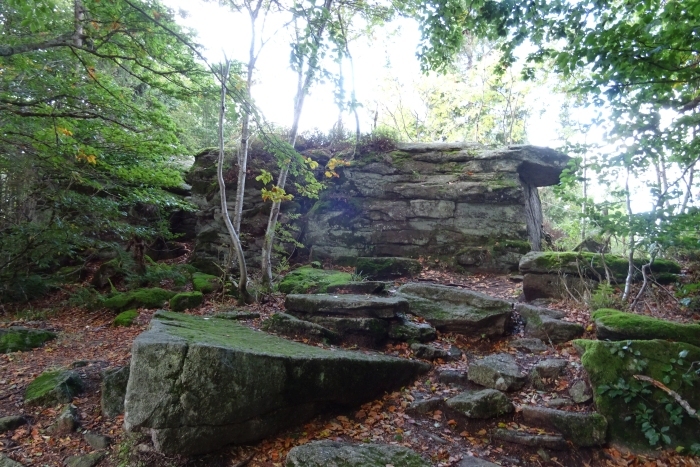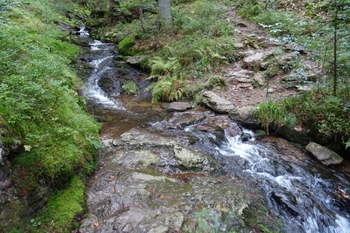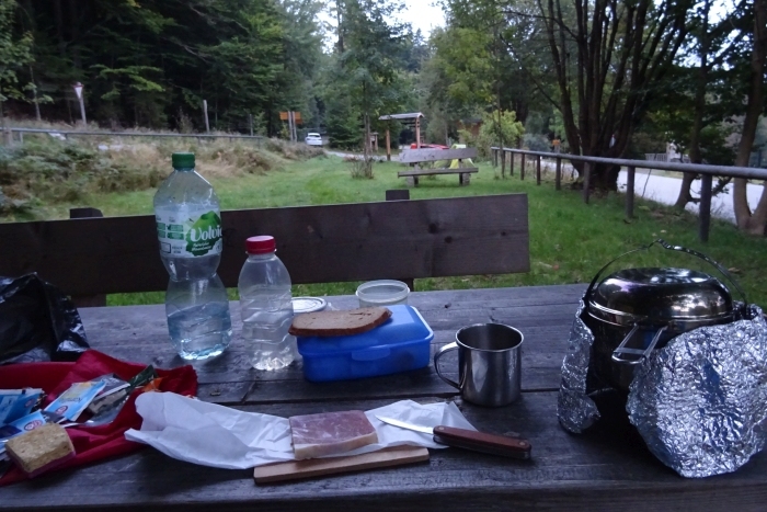 Abwechslungsreich geht es weiter durch den Wald. Immer auf schmalen Pfaden, die von Bächen geschnitten werden, durch Buchen- und Fichtenwald. An einer Felsenkanzel, die etwas Aussicht bietet, mache ich in der dortigen Schutzhütte eine Pause.
