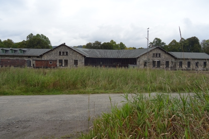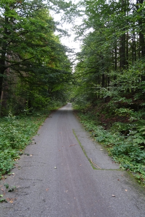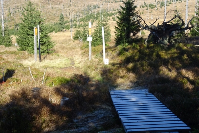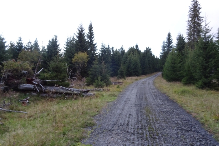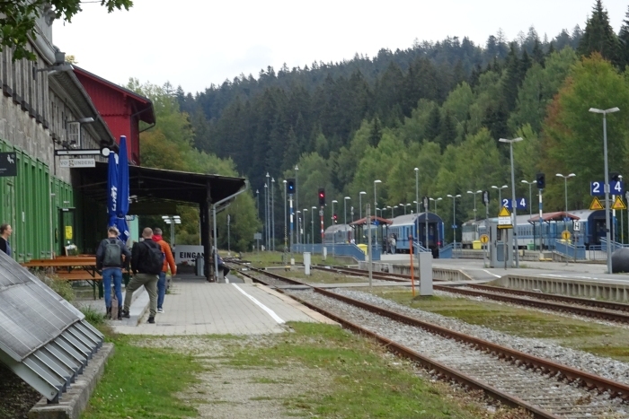 Einen letzten Anstieg zum Hochbergsattel habe ich noch vor mir. Auf dem Sattel raste ich zum letzten Mal auf dieser Tour, mache mich dann an den Abstieg. Auf dem Pfad liegen etliche Bäume quer und ich muss diese übersteigen oder unterkriechen. Nachdem diese Hindernisse überwunden sind wandere ich schneller, den teils steilen Pfad abwärts, damit ich den Bus in Bayrisch Eisenstein rechtzeitig erreiche. Zunächst an der Rückseite des dortigen Eisenbahnmuseums vorbei gehe ich, dem lang gestreckten Bahnhofsgelände entlang, zur Bushaltestelle.