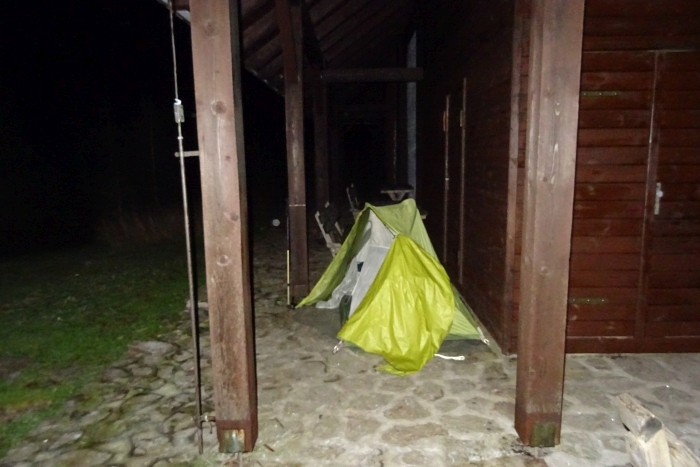 In der Schutzhütte beim gläsernen Schiff, das an die Glasmachertradition im Wald erinnert, schläft ein Wanderer auf einer Isomatte.