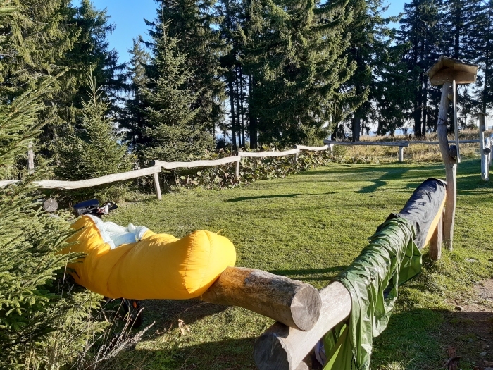 Am folgenden Wanderparkplatz spricht mich wegen meines Huts ein älteres Paar an. Die Beiden sind ebenfalls auffällig gekleidet, mit Federn im Haar, und stellen sich als die Waldindianer vor. Sie wandern öfters hier in der Gegend und wollen zunächst Richtung Lusen und so wandern wir ein Stück gemeinsam. Schließlich fordern sie mich auf stehen zu bleiben. Die beiden Waldindianer singen mir mitten auf dem Pfad ein Lied vor. Aus der Gegenrichtung kommen andere Wanderer die ebenfalls angesprochen werden und ich nutze die Gelegenheit mich ab zu setzen. Rund einen Kilometer weiter schlage ich mich seitwärts in die Büsche um einen Rastplatz auf die Tauglichkeit für die Schutzhüttenkarte zu prüfen; leider nichts für uns.