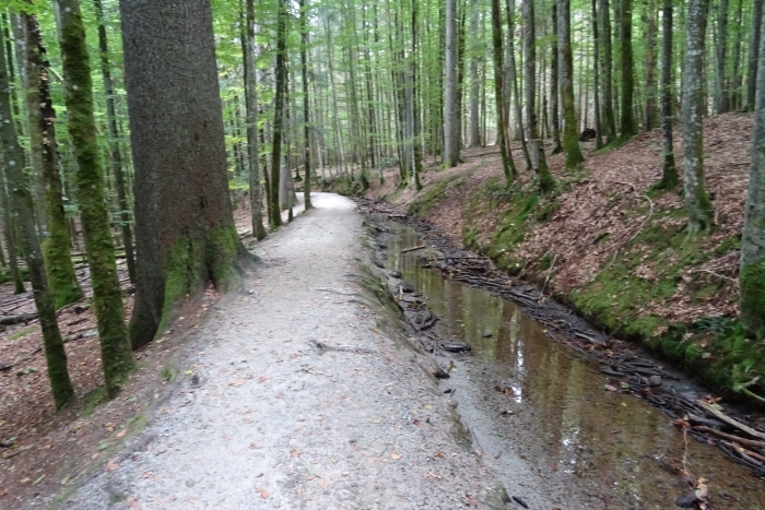 Als nächstes komme ich zum Schwellsteig. Dieser ebene Weg begleitet einen kleinen Kanal der Wasser von einigen Bächen sammelt und der Schmalzbachschwelle zuführt. Diese Schwellen im bayerischen Wald dienten früher dem Holztransport. Es wurde im Winter geschlagen, ins Tal gebracht und dort gesammelt. Im Frühjahr wurden die Schwellen geöffnet damit die Bäche genügend Wasser bekamen um das Holz in den Regen zu schwemmen, das dadurch bis zur Donau transportiert wurde.