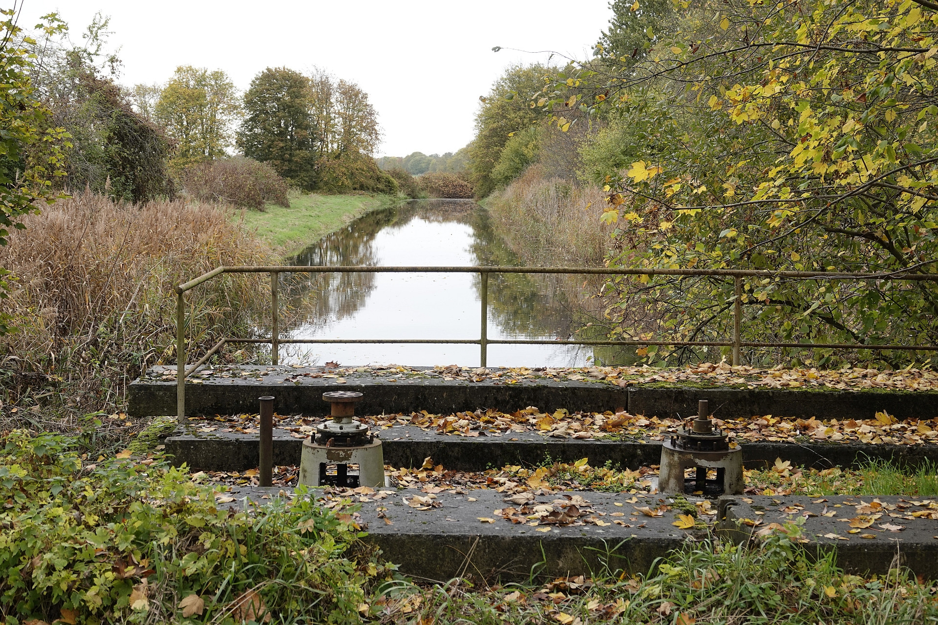 Auch hier ist alles Naturschutzgebiet. Die nähere Umgebung des Kanals ist recht naturnah bewachsen mit Erlen, Silberweiden, Pappeln, Berg- und Spitzahorn und anderen Gehölzen. Allerdings sind auch ein paar invasive Arten unübersehbar, wie das Drüsige Springkraut und der Japanische Staudenknöterich. Alles ist von Wildspuren durchzogen.