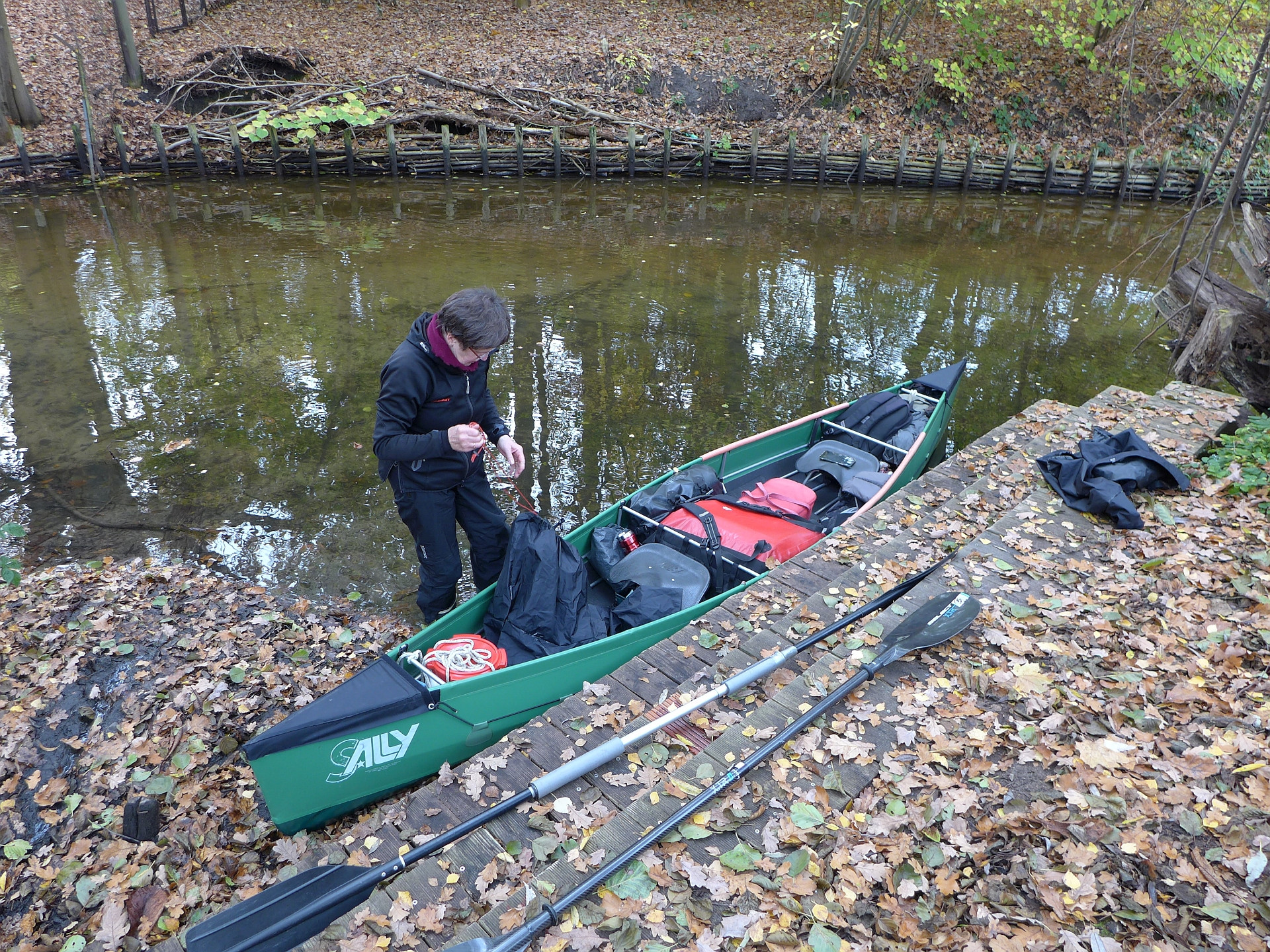 Mit vielen Leihbootpaddlern rechnen wir so spät im Jahr dennoch nicht mehr. Also einen Befahrungsschein beantragt, das geht telefonisch einfach und schnell bei der Tourist-Information der Stadt Rheinsberg. Wir bekommen den Befahrungsschein per email und statten dann unser Ally-Kayak mit Doppelpaddeln aus. Andrea nimmt ihr kürzlich erworbenes “High-End-Paddel aus Carbonfaser”, das 790g leichte “Select Paddel XTR”, und ich ein 20€-Lidl-Paddel, welches ich auf 2.53m verlängert habe und das 925g wiegt. Das hatte ich mir 2010 für die Obere Theiß gebastelt. Weil die Alurohre ein bisschen zu dünn und außerdem kalt anzufassen sind, habe ich noch 2 Griffstücke aus Baumarkt-Rohrisolierung drumrum gelegt.