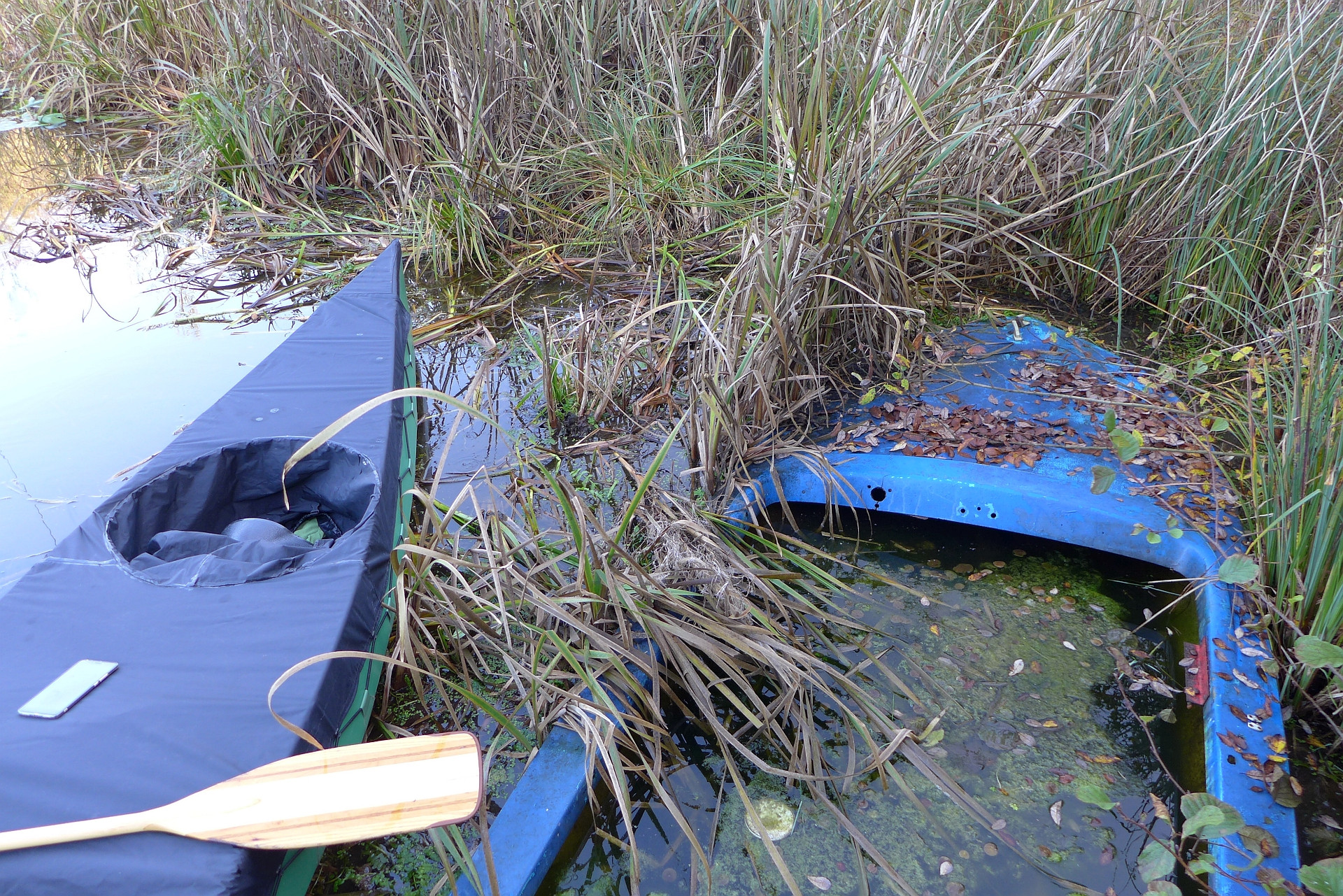 Hier ist die Strömung relativ schwach. Das Foto mache ich, weil es hier so besonders einfach ist und der dicke Stamm ganz eindrucksvoll. Etliche andere Unterquerungen sind heikler, und einmal muss ich auch das gesamte voll beladene Boot überheben: