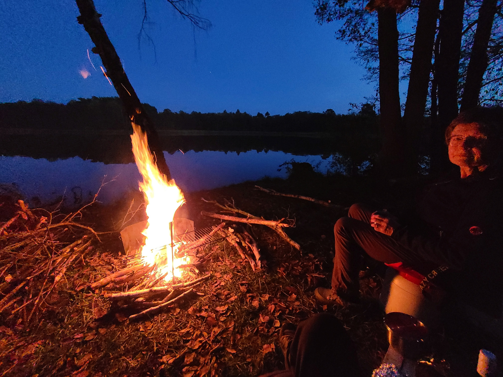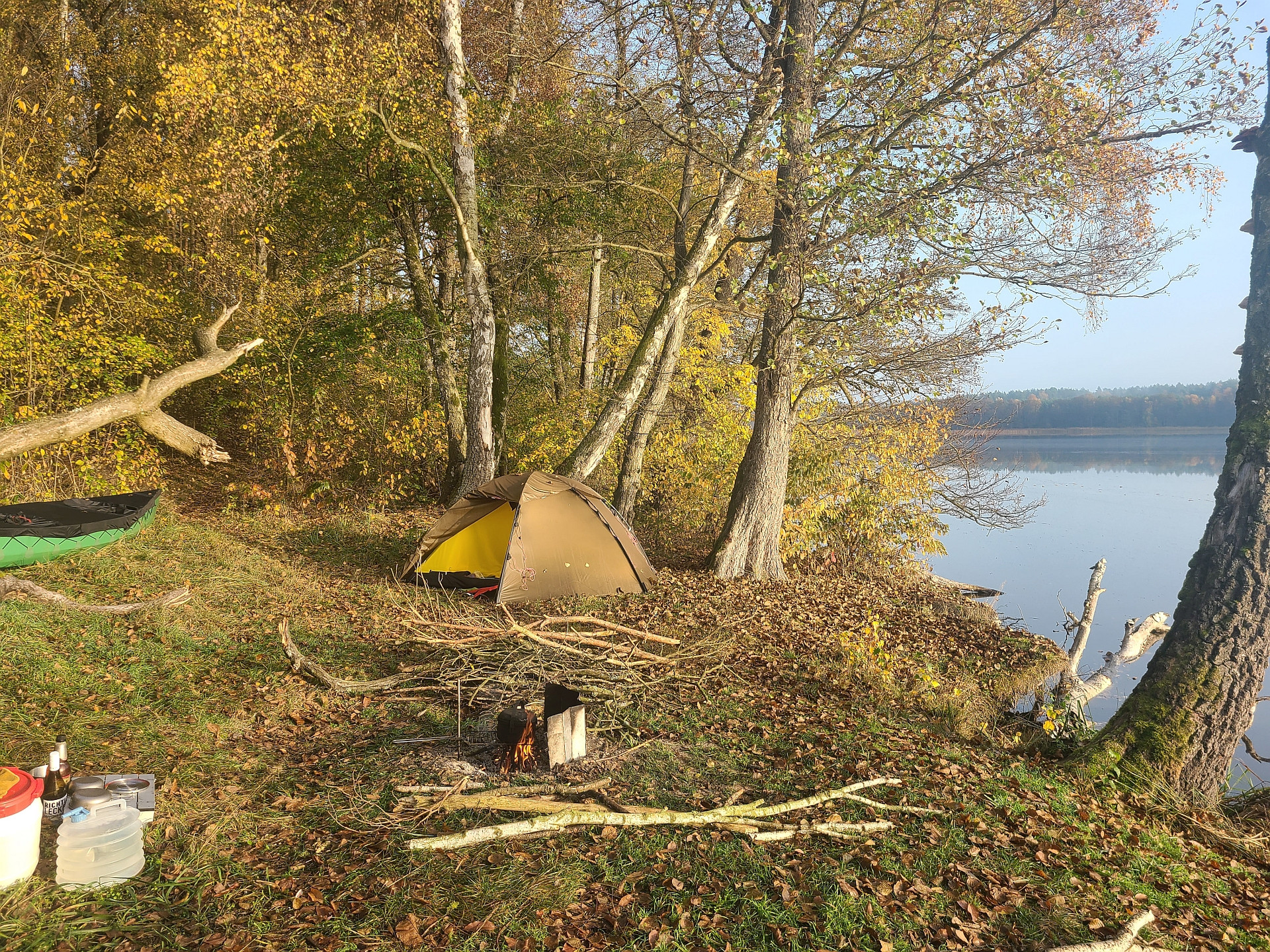 Nun ist es schon arg dunkel und wir beeilen uns, einen passablen Nachtplatz zu finden. Nach einem ½km Paddeln ist es so weit und wir landen an. Hier gibt es eine Fahrspur am Ufer, aber selten benutzt. Ein paar Meter weiter ist Schluss damit und hier bauen wir bereits im Dunkeln das Zelt auf.