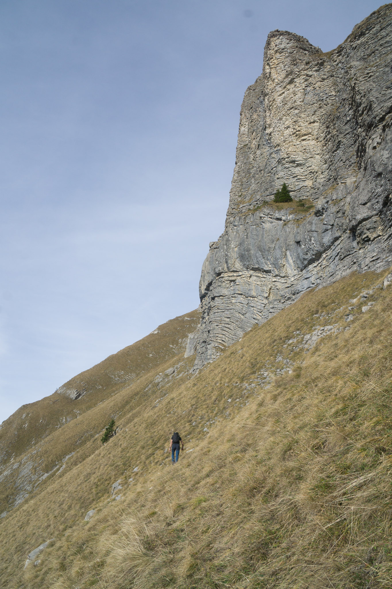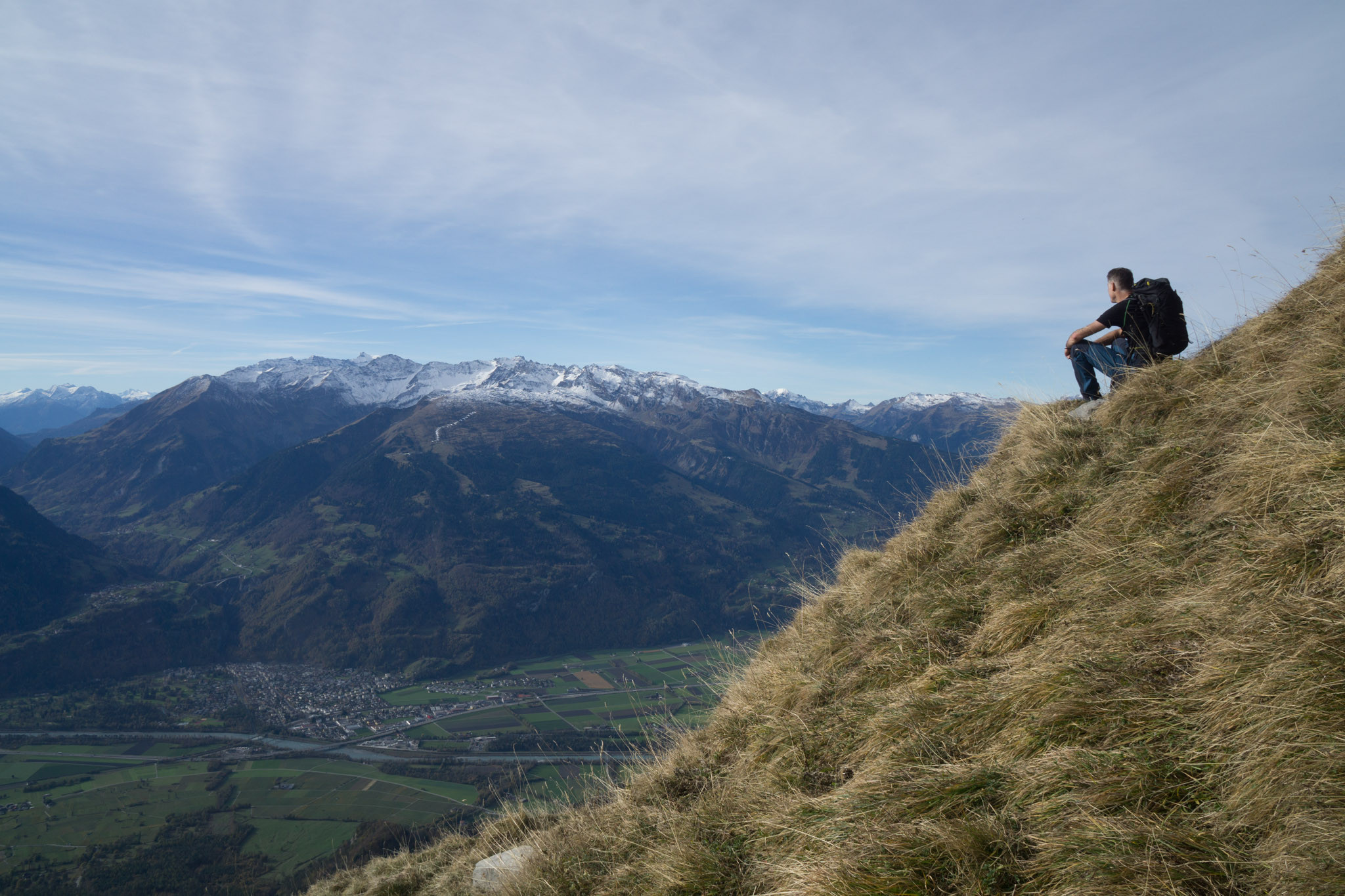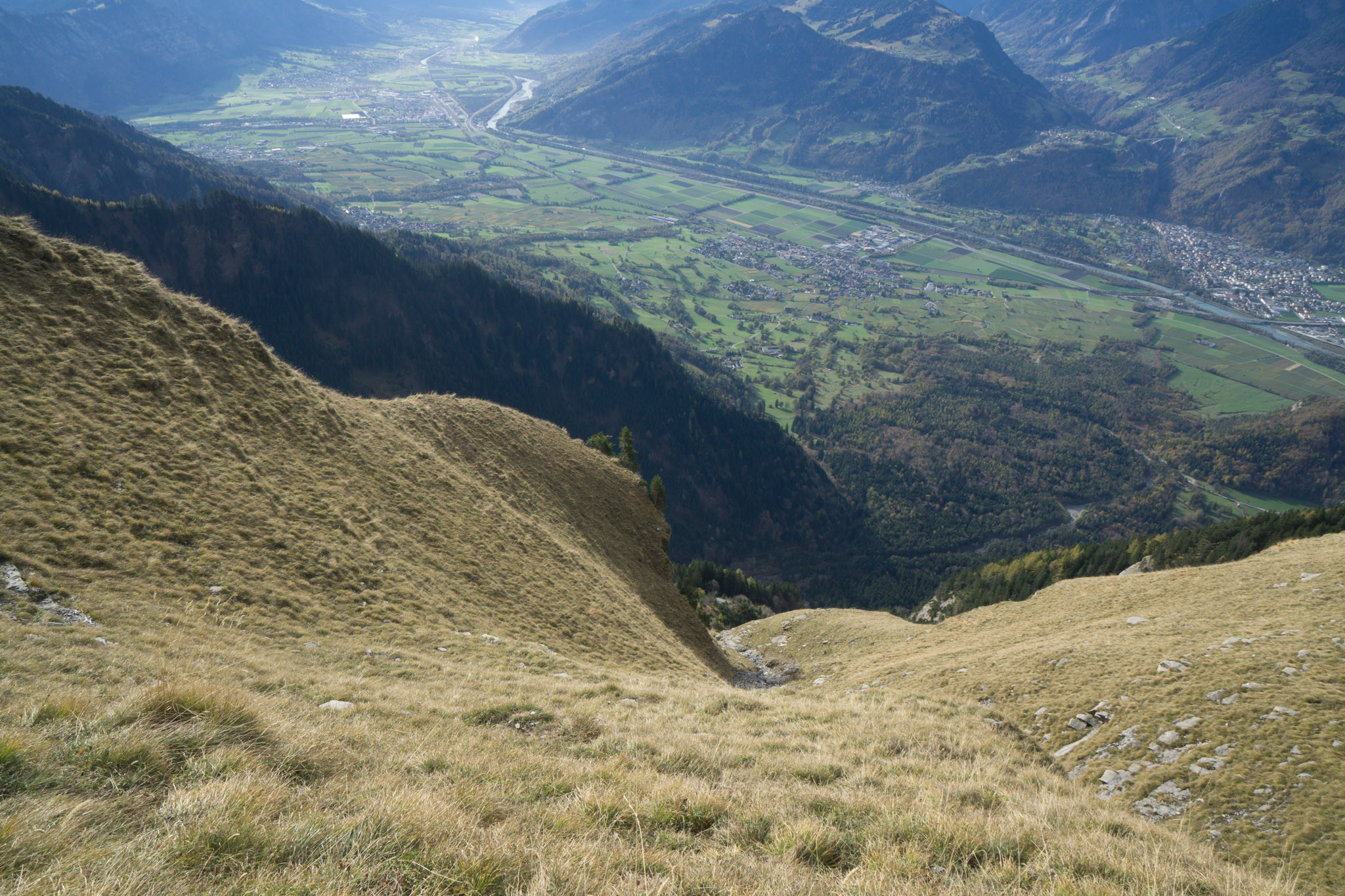 11.11 - per Bahn nach Maienfeld (550m) und von dort zunächst einmal zur Enderlinhütte (1497m). Der Weg geht erst durchs Dorf, dann über Wiesen und recht schnell durch den steilen bergwald zur Hütte hoch. Von dort funke ich erst einmal nach Hause und erkläre, dass ich mit "morgen bin ich bei Buchs" nicht Arbeitsplatz, sondern Maienfeld gemeint habe, ich also in den Bergen rum watschel. Nach einem kurzen Schwatz mit dem Hüttenwirt geht es dann zunächst den Pfad weiter Richtung Fläscher Fürggli. Bei einem Knick auf 1800m dann scheren wir ab und gehen weglos weiter in Richtung Gir. Auf dem Weg dorthin dürfen zwei Rinnen in steilerem Grasgelände gequert werden, technisches Highlight ist eine etwa 10m hohe Grasnase am Grat (Gras, T5, etwa 55-60° steil, exponiert). Problemlos erreiochen wir jedoch dank trockenem Untergrund den Gir (2164m)