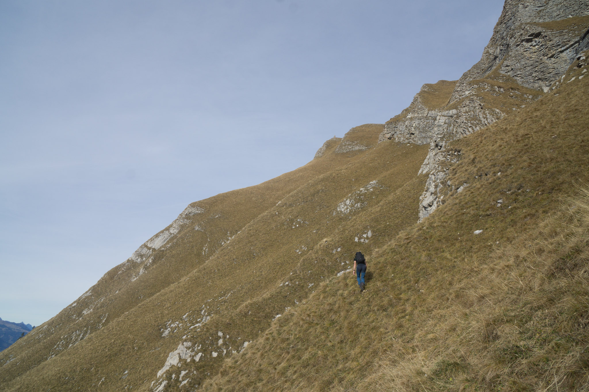 Schlüsselstelle der Tour - reine Graskletterei im Steilgelände