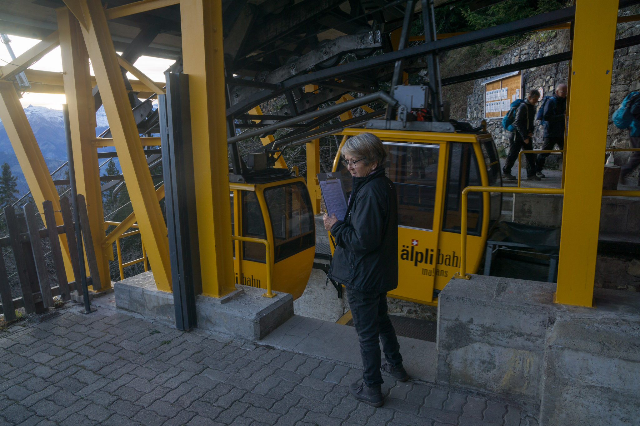 Am Ziel, hier mit Platzeinweierin für die jeweilige Bahnfahrt. Pro Kabine hat es Platz für 4 Personen