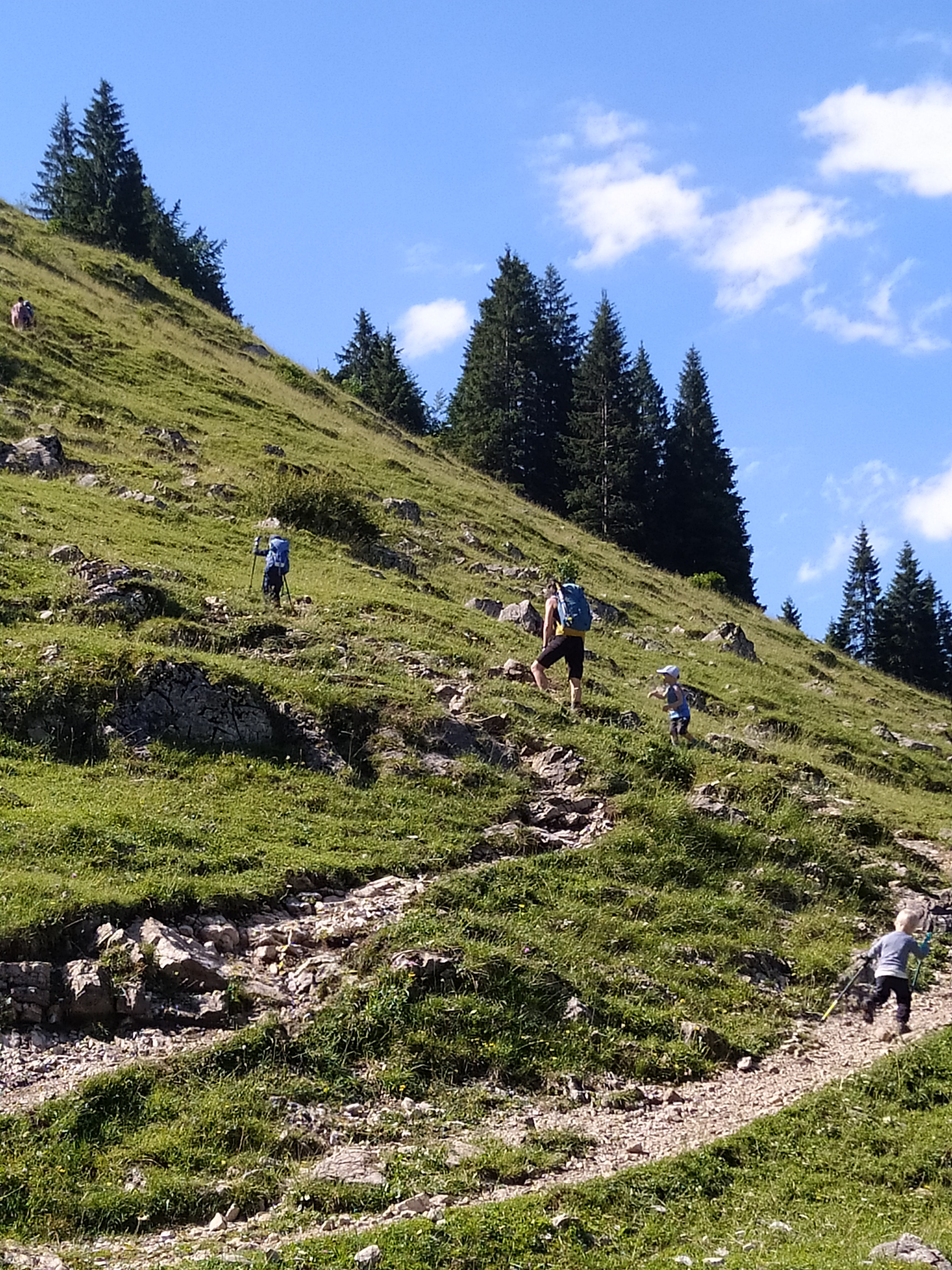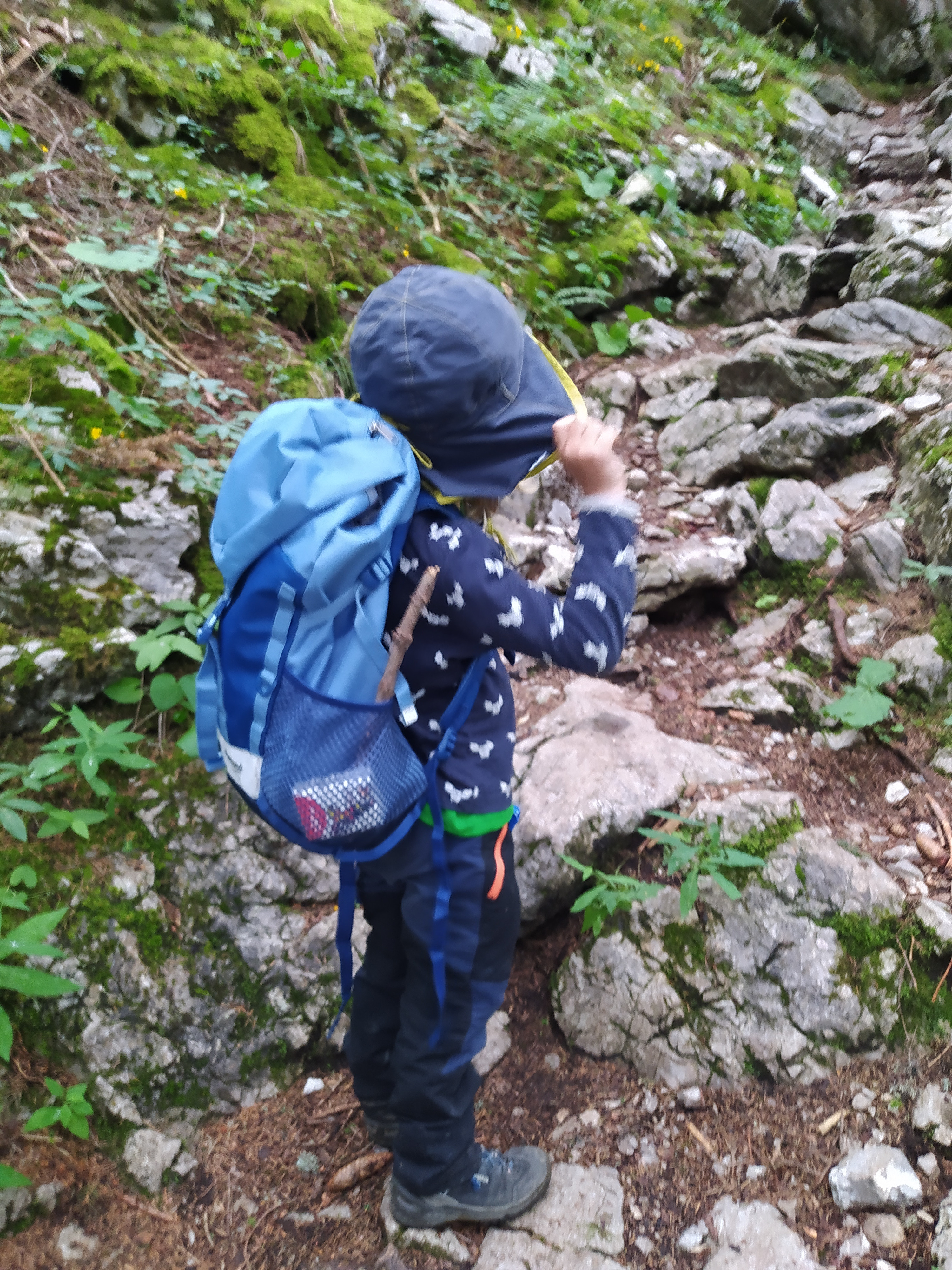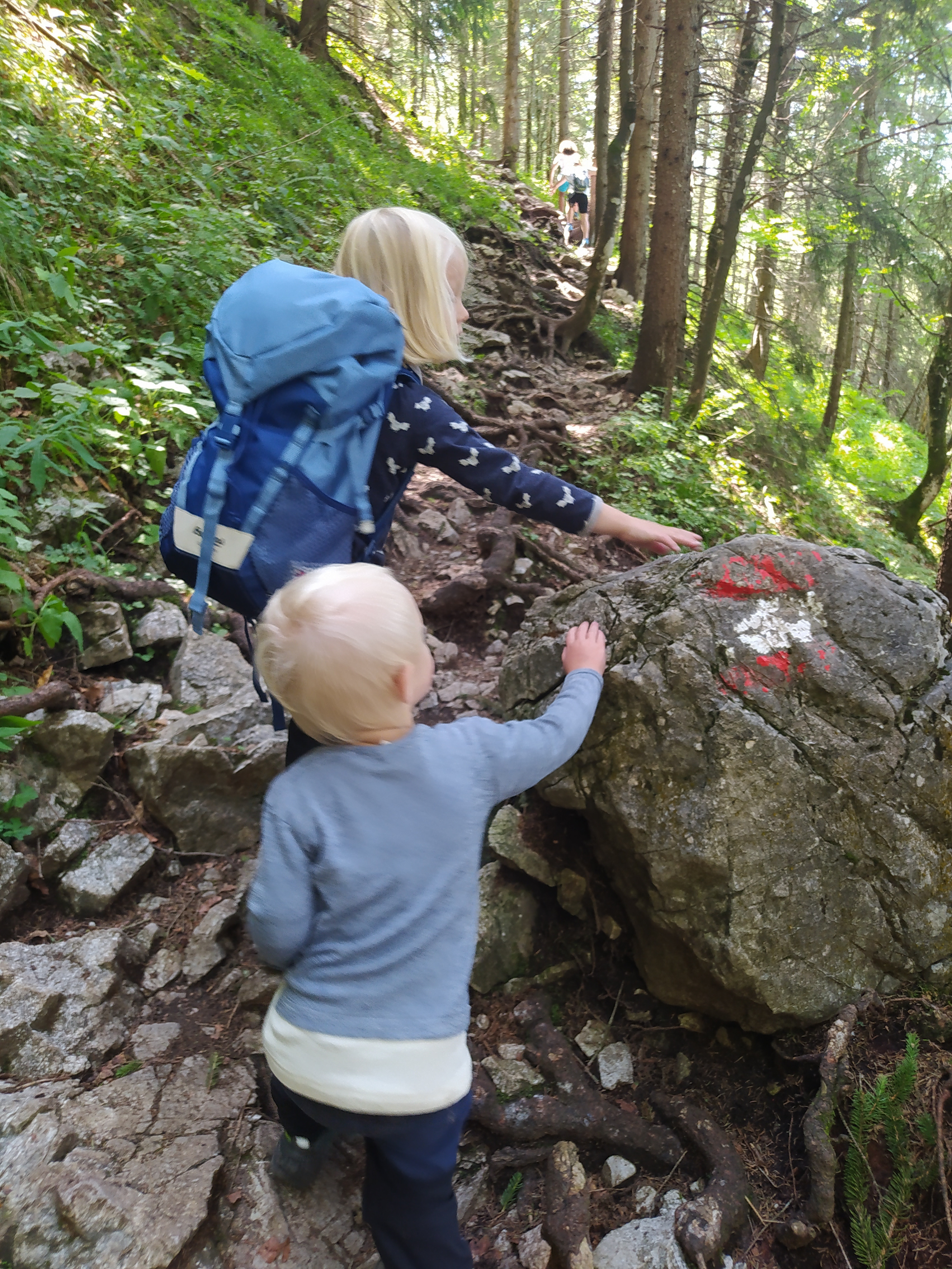 Nach einer kurzer Stärkung in Form von fruchtriegeln und einem Schluck Wasser konnte es dann weiter gehen. Über einen leicht felsigen Weg, der beiden Kindern gut gefiel, legte das große Kind ein ordentliches Tempo vor. Auf dem Weg prallte die Sonne voll auf uns ein, sodass der Weg uns schon einiges abforderte. Da das Gelände nicht zu sehr Absturz gefährdet war durfte er so weit voraus laufen, wie er mich noch sehen konnte. Leider vergaß er zwischenzeitlich im Lauf -Flow wohl nach hinten zu schauen und war nicht mehr sichtbar. Da der Wanderweg relativ gut frequentiert war, bat ich einfach die nächsten Wanderer, die uns überholten, ob sie dem Kind bitte sagen könnten, es solle auf mich warten. An einem schattigen Plätzchen trafen wir uns dann wieder. Mit ein paar kleinen Tranchen, die aus Angst flossen, dass wir uns verloren hätten. Nach kurzem Trösten ging es weiter in den Wald hinein. Endlich Schatten. Es folgten mehrere kurze Pausen während wir über Wurzeln und Steine immer weiter nach oben stiegen. Über Holzbohlen und matsche ging es dann langsam aus dem Wald heraus und die pralle Sonne. Die Stimmung sank rapide. Zum Glück war die Hütte nicht mehr weit entfernt. Und zur Belohnung winkte eine Limo. Nach einer kurzen Schimpferei von allen ging es mit der letzten Power zur Hütte. Angekommen gab es die ersehnte Limo zur Belohnung. Und dazu noch ein Kaiserschmarrn mit Apfelmus für alle. Am Abend gab es auf Wunsch der Kinder die mitgeschleppten Cerealien, eine Pfannkuchen Suppe (Mama du spinnst ja, Pfannkuchen in der Suppe….) Und ein Schweinebraten mit Knödel. Danach fiel ich müde ins Bett, während die Kinder doch noch ein bisschen Energie hatten. Also noch eine Runde Dr. Brumm geht wandern, ein Hörspiel und dann schliefen endlich alle.