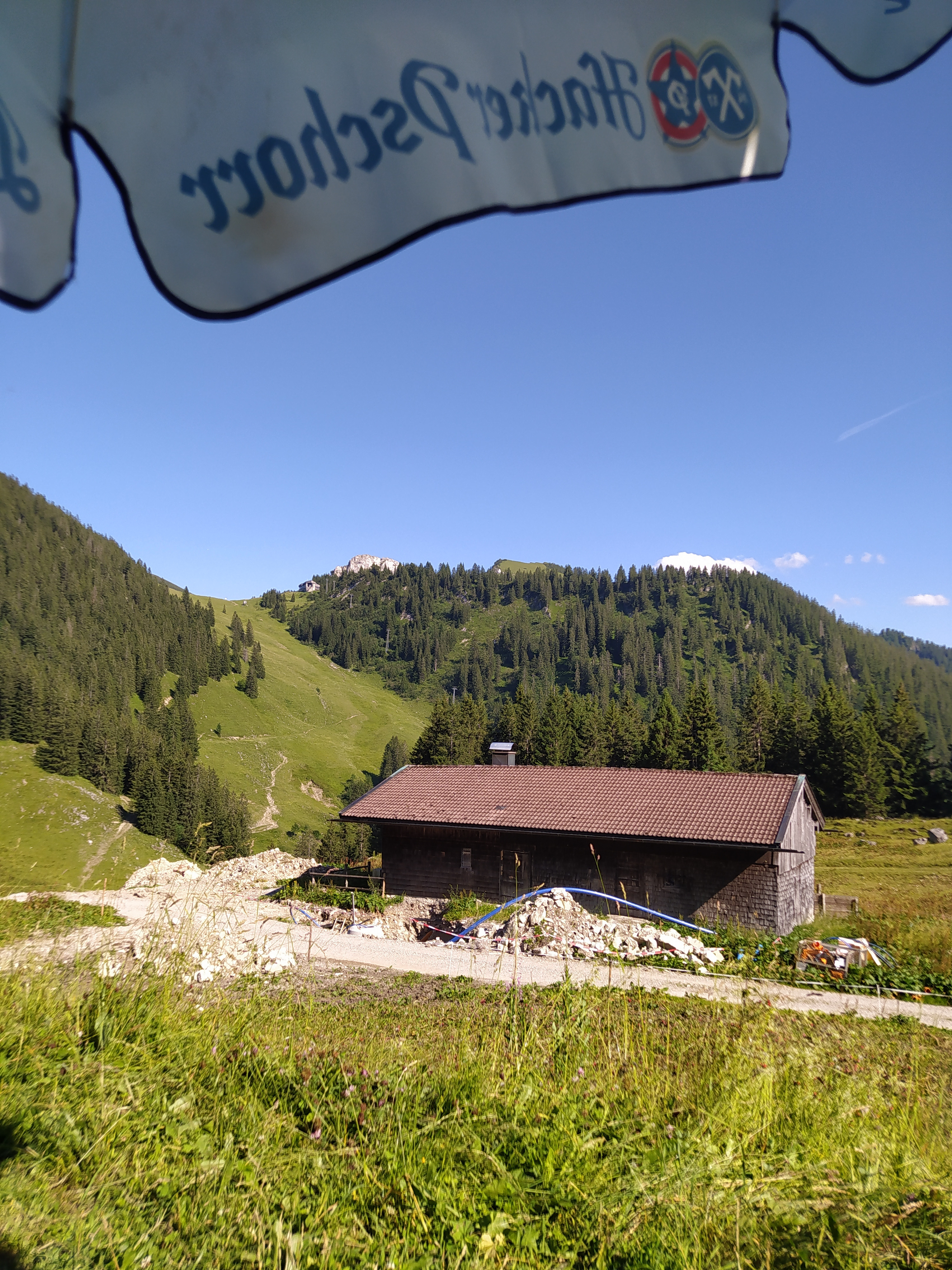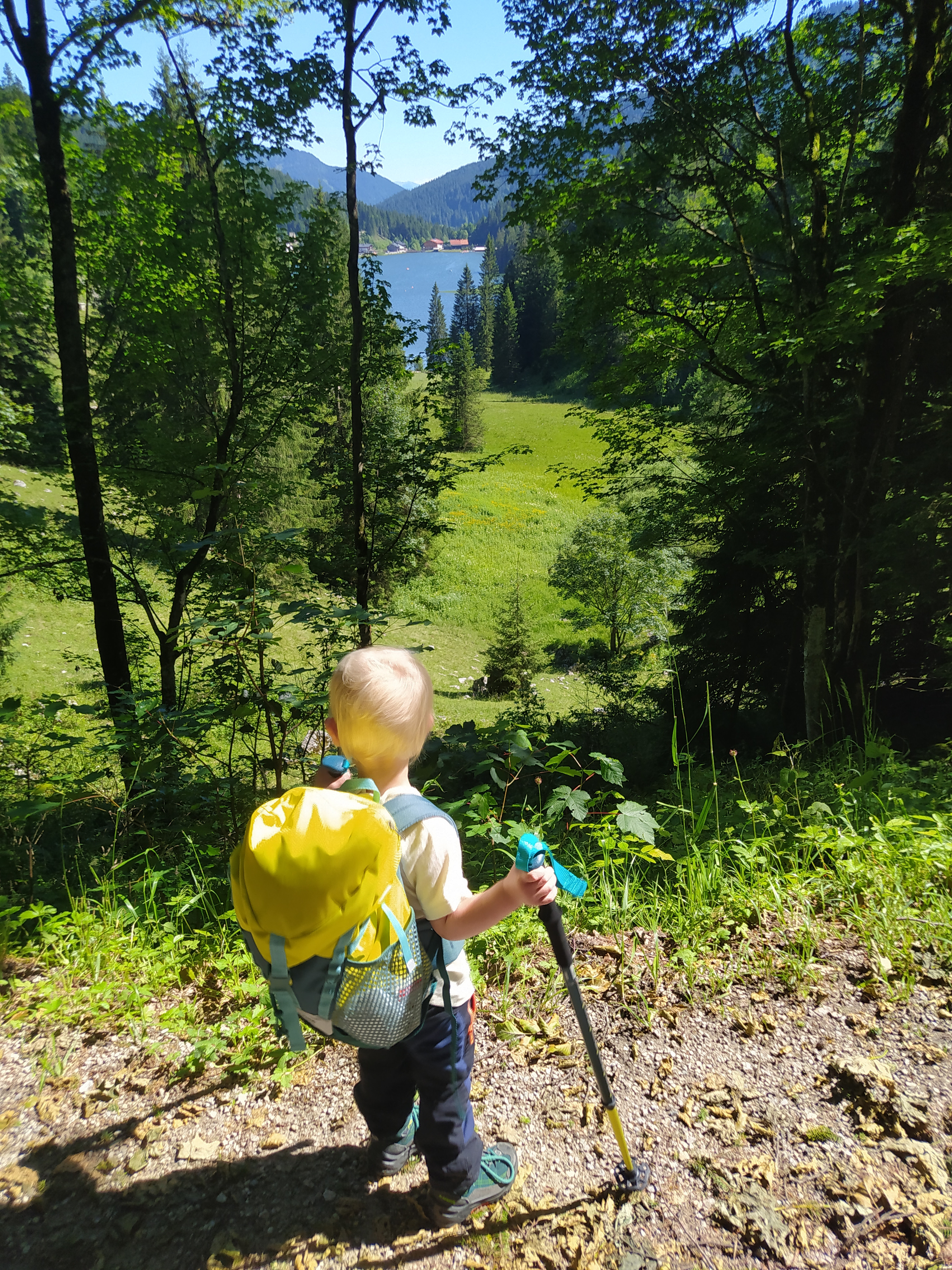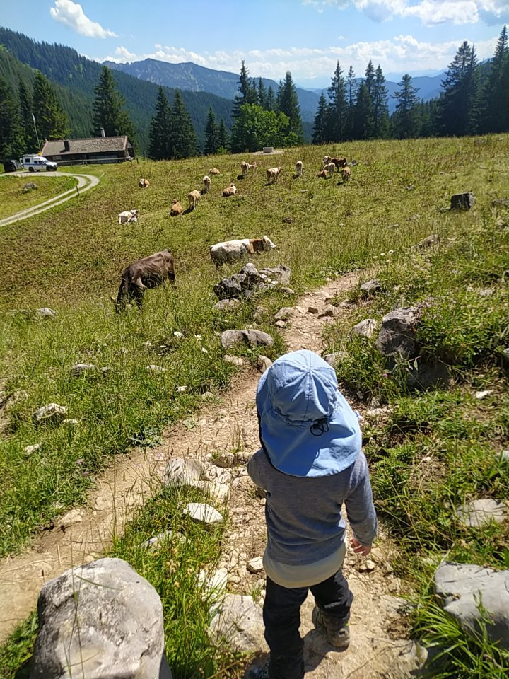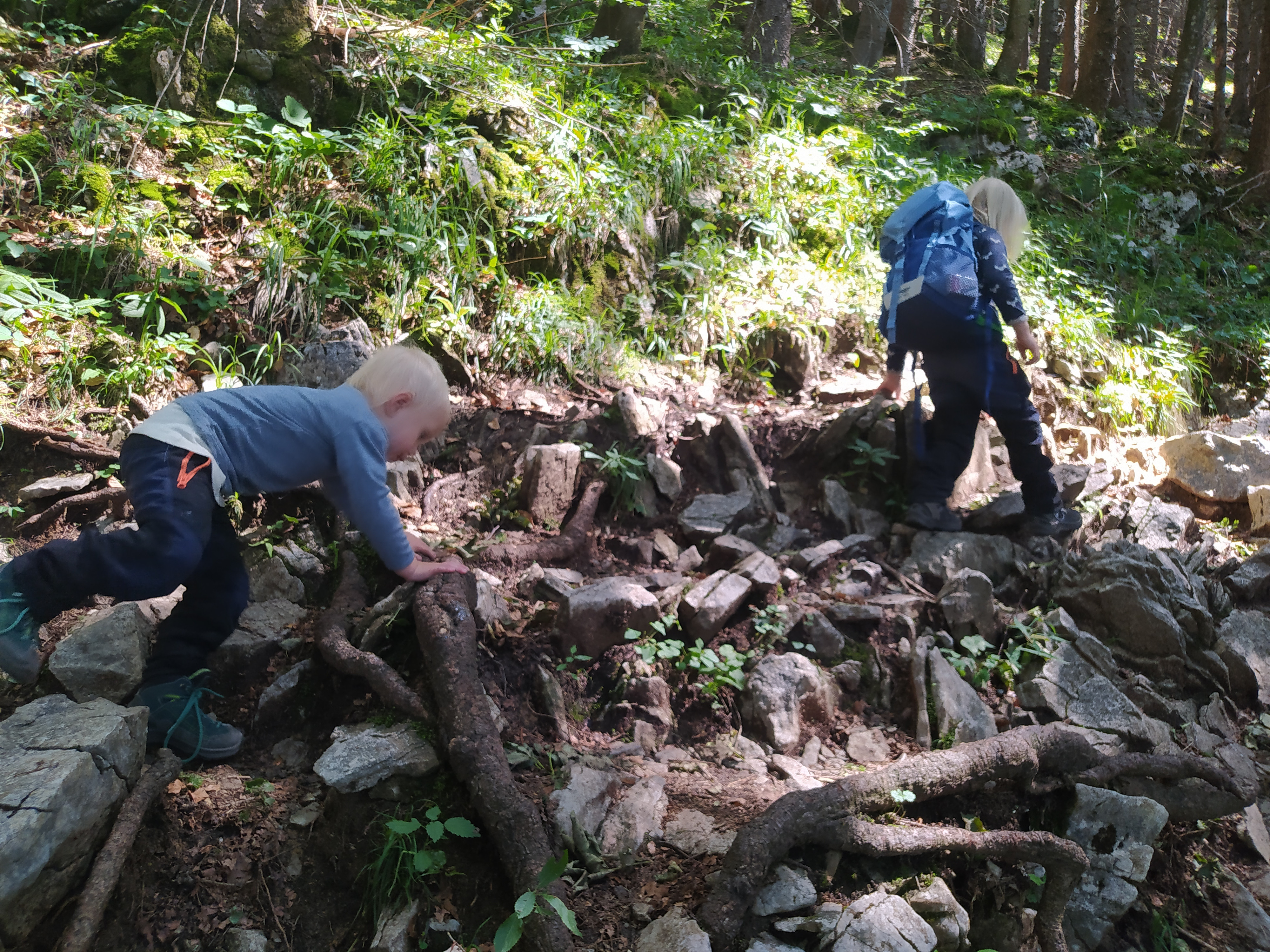 Nach einer kurzer Stärkung in Form von fruchtriegeln und einem Schluck Wasser konnte es dann weiter gehen. Über einen leicht felsigen Weg, der beiden Kindern gut gefiel, legte das große Kind ein ordentliches Tempo vor. Auf dem Weg prallte die Sonne voll auf uns ein, sodass der Weg uns schon einiges abforderte. Da das Gelände nicht zu sehr Absturz gefährdet war durfte er so weit voraus laufen, wie er mich noch sehen konnte. Leider vergaß er zwischenzeitlich im Lauf -Flow wohl nach hinten zu schauen und war nicht mehr sichtbar. Da der Wanderweg relativ gut frequentiert war, bat ich einfach die nächsten Wanderer, die uns überholten, ob sie dem Kind bitte sagen könnten, es solle auf mich warten. An einem schattigen Plätzchen trafen wir uns dann wieder. Mit ein paar kleinen Tranchen, die aus Angst flossen, dass wir uns verloren hätten. Nach kurzem Trösten ging es weiter in den Wald hinein. Endlich Schatten. Es folgten mehrere kurze Pausen während wir über Wurzeln und Steine immer weiter nach oben stiegen. Über Holzbohlen und matsche ging es dann langsam aus dem Wald heraus und die pralle Sonne. Die Stimmung sank rapide. Zum Glück war die Hütte nicht mehr weit entfernt. Und zur Belohnung winkte eine Limo. Nach einer kurzen Schimpferei von allen ging es mit der letzten Power zur Hütte. Angekommen gab es die ersehnte Limo zur Belohnung. Und dazu noch ein Kaiserschmarrn mit Apfelmus für alle. Am Abend gab es auf Wunsch der Kinder die mitgeschleppten Cerealien, eine Pfannkuchen Suppe (Mama du spinnst ja, Pfannkuchen in der Suppe….) Und ein Schweinebraten mit Knödel. Danach fiel ich müde ins Bett, während die Kinder doch noch ein bisschen Energie hatten. Also noch eine Runde Dr. Brumm geht wandern, ein Hörspiel und dann schliefen endlich alle.