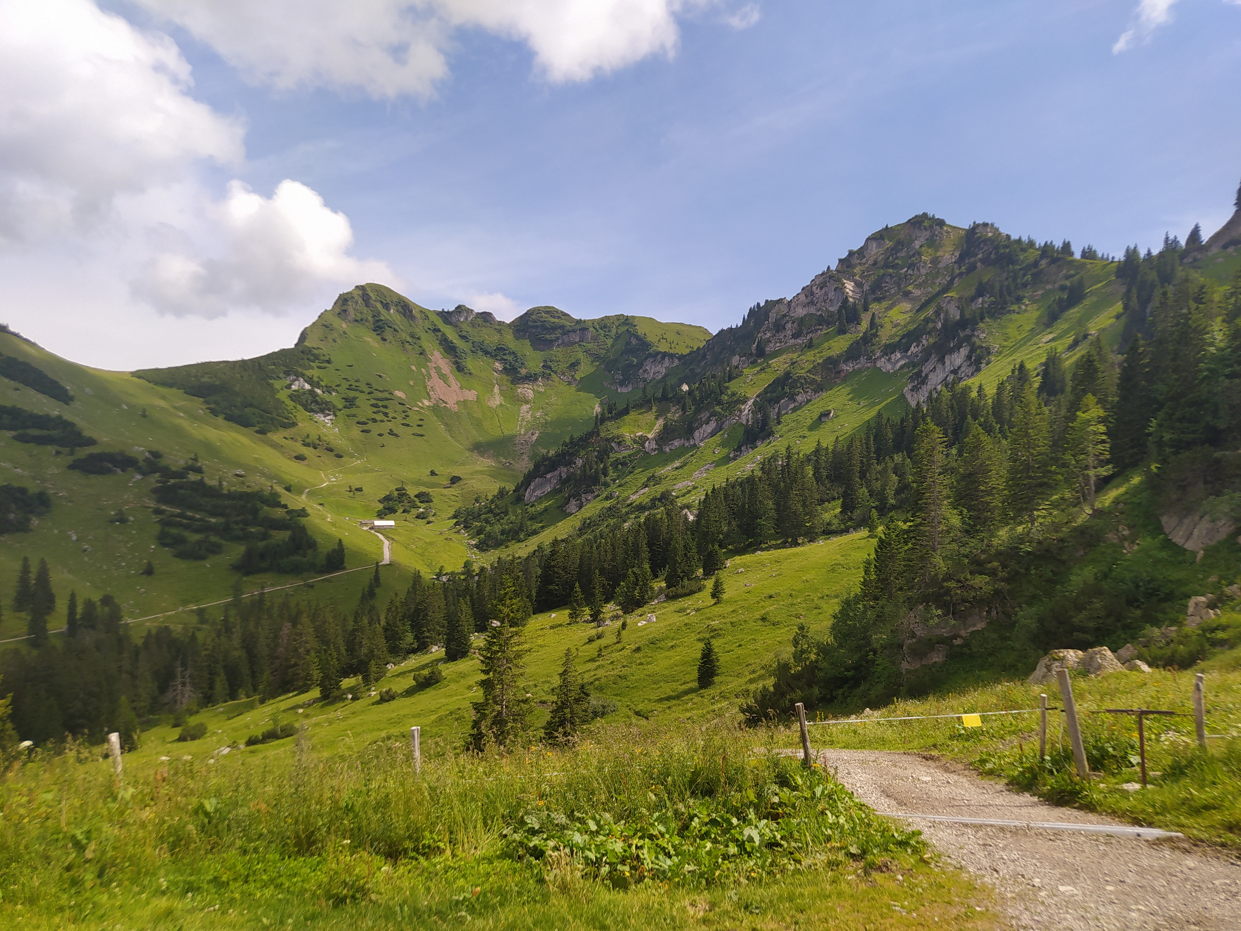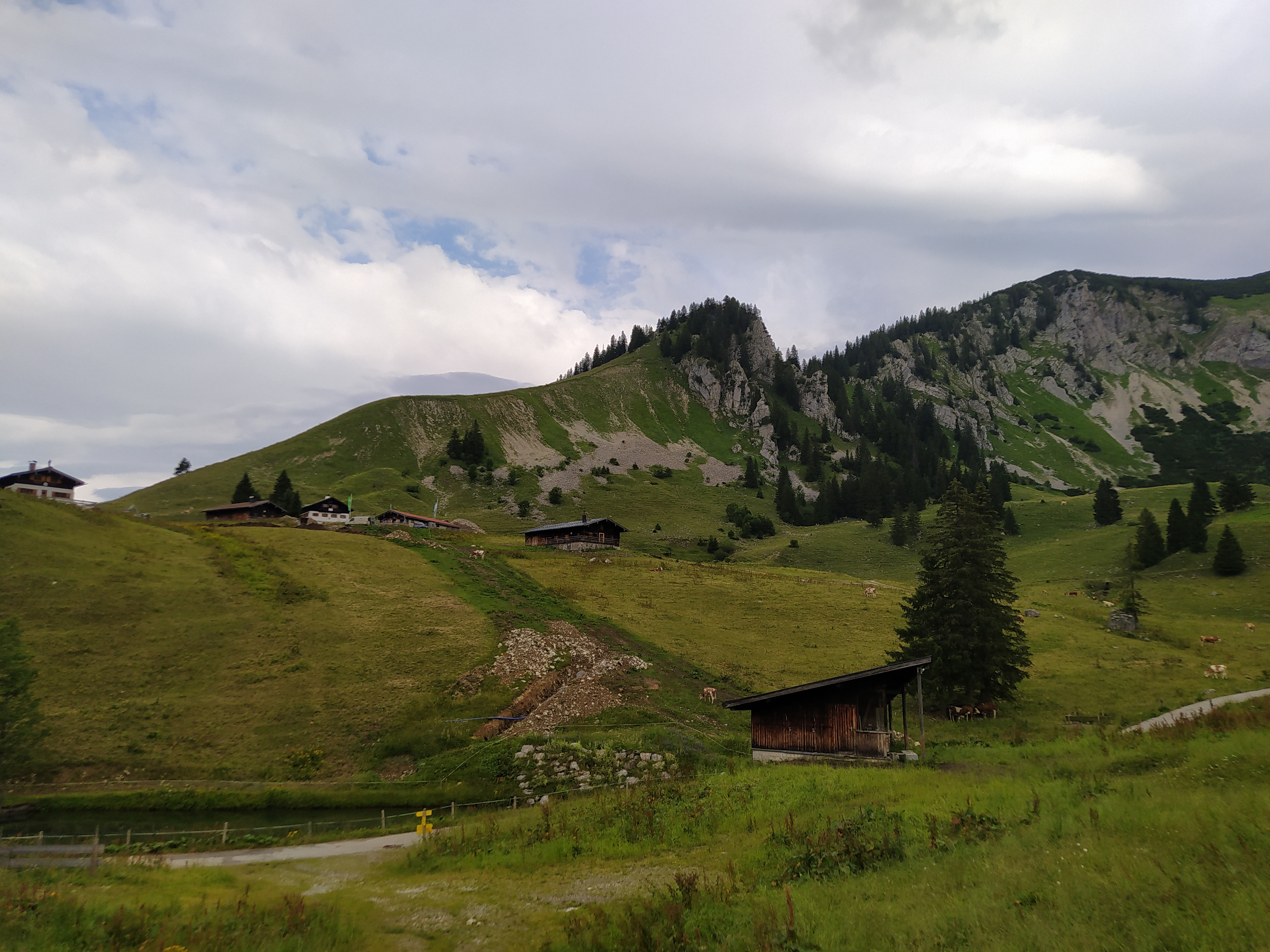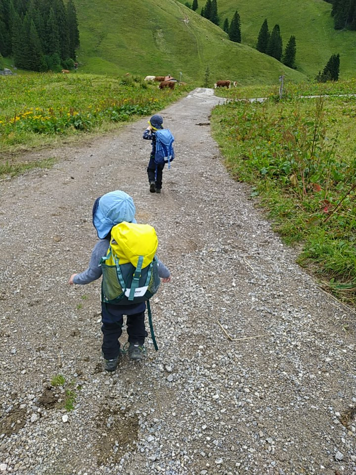 Am nächsten Morgen gab es ein schönes Frühstücksbuffet bevor es wieder in die Wanderschuhe ging. Heute halfen die Kinder bereits beim Packen des Rucksacks, indem sie Schlafsäcke einpacken, Klamotten zusammensuchten und in die Tüten packten, Zähne putzen, Decken zusammenlegten. Dinge, die ich von zu Hause gar nicht kenne . Nach dem obligatorischen Foto vor dem Hüttenschild ging es weiter. Zuerst entlang einer Zufahrtsstraße, vorbei an Kühen. Dem kleinen Kind kam dann ein tolles Spiel in den Sinn. "Laufe möglichst durch jeden Kuhfladen, der auf dem Weg liegt." Naja mein Favoriten Spiel ist das nun nicht und so mussten wir, als das Kind dann später nicht mehr laufen konnte improvisieren. Immerhin hat er durchaus den halben Weg alleine gemeistert. Von der Zufahrtsstraße ging es einen Wiesenhang hinauf in den Wald. Eine kurze Pause mit Weingummi, Kinder Cards und Quetschis sorgte für die nötige Energie zum weiterwandern. Über Wurzeln und Steintreppen ging es immer weiter bergauf, bis das kleine Kind nicht mehr konnte. Super. Schuhe voll mit Kuhkacke… also Tüten um die Schuhe und dann ab in die Trage. Zwischendrin gab es immer Mal wieder ein "Ich kann nicht mehr" vom großen Kind, aber mit jedem kleinen Regentropfen, den wir abbekamen ging es dann doch wieder, wollten wir doch nicht im Regen wandern. Als wir den Wald dann verließen fing es jedoch an. Erst nur leicht, als es doch immer stärker würde machten wir eine kurze Pause zum Regenjacken anziehen und Regenschutz über den Rucksack machen. Wie es halt immer so ist … der Regen würde danach weniger. Wir ließen die Station der Bergbahn rechts von uns liegen und sahen schon die Hütte. Die letzten Meter, an den Kühen vorbei, lief sich wie von selbst. Ein paar Rutscher ausgenommen (vermutlich wollte da jemand nur schnell zum Ziel kommen ).
