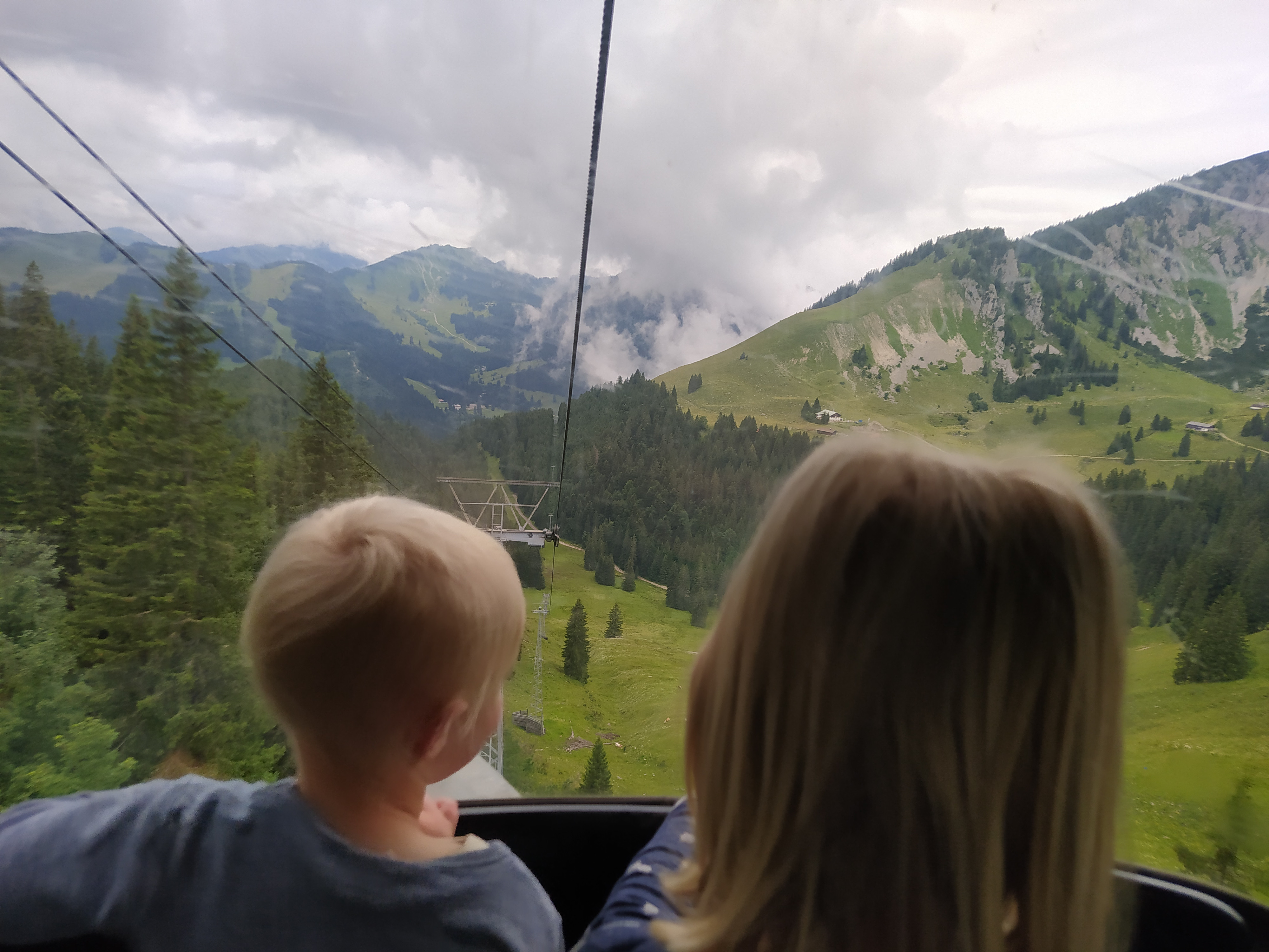 Am darauffolgenden Tag gab es ein sehr leckeres Frühstücksbuffet. Da der Hüttenwirt am Abend sagte, dass er einkaufen fährt fragten die Kinder was. Die Antwort lautete ‘Sachen fürs Frühstück und zum Kochen’ ‘Oh kaufst du Schokokellogs? Und was soll ich sagen, am nächsten Tag standen Schokokellogs auf dem Tisch. Gestärkt nahmen wir dann die 10 Minuten zur Seilbahn auf uns. Dort gab es einen netten Spielplatz. Die Kinder spielten noch eine Runde, bevor wir dann mit der Seilbahn ins Tal fuhren. Mit so alten Gondeln bin ich bisher noch nie gefahren. Aber alles ging gut Unten musste Mama dann aufs Klo, weshalb wir um 3 Minuten den Bus verpassten.
