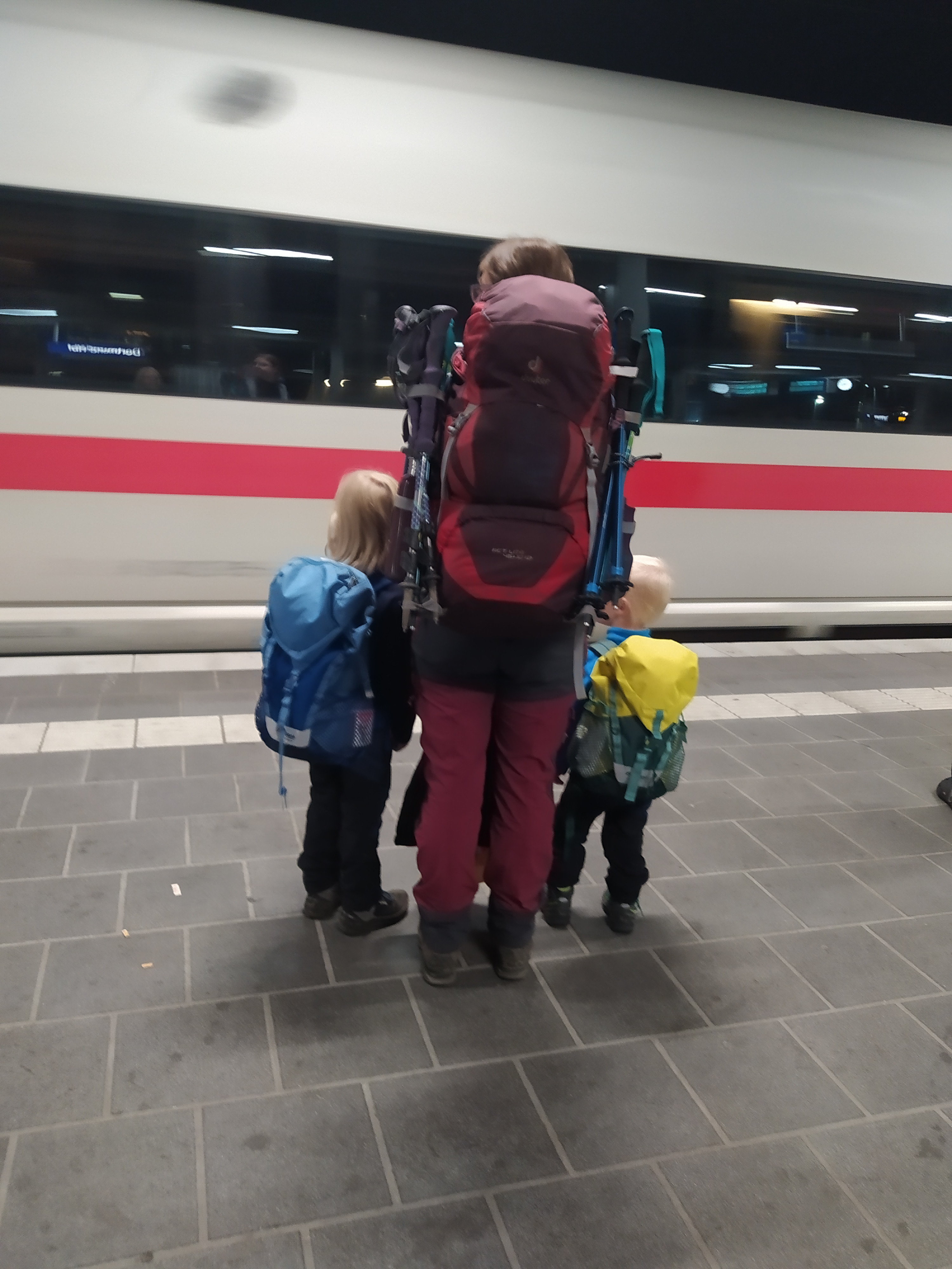 Am Bahnhof angekommen gingen wir zu unserem Gleis. Sitzplätze hatte ich reserviert. Im Familienbereich. (Ich war davon ausgegangen, dass der gesamte Wagon Familienbereich ist. War er aber nicht. Gerade einmal die Hälfte war Familienbereich. Ich muss sagen, da dachte ich mir wirklich "nicht mein Bier. Ich sorge jetzt nicht für stetige Ruhe nur weil die Bahn das auf ihrer Seite falsch erläutert." Es gab auch keine Beschwerden und Augendrehen habe ich keines wahrgenommen . Die Zugfahrt verlief ohne größere Probleme. Leider war das Bord Bistro wegen einer technischen Störung defekt sodass wir unser Kindergeschenk dort nicht abholen konnten (Kinder erhalten vom Schaffner ein Kinderticket mit dem sie sich im Bordbistro einen kleinen Spielzeugzug und ein Heft abholen können). Der Fünfjährige (na gut, in ein paar Tagen sechs ) hat die 5h im ersten ICE super gemeistert. Er hatte sein Tablet dabei und WLAN im Zug. Der kleine (2.5 Jahre) wurde irgendwann müde, kam aber nicht in den Schlaf. Er lief gerne den Gang auf und ab und im größeren Freibereich tobten die beiden Kinder auch zwischendrin Mal. Insgesamt eine ganz gute Fahrt. Klar, dass beide Kinder bei 5h irgendwann Mal unruhig und muffig werden. Aber Weingummi Schnüre konnten die Stimmung schnell heben. (Ja mit essen spielt man nicht, aber wenn es danach noch gegessen wird, so what!?) Beim Ausstieg in Nürnberg wurde ich auf dem Bahnsteig direkt von einem Bahnmitarbeiter gefragt ob ich Hilfe benötige. (Helfende Hände oder so ähnlich hieß der Service. Anpacken bei Kinderwagen, Rollstühlen etc.). Zur Beschäftigung durften sich die Kinder noch eine Süßigkeit am Automaten ziehen. Und dann kann natürlich der Satz der Sätze "Mama ich muss aufs Klo" Schweißausbrüche. Schaffen wir es bis der Zug kommt zum Klo oder nicht!? Kannst du noch einhalten? Ja geht noch. Gut dann warten wir auf den Zug. Eingestiegen. Ein weitaus schönerer ICE. Neuer. Diesmal mit Kindern im Familienabteil. Leider fuhren wir diesmal nur 1h mit diesem Zug. Der hätte mir für die 5 h wirklich besser gefallen. Also, Plätze eingenommen (zum Glück reserviert. Waren zwar belegt aber die Herren mussten dann eben aufstehen). Taschen abgelegt und dann, ab zur Toilette … oh nein. Toiletten gesperrt. Ab zur nächsten Toilette. Die war zum Glück in Ordnung. Nochmal alles gut gegangen. Danach noch die Kinder Tickets im Bord Bistro eingelöst und dann - endlich - war der kleine so weit. Er legte sich direkt quer auf die Sitzbank und schlief ein. Der Große vergnügte sich währenddessen mit den anderen Kindern im Zug und ich hatte etwas Luft zum Durchatmen. In München angekommen verließen wir den Zug. Da ich Kind 2 kaum wach bekam habe ich ihn in die Trage gepackt. Oh das war wirklich eine gute Idee. Der Bahnhof in München war voll. Vermutlich nichtmal mega voll. Aber alleine mit zwei Kindern, von denen eins gerne abhaut, wirklich anstrengend ohne Trage. Wir hatten uns zuvor schon entschieden in München eine Mittagspause einzulegen und bei MC Donalds essen zu gehen (MC Donalds gehört in jedem Urlaub dazu. Das wissen die Kinder und fordern es ein ). Gesagt getan. Bestellt, Abholzettel erhalten und dann…. Gewartet, gewartet, gewartet. Immer den Monitor im Blick auf dem steht, welche Bestellungen zubereitet und abgeholt werden können…. Nichts… nach einer halben Stunde habe ich dann Mal nachgefragt… "ihre Bestellung stand eine halbe Stunde auf dem Tresen. Jetzt wurde sie gerade heruntergenommen. Wird jetzt neu gemacht" ja gut. Woher soll ich denn wissen, dass die Sache mit dem Monitor nicht funktioniert, wenn er doch dort hängt… alles klar… gegessen und dann weiter zum Regionalbahn Gleis. Kurze Pause eingelegt, bei der die Kinder unruhig wurden. Und das in der Nähe der Bahngleise. Der Horror. Aber ein großes Dank an Medizini. Dort gab es für diesen Monat ein Beilagenposter zum Thema "Was läuft falsch am Bahnhof?". Und so konnten wir mit der Suche nach 30 Fehlern die Wartezeit bis zu unserem Zug überbrücken. Mit den Regionalbahn fuhren wir dann nochmal knapp eine Stunde um dann schnell zur Bushaltestelle zu laufen. Die Umsteigezeit sind genau 3 Minuten. Wir also schnell raus aus dem Zug und die Bushaltestelle gesucht. Um dann festzustellen, dass der Bus zwar in der Stunde davor in unsere Richtung fuhr und in der Stunde danach ebenfalls aber nicht in der Stunde in der wir ankamen. Ahja….Als “Großstädter aus dem Ballungsgebiet ist man so etwas nicht gewohnt. Vor allem nicht, wenn damit geworben wird, dass es nun eine tolle Verbindung von München in die berge gibt. Was solls. Es gab am Bahnhof eine Taverne. Also rein und gefragt ob sie Eis hätten. Ja haben sie. Kinder wählten jeweils einen Becher (mit 150 ml). Mit fiel alles aus dem Gesicht, als die Bedienung 7 Euro sagte. Nun gut. Oma hatte Eisfeld mitgeben. Was soll's. Hauptsache die Kinder sind jetzt ruhig während wir ne Stunde auf den Bus warten. Wie soll es anders sein. Das Eis wurde nicht mal zur Hälfte aufgegessen. Dennoch überbrücken wir die Wartezeit ganz gut. Bis ein Bus kam, wir schnell unsere Sachen zusammensuchten, Kind zwei losrannte, stolperte, hinfiel und mit dem Gesicht bremste. Eine Schürfwunde und eine schöne blaue Beule als Ergebnis. Zum Glück hatten wir Eis zum Kühlen . Es war dann auch noch der Flasche Bus. Nun gut. Stimmung erstmal im Keller, aber weiter geht's. Kurze Zeit später kam der richtige Bus. Viel zu eng für mich mit Rucksack und den beiden Kindern. Naja irgendwie kamen wir durch. Nach 10 Minuten ausgestiegen und dann ging es über eine asphaltierte Straße zur Hütte. Da die Wanderung nun los ging brauchten dafür natürlich beide Kinder ihre Wanderstöcke. Kind 2 lief gemütlich singend "die Wanderung fängt an. Wir wandern jetzt. Jetzt beginnt die Wanderung." Kind 1 etwas grummelig, da er im Bus immer wieder eingenickt ist und dann noch gegen meinen Rucksack lief. Auch die Fragen, ob ich sein Fernglas, seinen Hammer, seinen Meisel oder denn 