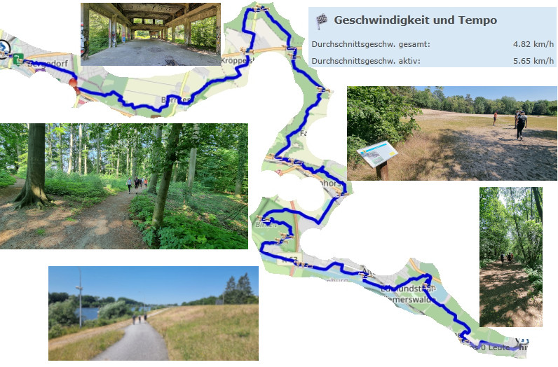 Nochmal hinaus auf die Felder. Eine Shell lädt auf Eis und gekühltes Zuckerwasser ein. Die Sonne brennt. Eine führende 3 macht schon warm. Ein wenig Wald kommt noch. Dann Bergedorf. Ein netter Spaziergang geht zu Ende. Der Häuplting hatte mehr als 5,5km in der Stunde in Bewegung versprochen. Er hat sein Versprechen gehalten.