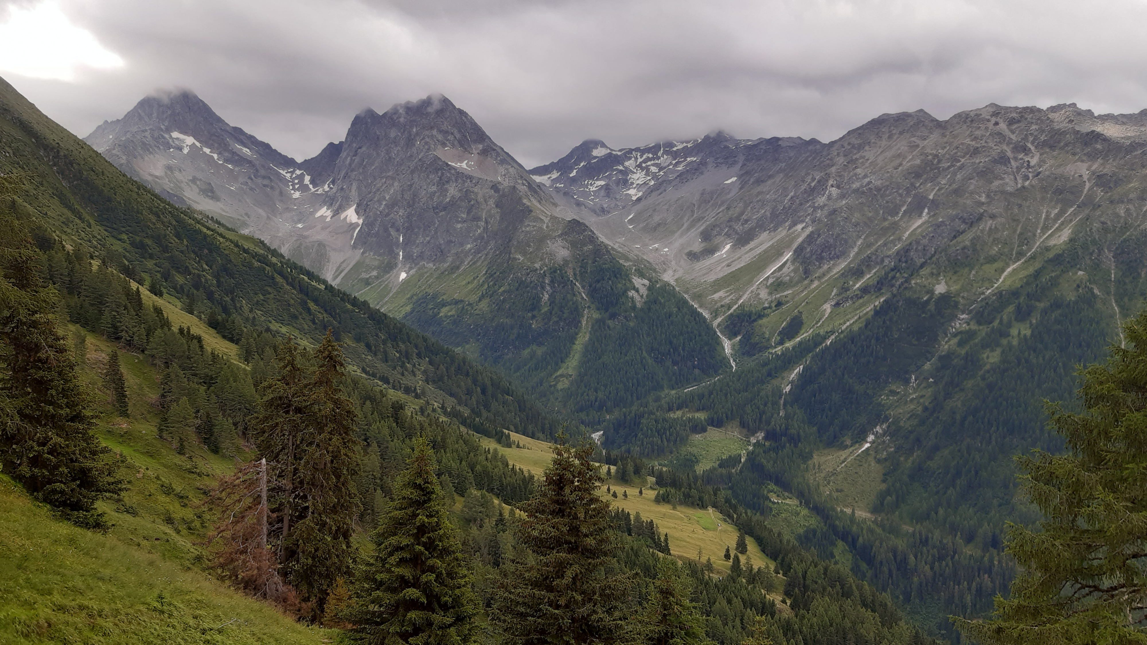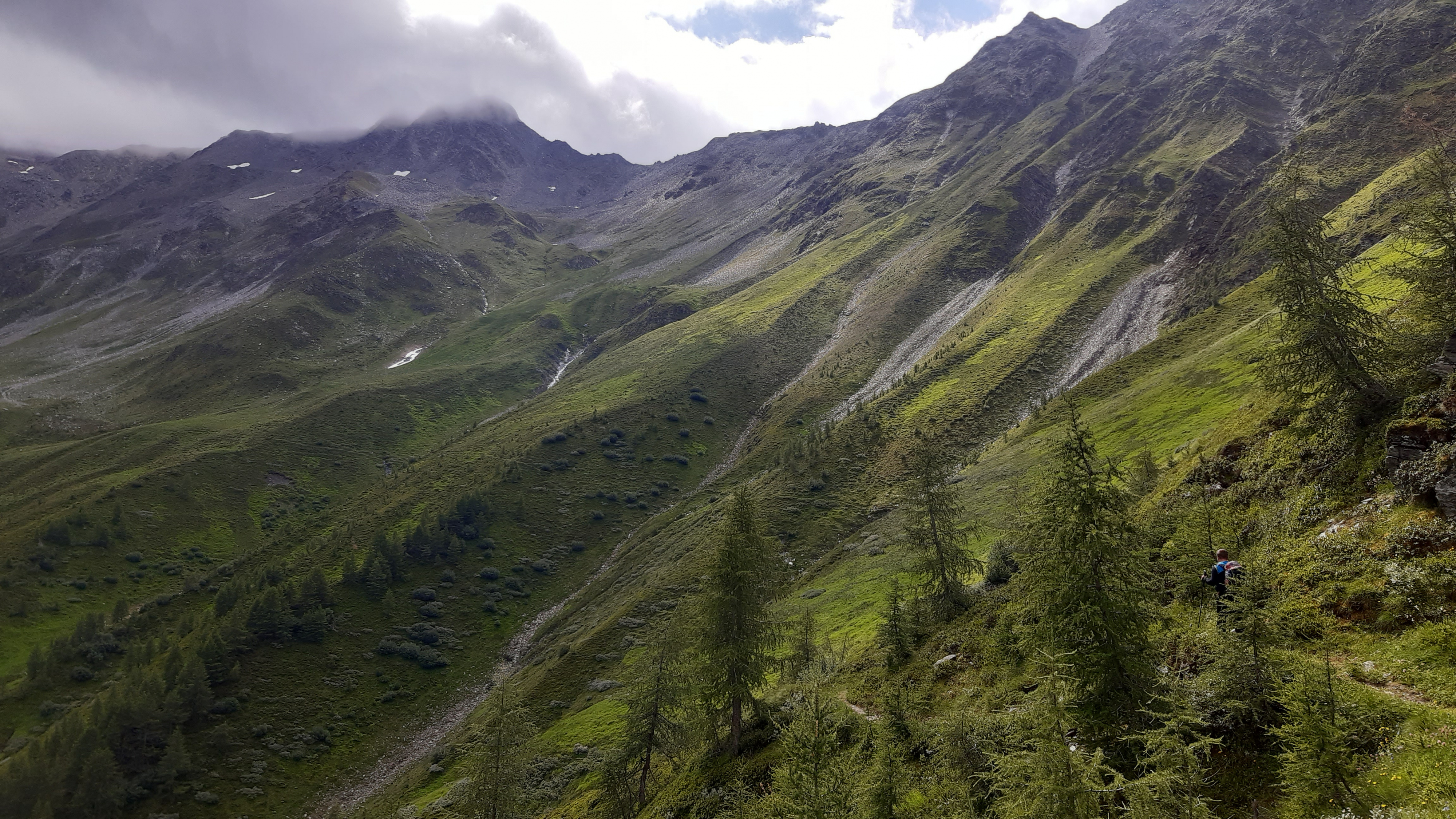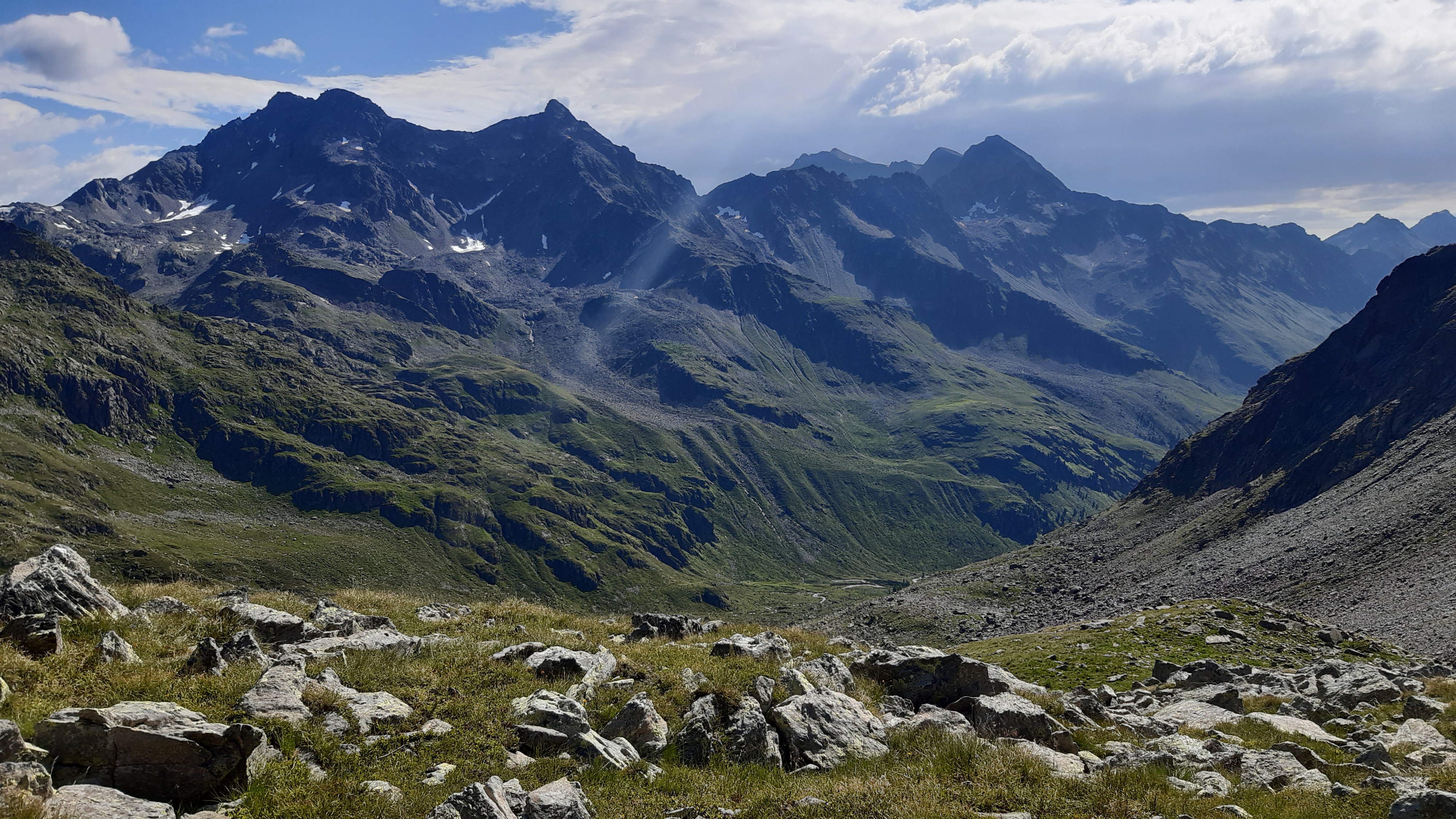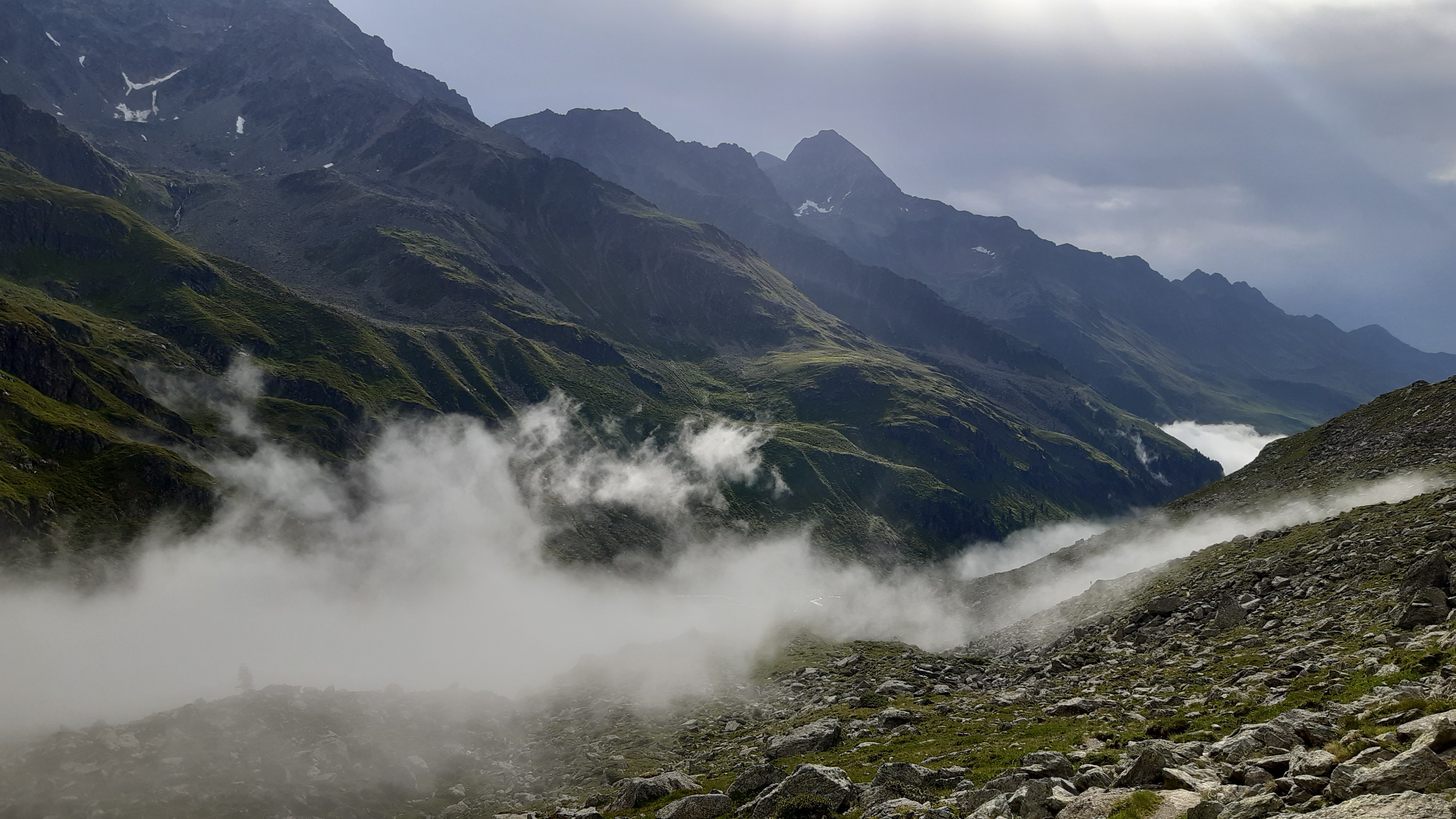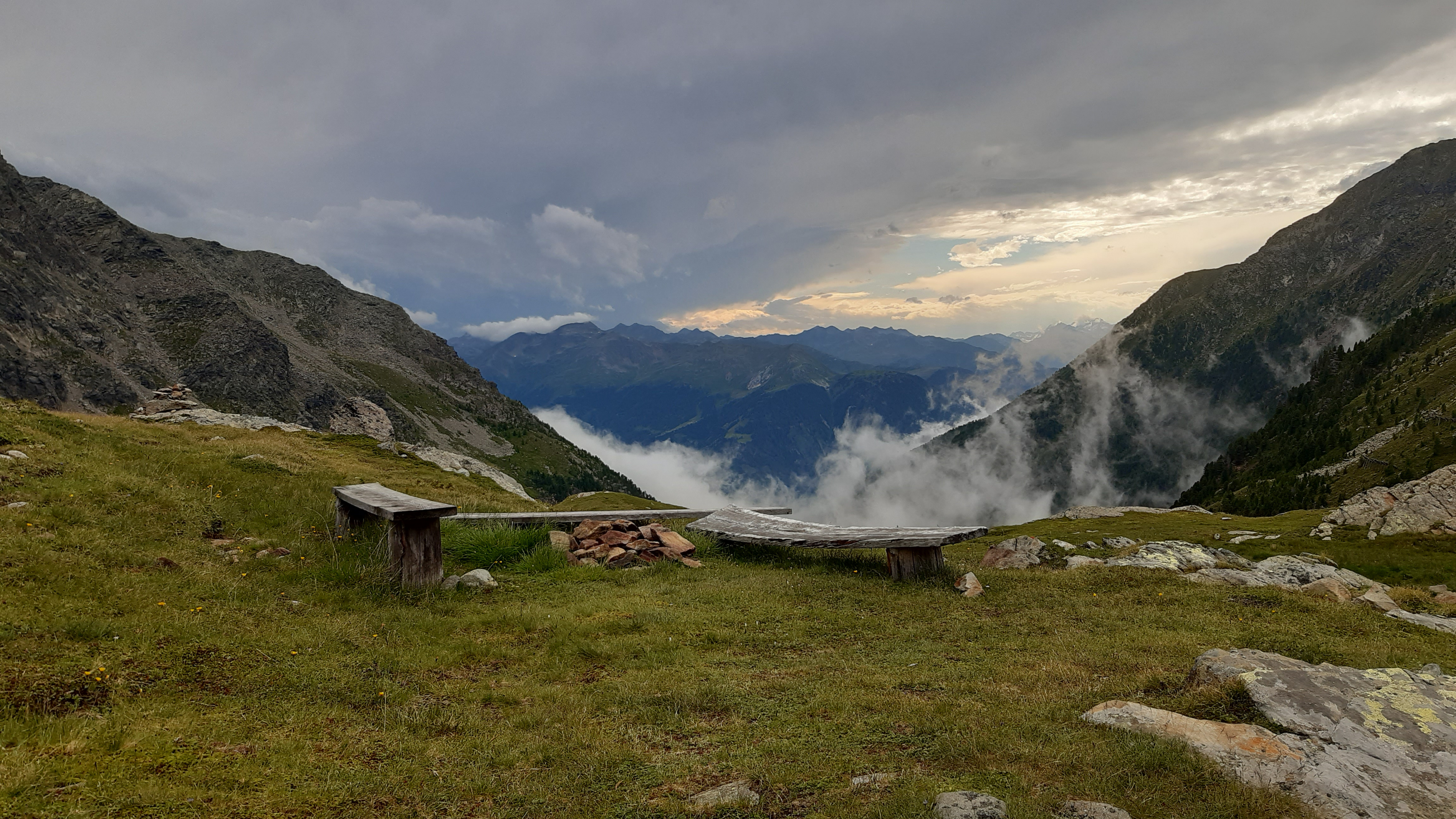 ) Noch ist es sonnig und wir sehen nur wenige Wolken. Allerdings sitzen wir auch in einem kleinen Kessel, der von hohen Bergen umgeben ist.