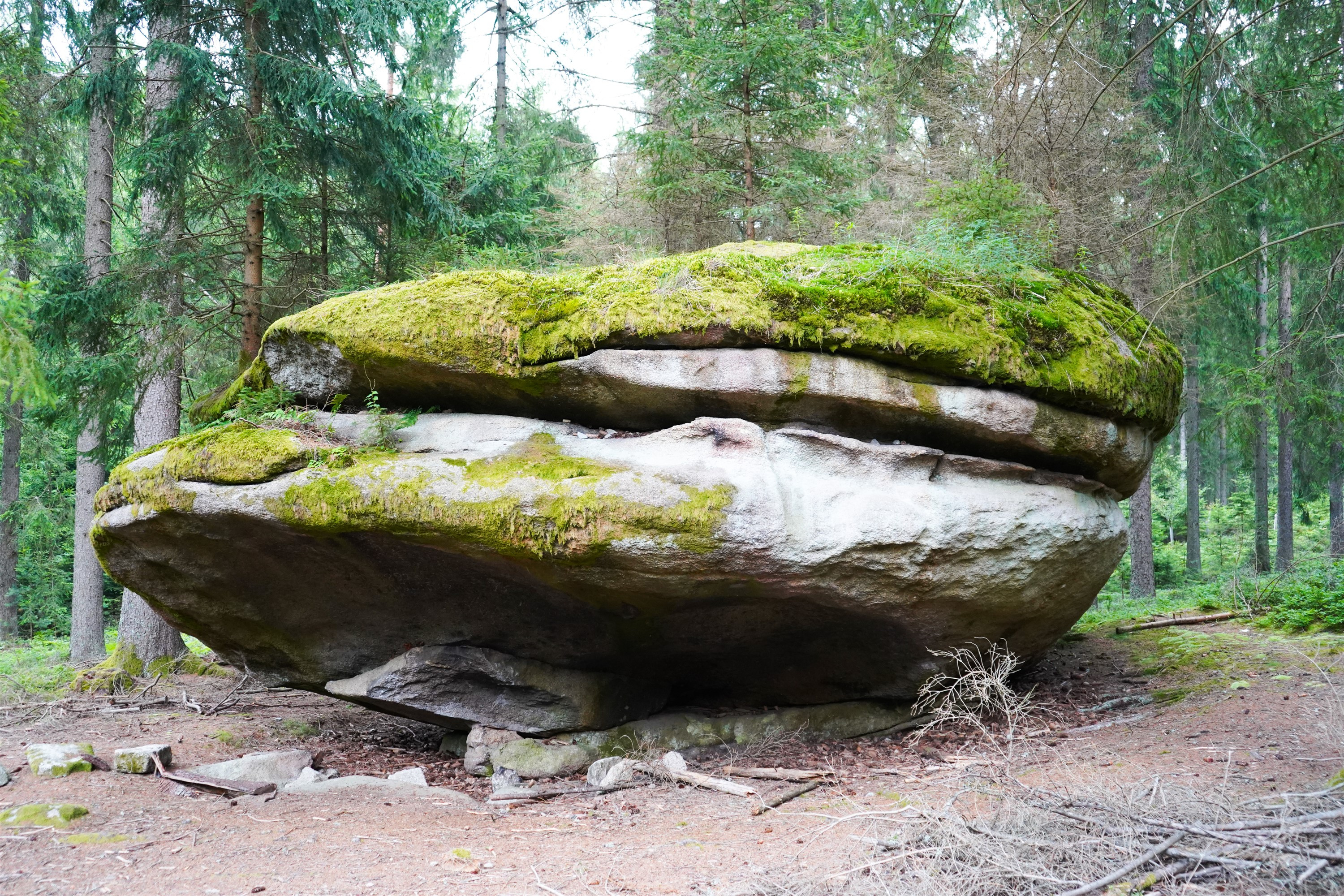 Gmünd und Schrems waren noch eher unspektakulär, doch als nach Schrems ein längerer Waldabschnitt kam, begann der Spaß. Erstmalig sah ich die ersehnten Wackelsteine, und zwar gleich mehrere an der Zahl. Die Stimmung in diesem Waldabschnitt entsprach genau meinen Erwartungen: sie hatte etwas mystisches, einsames, aber auch bedrohliches, nicht zuletzt, weil sich gerade ein Gewitter anbahnte, dessen Donnergrollen ich bereits hören konnte, als ich begeistert mit den Händen einen der Wackelsteine abtastete.