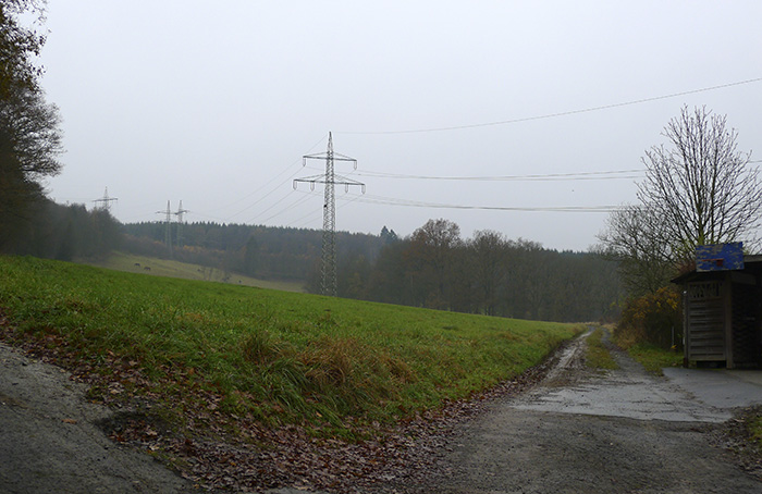 ) überquert, und man wandert nach einem kurzen Stück durch zwischen der Sieg und der an den Dorfrand ausgelagerten großen Verbrauchermärkte wieder nach oben gen Wald, wovor der Weg jedoch abzweigt