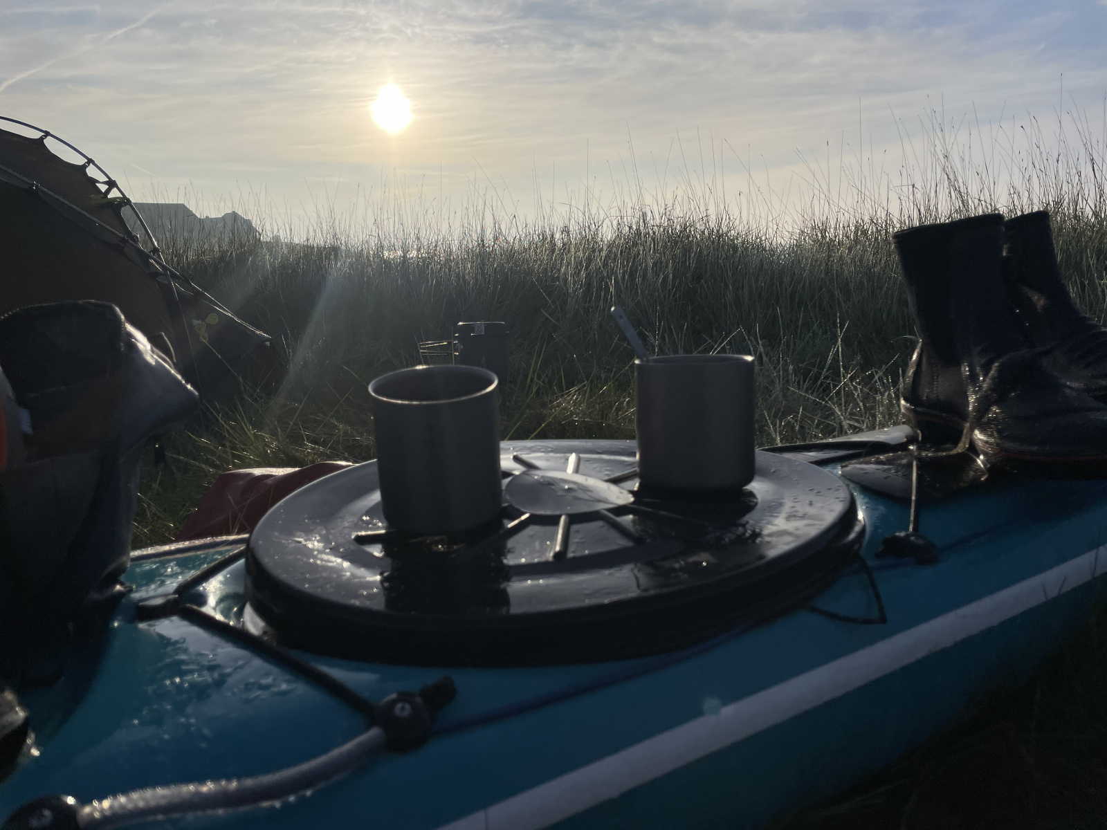 Start war Mittwoch der 30.04. ging es Richtung Norden, Treffpunkt für 9 Paddler war der Hafen Schlüttsiel und die erste Etappe nach Hilligenley auf Langeneß mit knapp 9 Smbei mäßigem Wind und leichter Bewölkung. Wir sind schon vor dem Tiedenkipp losgefahren um in der Abendsonne am alten Anleger die Boote aus dem Wasser zu holen, die Zelte aufzubauen um sich anschließend gemütlich zusammen im Gasthaus kennenzulernen und die kommenden Tage zu besprechen. Der Donnerstag konnte nicht schöner starten, kaum eine Wolke am Himmel, zeigte sich das Wattenmeer in einem sehr schönen Sonnenaufgang. Es blieb allerdings nicht so viel Zeit die Landschaft zu bestaunen, denn die Tiede wartet nicht und die Boote wollen gepackt werden, die nächste Hürde war der Schlick bei Niedrigwasser, oder der Steindamm am Fähranleger, Es gab keinen klaren Sieger, Team Anleger und Team Schlick waren etwa gleich schnell😊