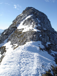 Seit den letzten Schneefällen vor etwa einer Woche scheine ich nämlich der erste zu sein der den Nordanstieg in Angriff nimmt. Das wird mir auch gleich zum Verhängniss. Da sich der Steig nur noch schwer ausmachen lässt versteige ich ich glatt und muss umkehren.