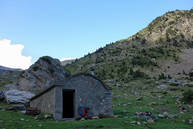 Die vor zwei Jahren neu errichtete Hütte Refugi d'Anglios, schockierte mich etwas mit ihrem durch und durch Metallischen. Aber o.k., wenn nicht nur Verzehrtiere auf Spaltenböden laufen müssen, sondern auch Menschen. Meine Erfahrung: barfuß macht das gar keine Freude.