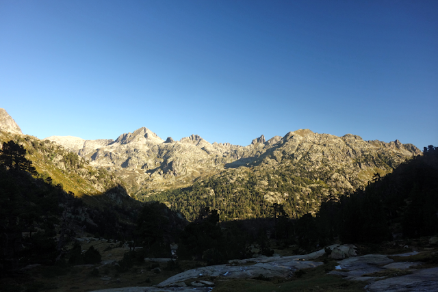 Im morgendlichen Schatten der Berge zu frühstücken, macht nur kalt. So bin ich erstmal eine Stunde gelaufen, bevor mich die ersten Sonnenstrahlen wärmten. Gleichzeitig hatte ich eine Sicht auf die Rückseite des Maladeta-Massivs. Hört sich gut an. Sieht auch gut aus.