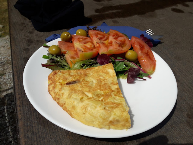 Drinnen war nicht viel los. Als ich ein Sandwich mit Käse bestellen will, sagt mir die Wirtin, dass gerade das Brot knapp ist und ob ich deshalb vielleicht nicht etwas anderes essen wolle, z.B. ein Omelett mit Schinken, dazu Käse und Salat. Hört sich gut an. Ich bin einverstanden und bekomme seit langem mal wieder alles zur gleichen Zeit und alles auf einem Teller serviert.
