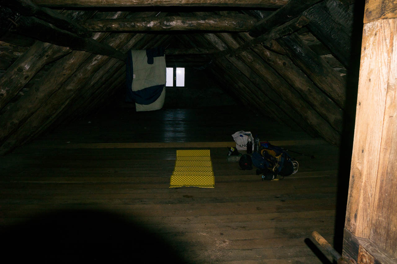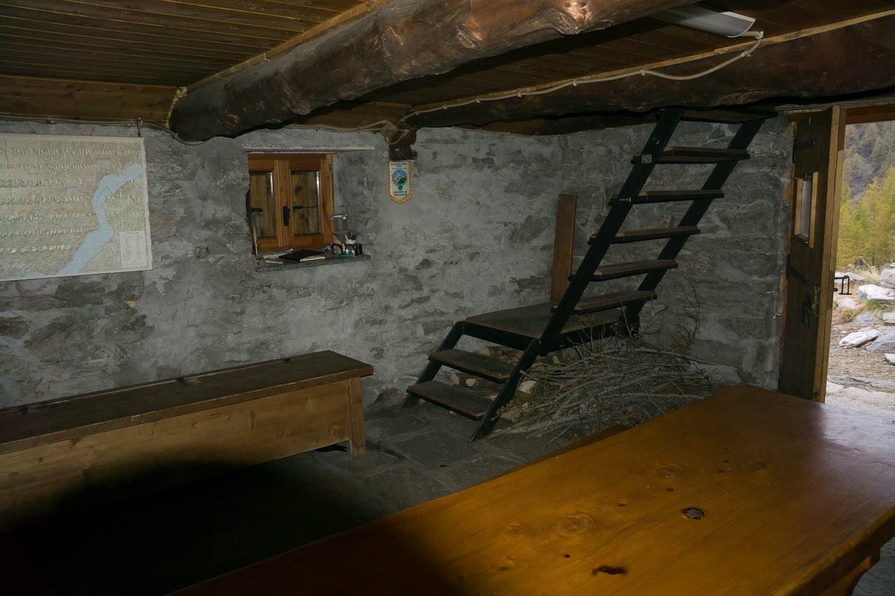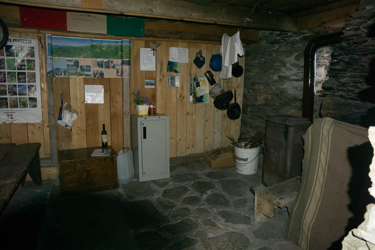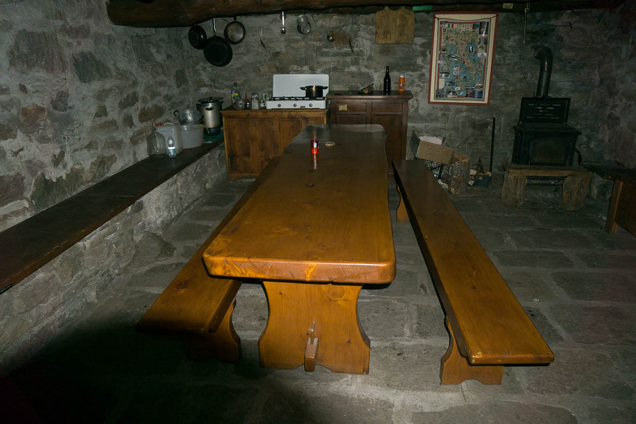 Kurz vor 19 Uhr trudel ich dann doch im Biwak bzw. bei der Hütte ein. Ich bin der einzige, die Hütte ist offen, hat einen netten Aufenthaltsraum mit funktionierendem Gasherd, Geschirr und Besteck, und der Brunnen liefert auch noch Wasser. Sogar Metallgestelle finden sich, auf die man die eigene Isomatte un den Schlafsack legen kann - wie komfortabel. Draussen ist es knapp unter Null Grad und an der Hütte hat es bereits einzelne Schneereste. Abend essen, Bett.