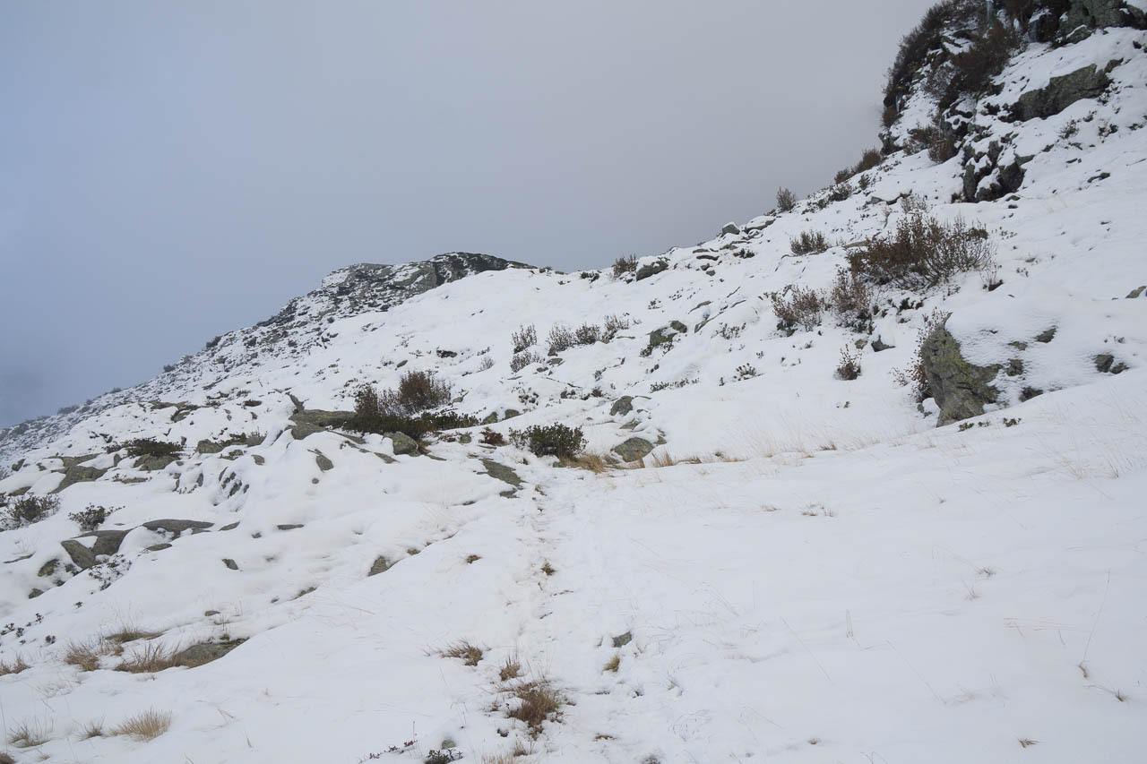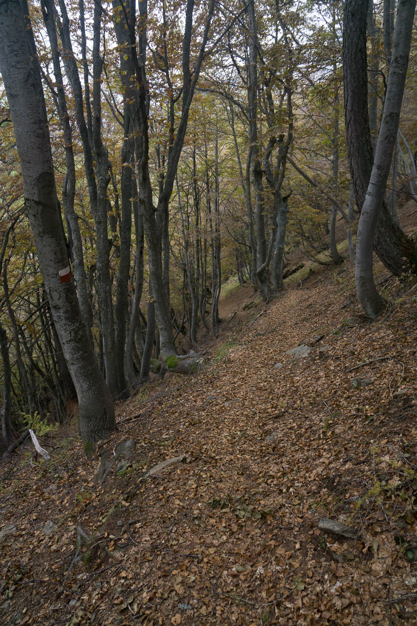 Von dort führt zwar kein Pfad direkt nach Camberto, aber die 2km Umweg nach Osten kürze ich einfach ab, indem ich der Falllinie einem ausgetrockneten Bachbett entlang steil absteige (T4, eine Stelle v. T5). Eine Bewohnerin des Dorfs schaut nicht schlecht, als ich aus dem Gebüsch breche und der Einfahrt ihres Hauses folgend zum Weg weiter watschel. Sie gibt mir jedoch noch die Warnung mit, dass es Schnee hätte, und erst vor kurzem ein Wanderer deswegen wohl in der Ecke abgestürzt sei.