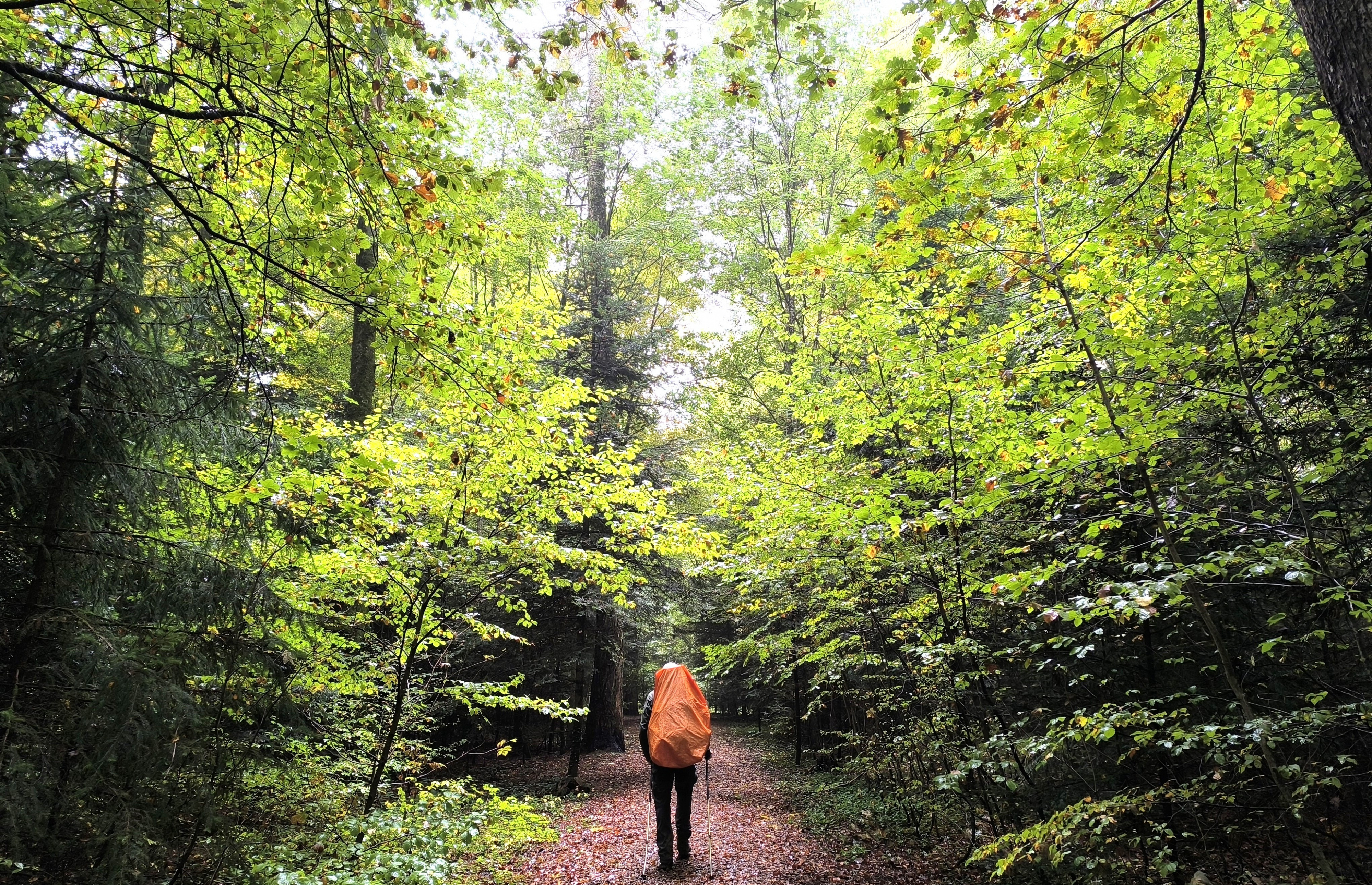 Wir sind schon vor 8 unterwegs, die letzten Kilometer unserer diesmaligen Teil-Tour erwarten uns. Der blaue Himmel der letzten Tage hat sich bezogen und es tröpfelt dann und wann. Der "GR 5-Urwaldpfad" durch die Schluchten des Doubs nimmt uns direkt wieder gefangen.