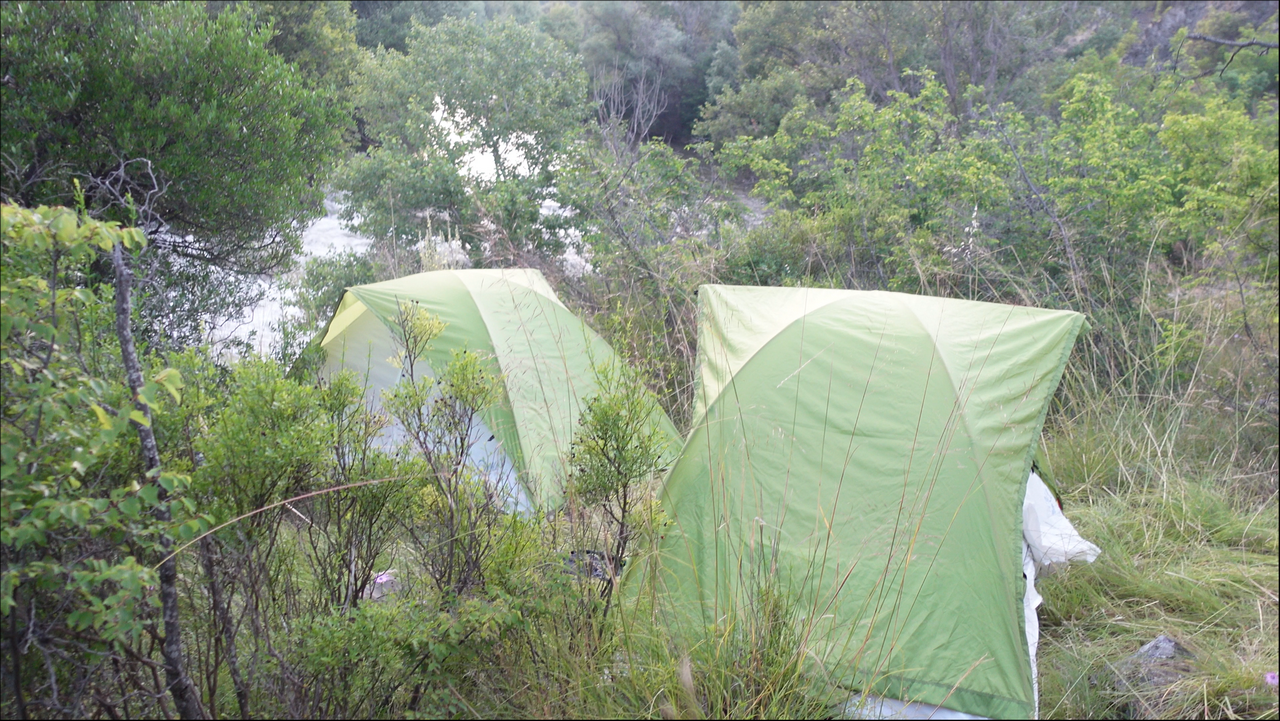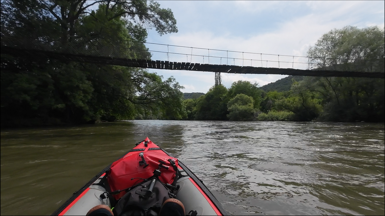 Weiter ging es durch die Taor-Schlucht und die erste von zwei Hängebrücken kündigte die Mündung der Pchinja an. Dort am Mündungsdreieck wäre auch ein potentieller Übernachtungsplatz - dachte ich - und war verwundert dort zwischen den Bäumen einen Wohnwagen zu entdecken. Wie auch immer der dort hingekommen sein mag.