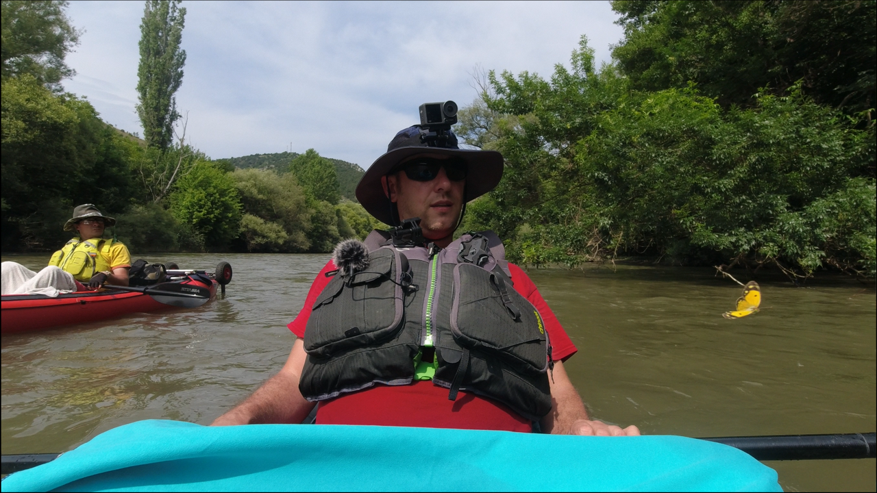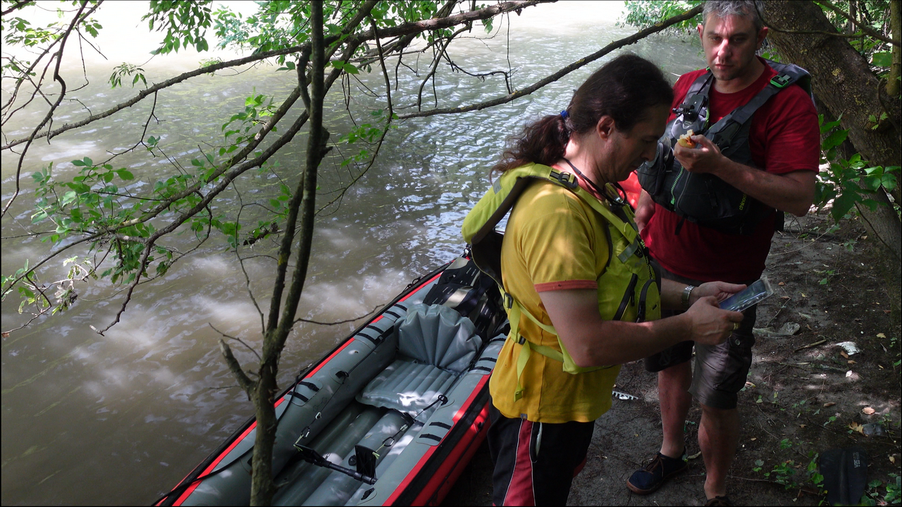 Als ich endlich im Boot saß stellte ich erschreckt fest, dass sich mein Handy nicht im vorgesehenen wasserdichten Beutel in der Tasche meiner Schwimmweste befindet, sondern ein feuchtes Dasein in meiner linken Hosentasche fristet und somit einmal komplett unter Wasser war. Die Erleichterung ist groß: das feuchte Stück Technik funktioniert noch einwandfrei, nun also offiziell im Vardar getauft. Glück gehabt!