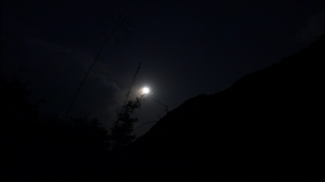 Nach der Sonne ging gegen Mitternacht auch der Mond unter, bzw. verschwand dieser hinter dem gegenüberliegenden Gipfel und wir gingen ins Bett. Am Rande haben wir von den nächtlichen Regenfällen und dem über uns ziehenden Gewitter etwas mitbekommen. Im Großen und ganzen haben wir aber geschlafen wie die Babys.