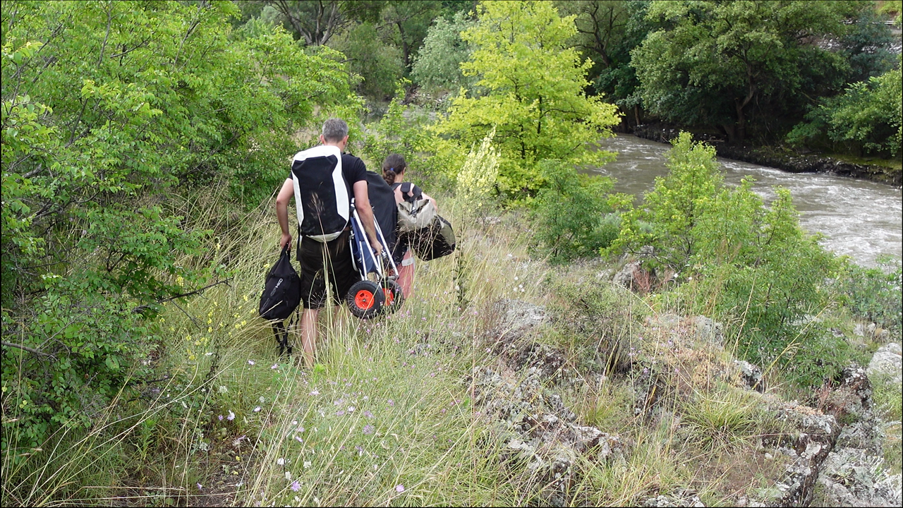 Inklusive Erkundungstour 400 Meter jeweils 4 mal hin und zurück und das auf bergiger Strecke. Alleine das dauert schon seine Zeit. Die zahlreichen dornigen Sträucher machten uns das Leben auch nicht einfacher, ebenso wie der kurze heftige Regenschauer, der den ganzen Weg nass und glitschig werden ließ. Dazu dann das Gepäck ausladen, die Boote zusammenpacken und die Schlepperei.