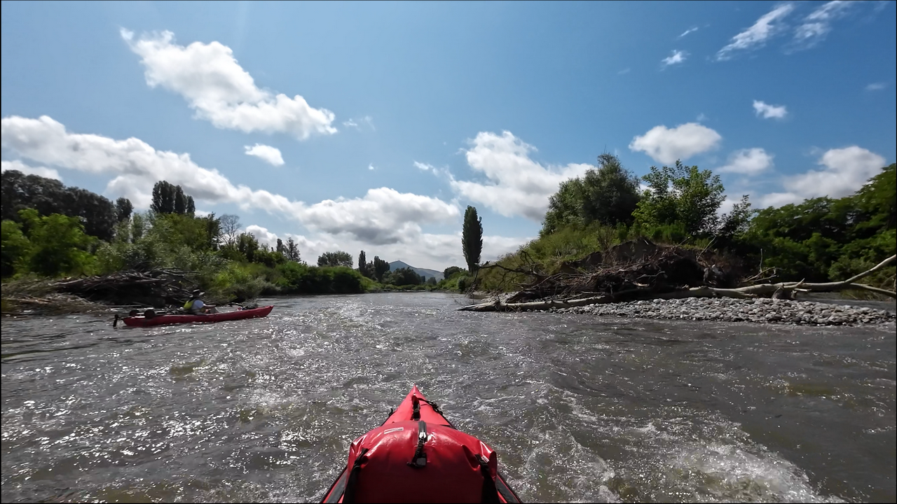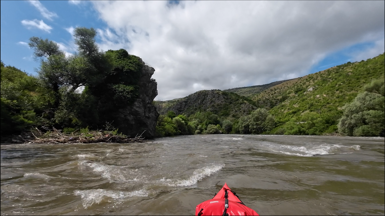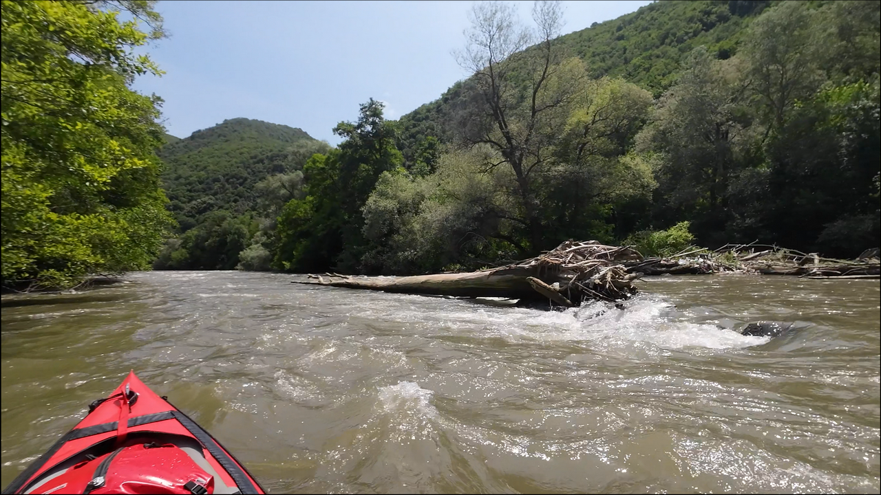 Endlich konnte die Reise also losgehen. Der Vardar hatte auf diesem Stück eine zügige Strömung, floss aber relativ ruhig daher. Ein erstes Baumhindernis verlangte ein wenig Aufmerksamkeit, konnte aber doch recht einfach umfahren werden.