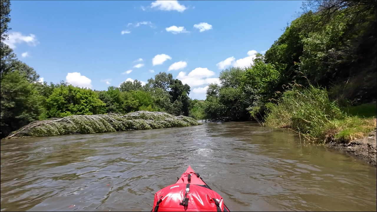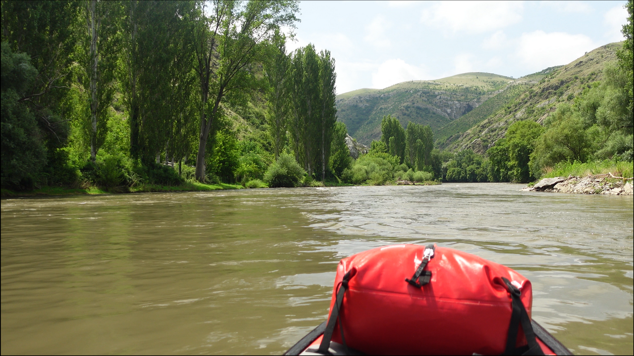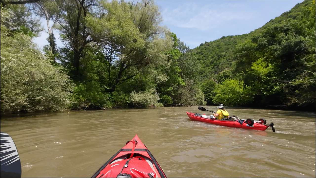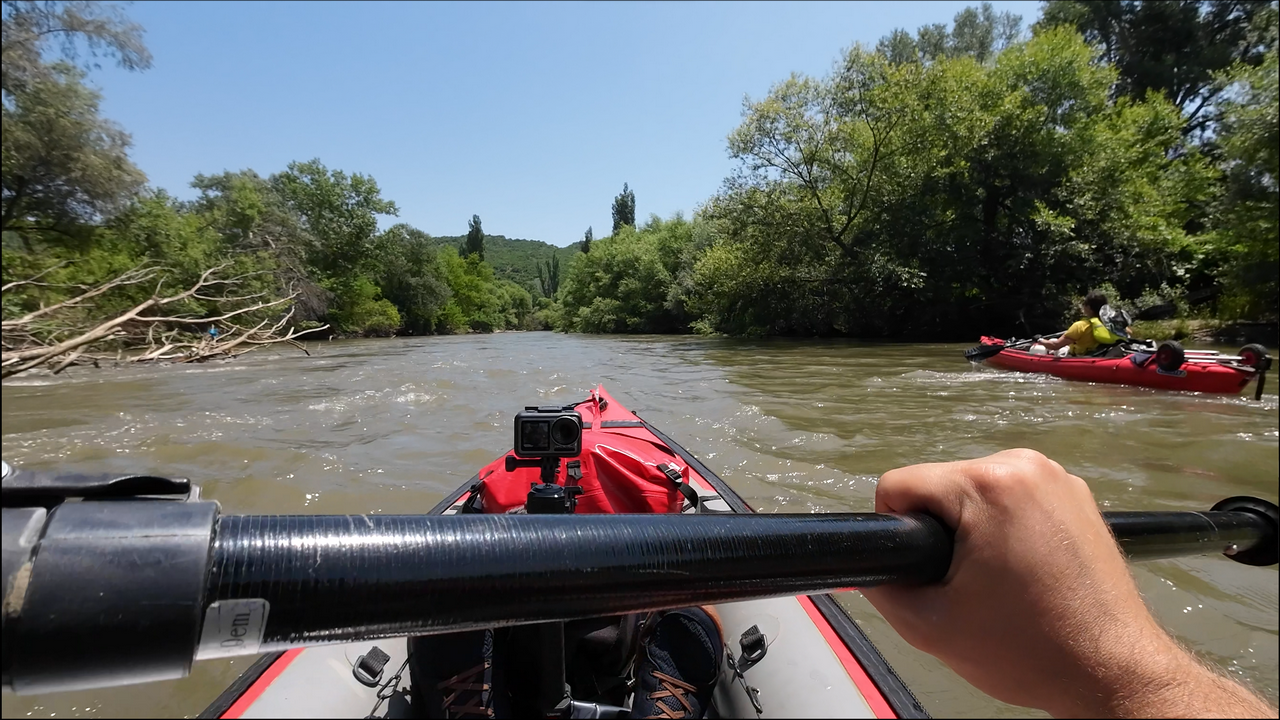 Endlich konnte die Reise also losgehen. Der Vardar hatte auf diesem Stück eine zügige Strömung, floss aber relativ ruhig daher. Ein erstes Baumhindernis verlangte ein wenig Aufmerksamkeit, konnte aber doch recht einfach umfahren werden.